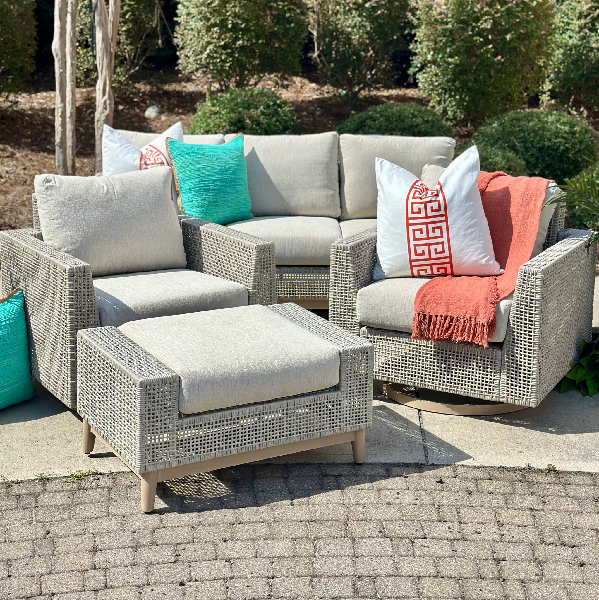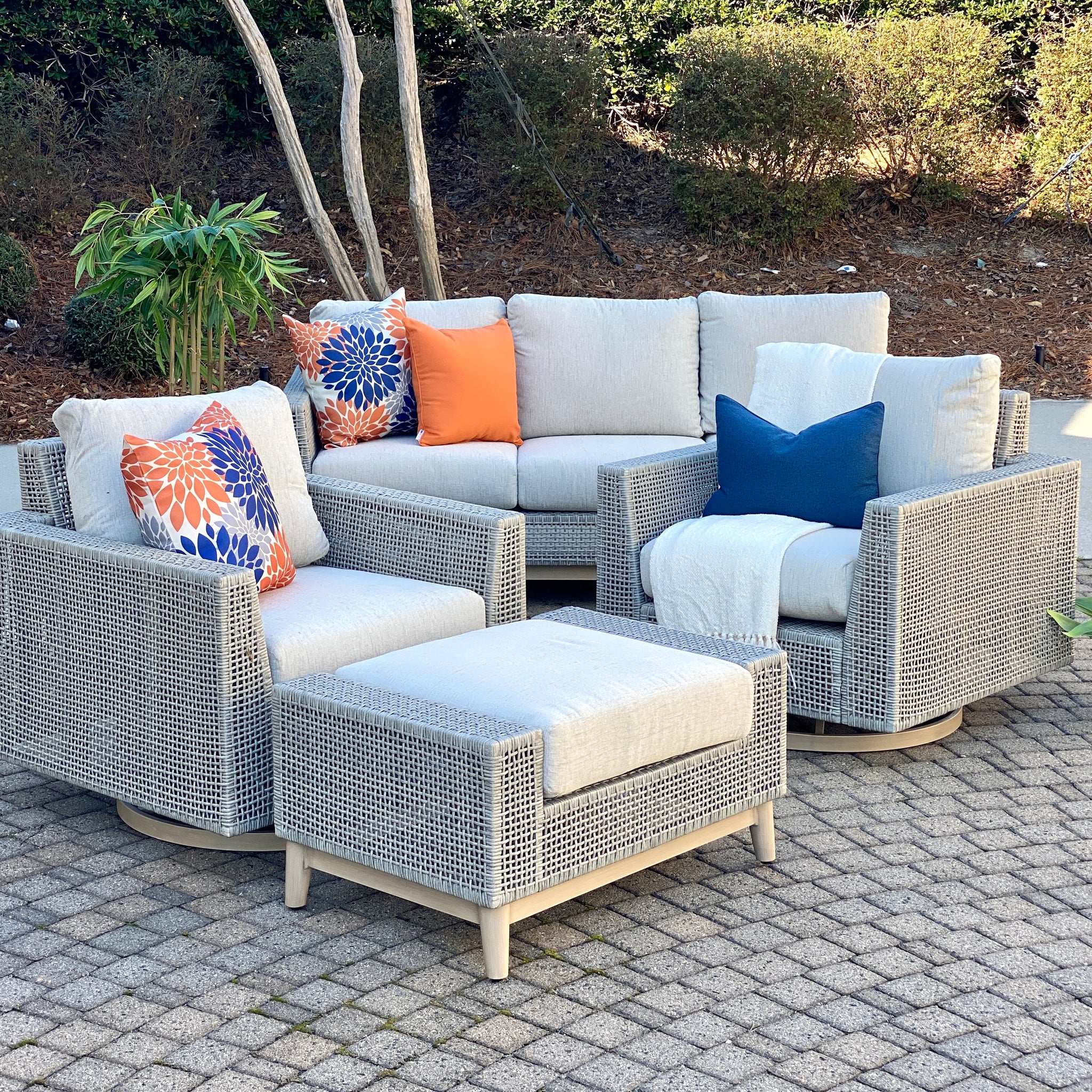 Freshen up your outdoor space with casual styling. This light beige resin wicker swivel chair features high performance fabric cushions and a 'wood look' finish base. BRAND NEW.