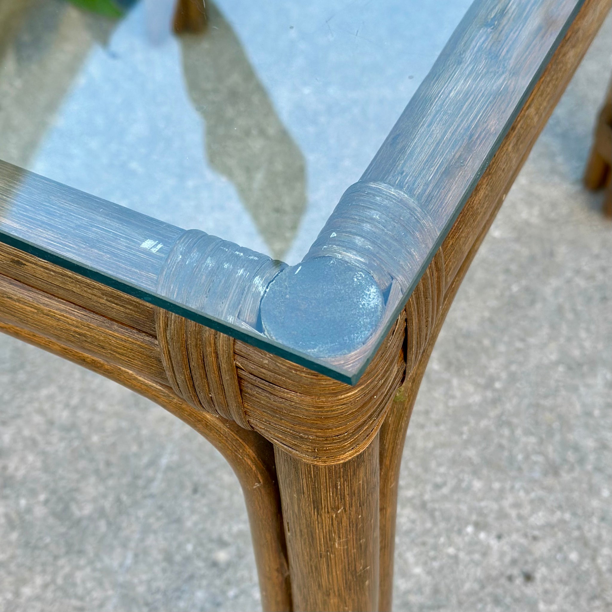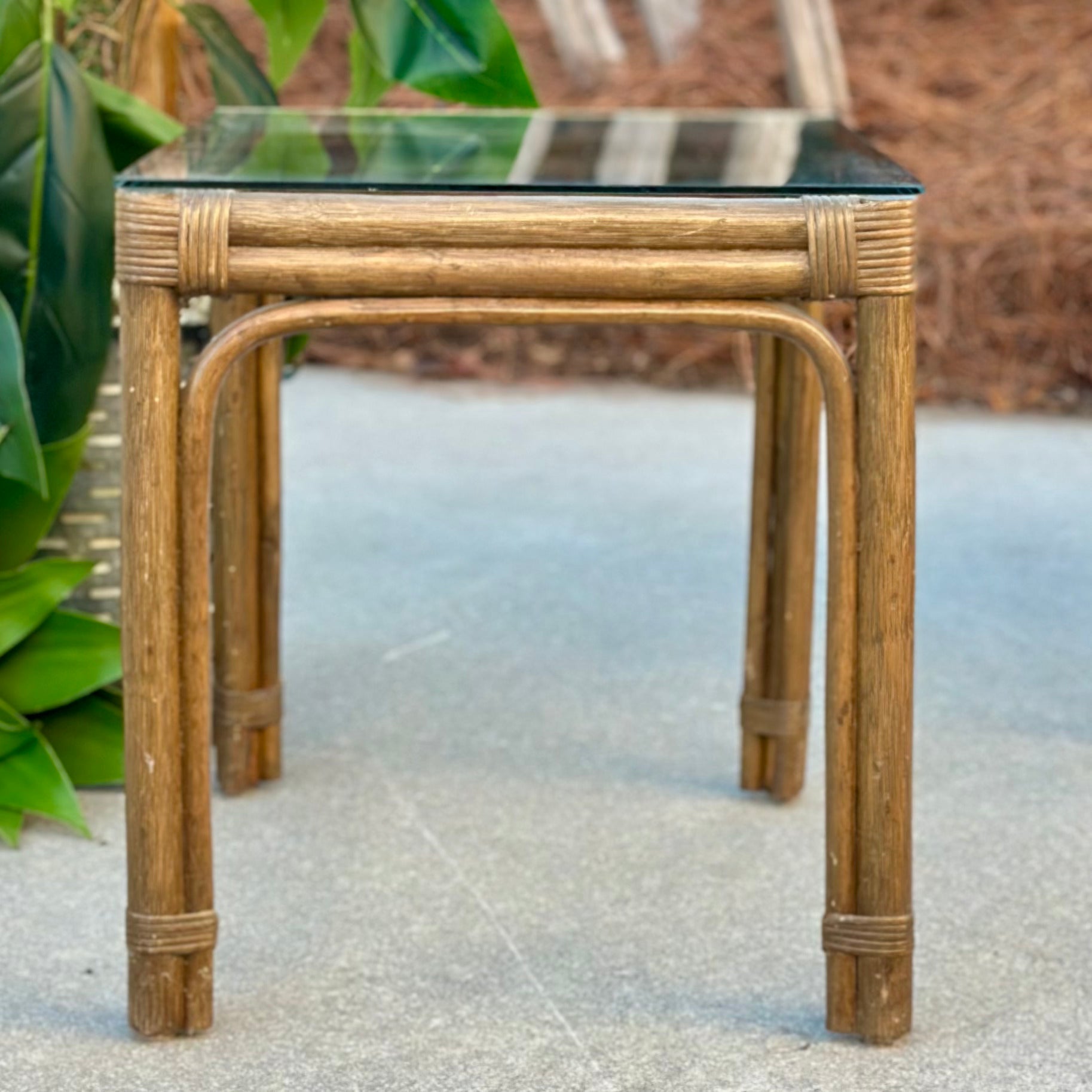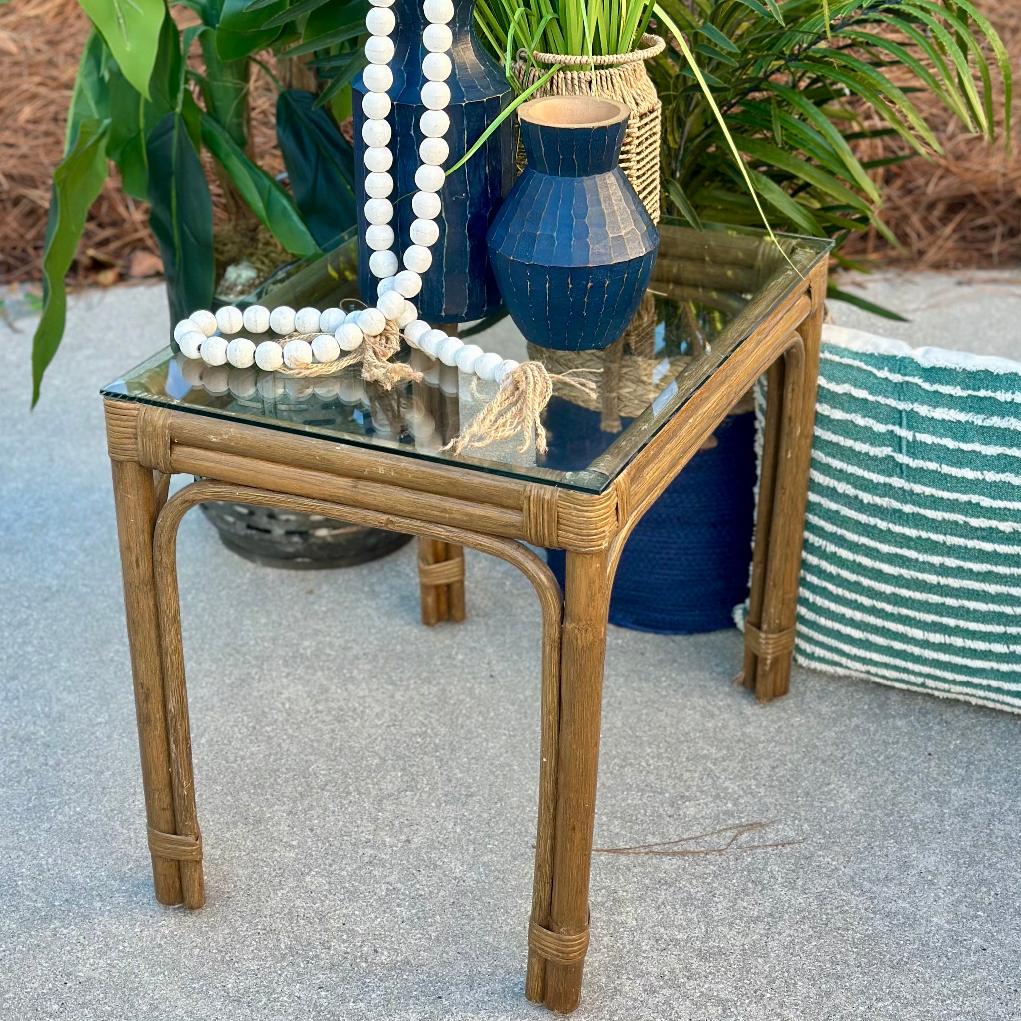 Quality rattan end table by Ayers; on consignment with some fading and in otherwise good condition. Recommended for cover use only.