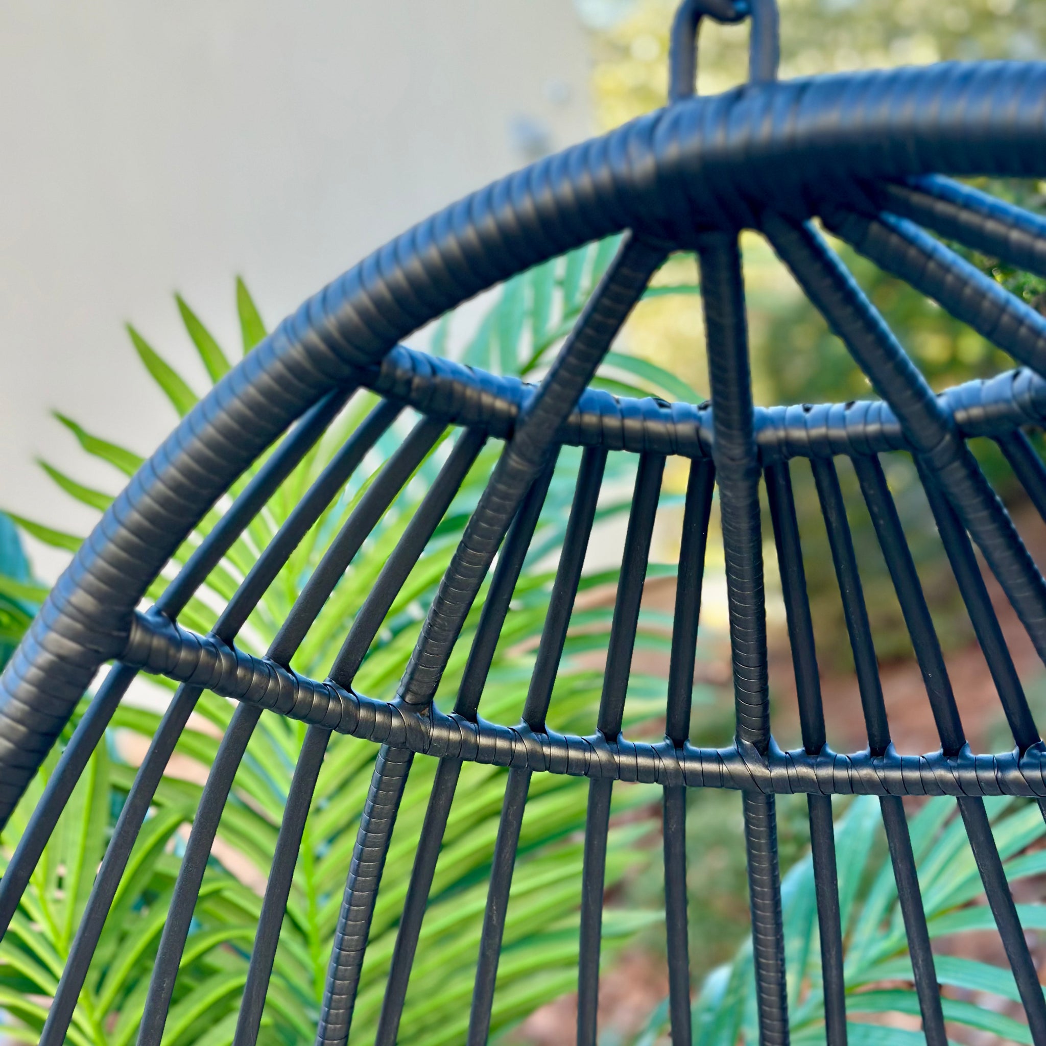 Super cute outdoor egg chair featuring a steele frame with wrapped resin wicker in black. Just in and brand new!