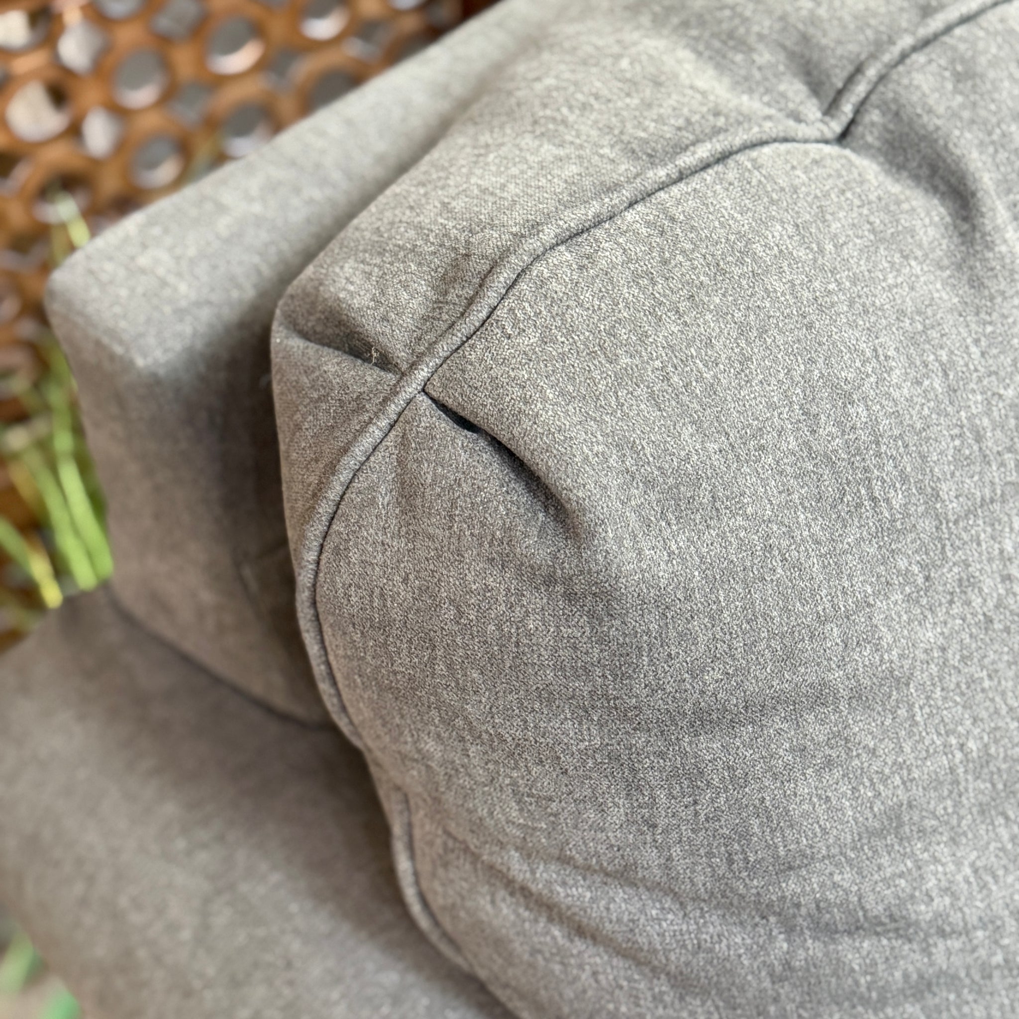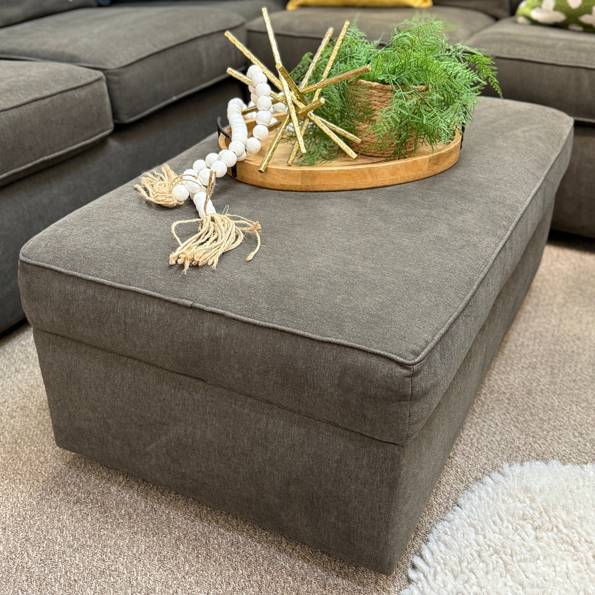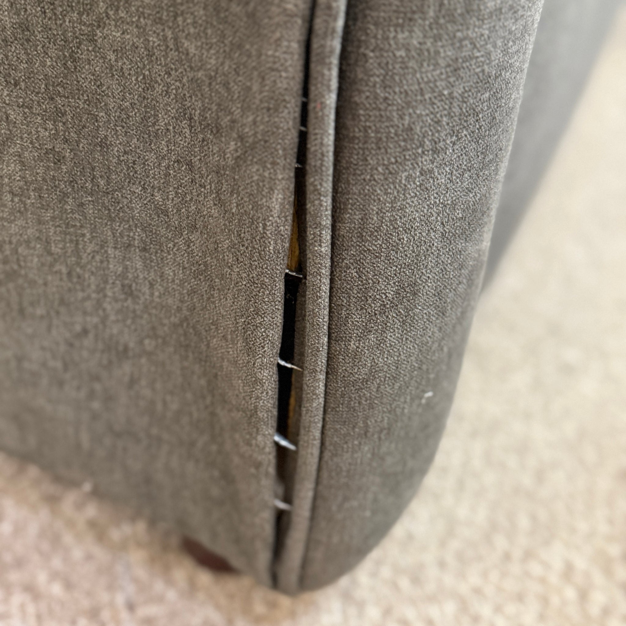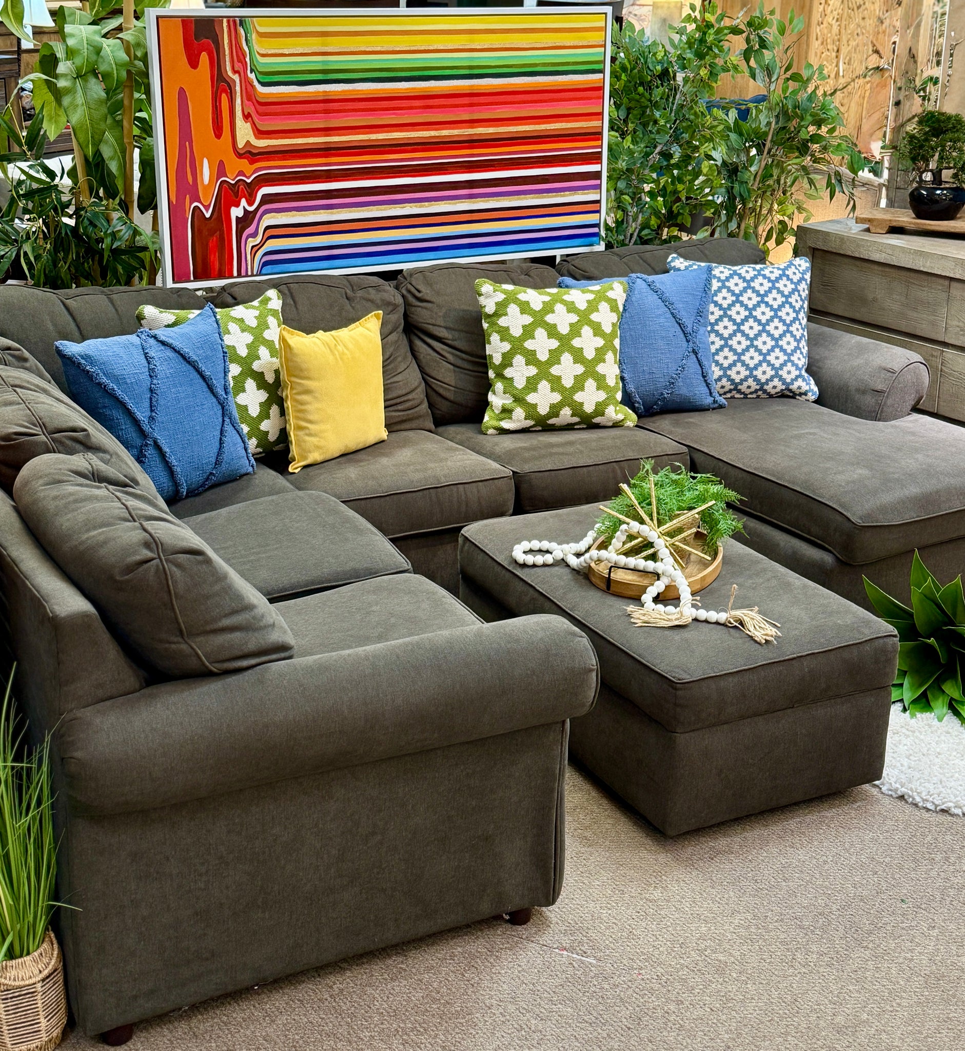 Get comfy with this 6 piece sectional. Features a casual look with a charcoal grey fabric. Includes matching ottoman. On consignment with some wear and stitching issues, otherwise in good condition!