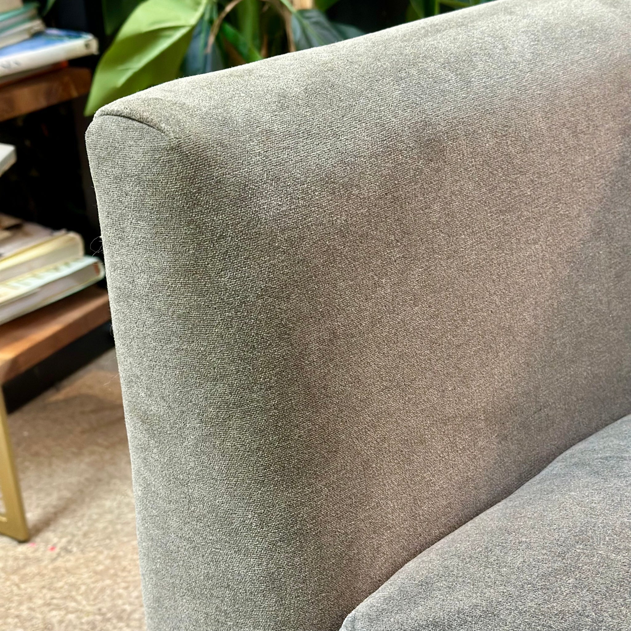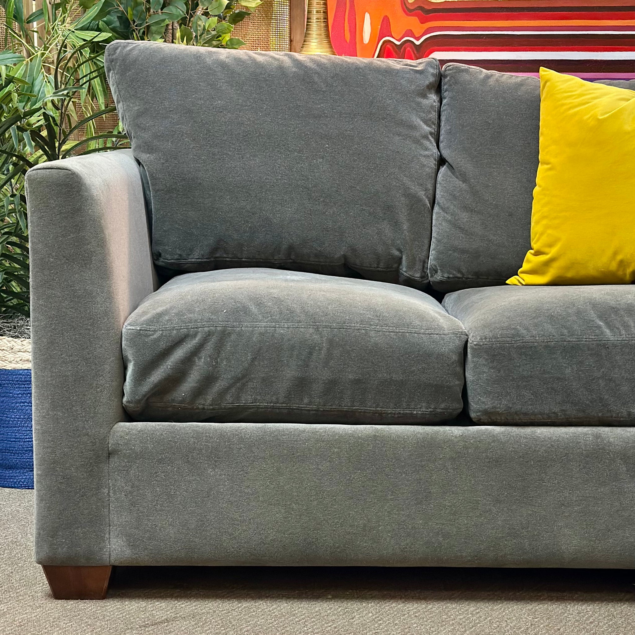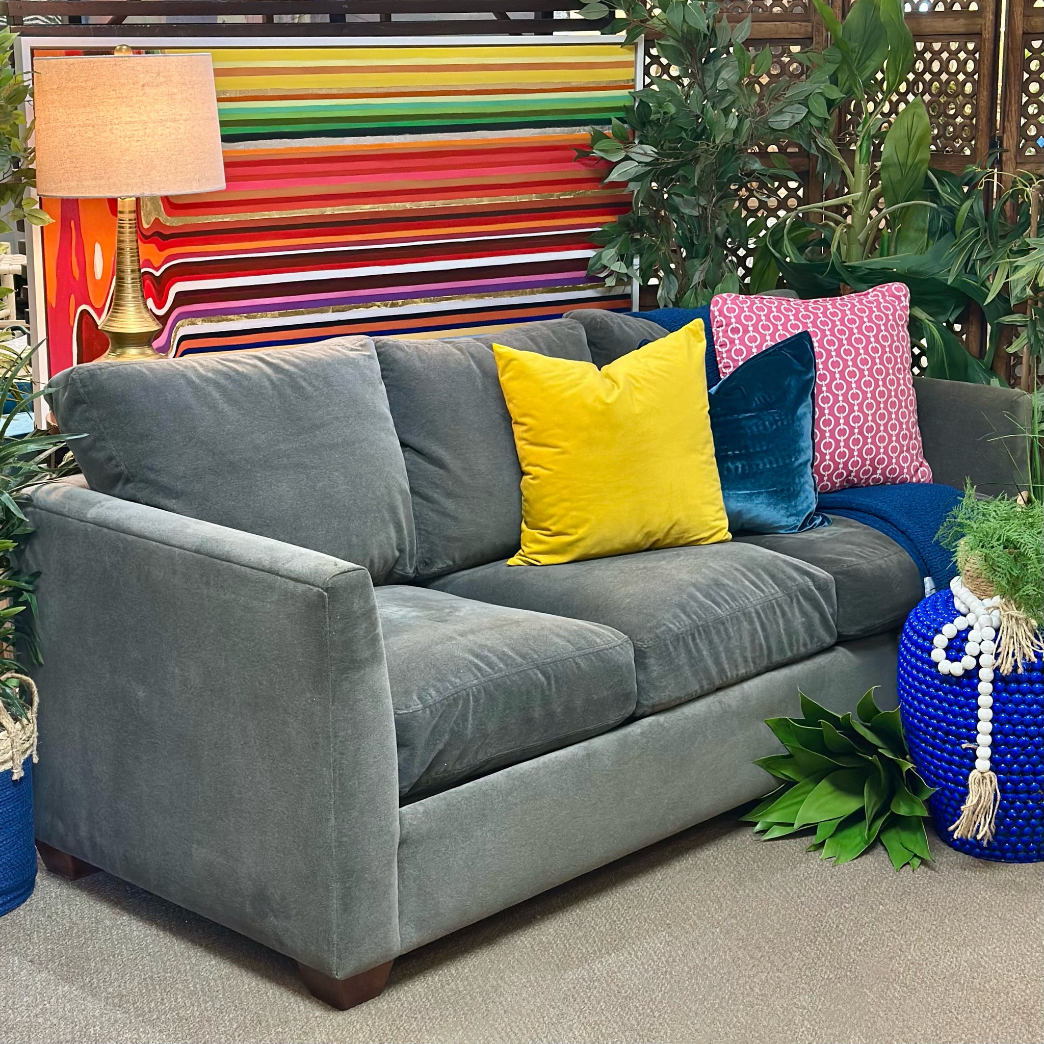 Add this handsome sleeper sofa to your living room, spare bedroom, or home office. Features track arms and a soft charcoal upholstery. In great condition. Does not include mattress. Retails for $3700+, our price less!