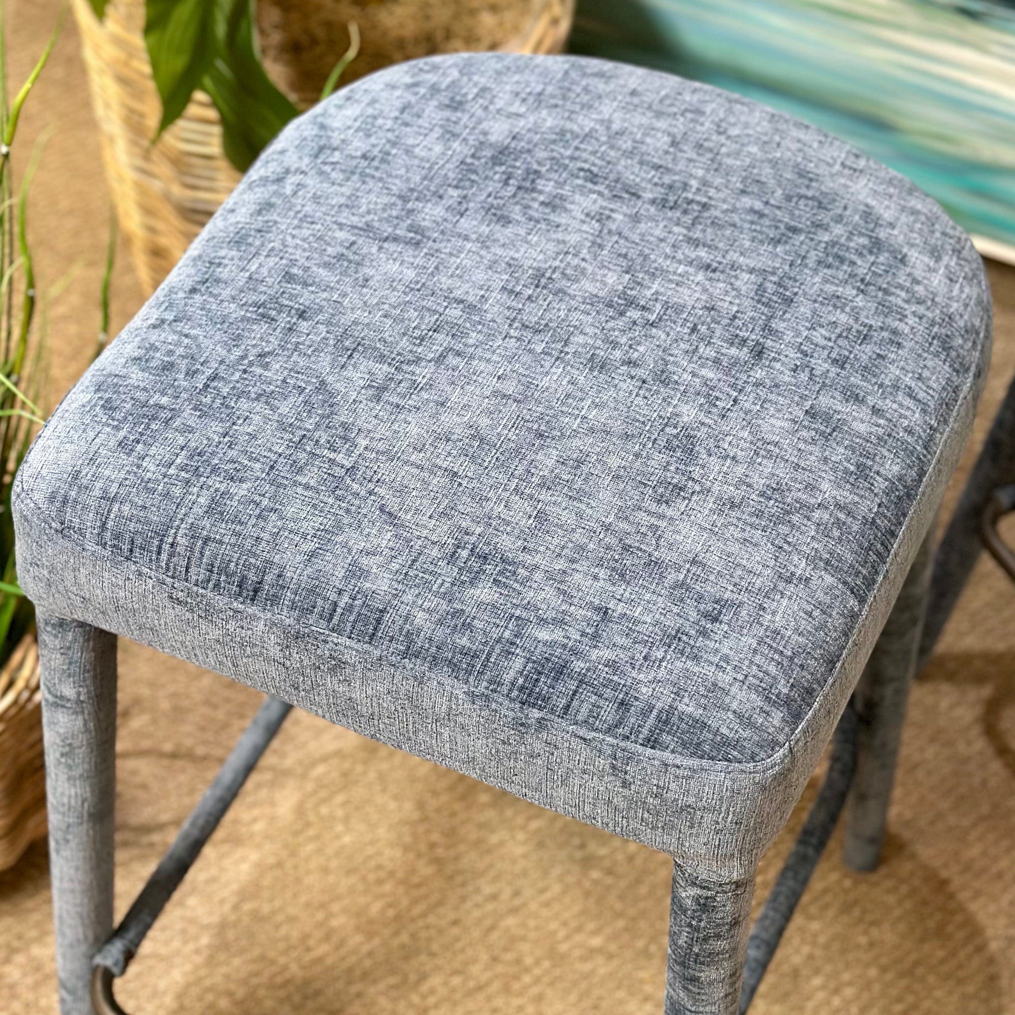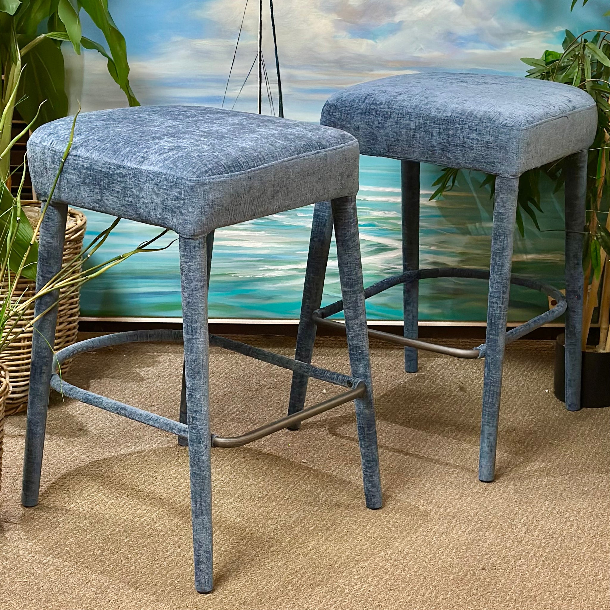 Gorgeous backless counter stool in a blue chenille fabric down to the legs!