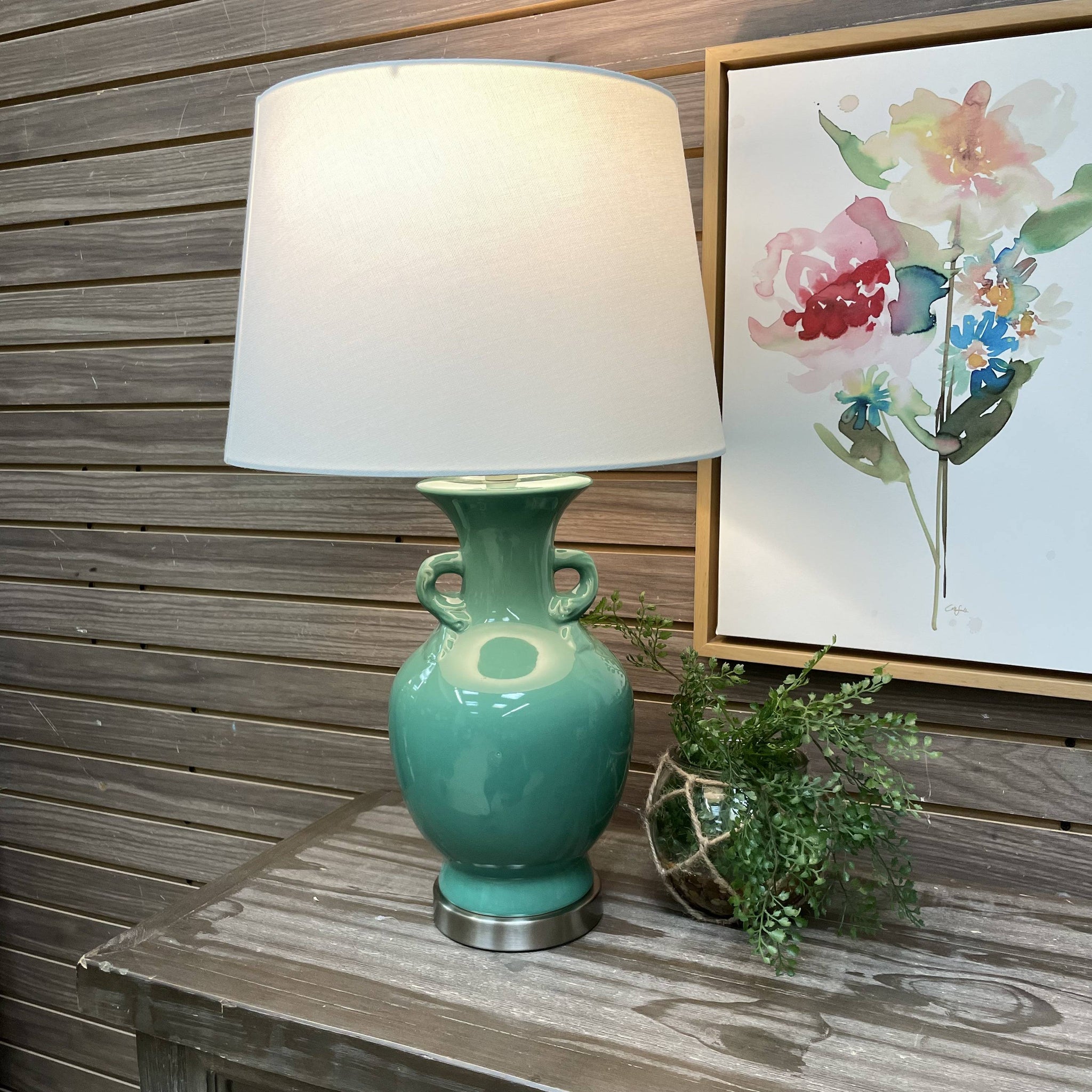 Add a subtle pop of color to your space using this green accent lamp with white shade!