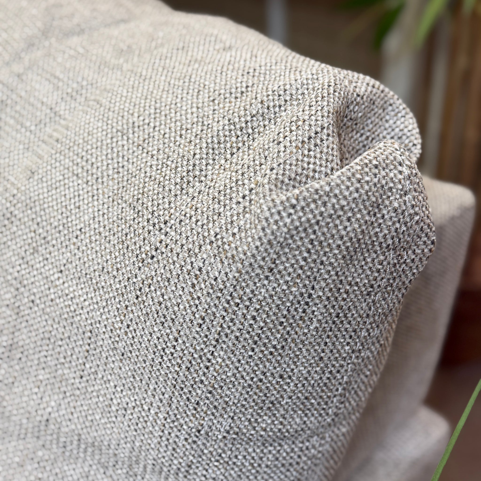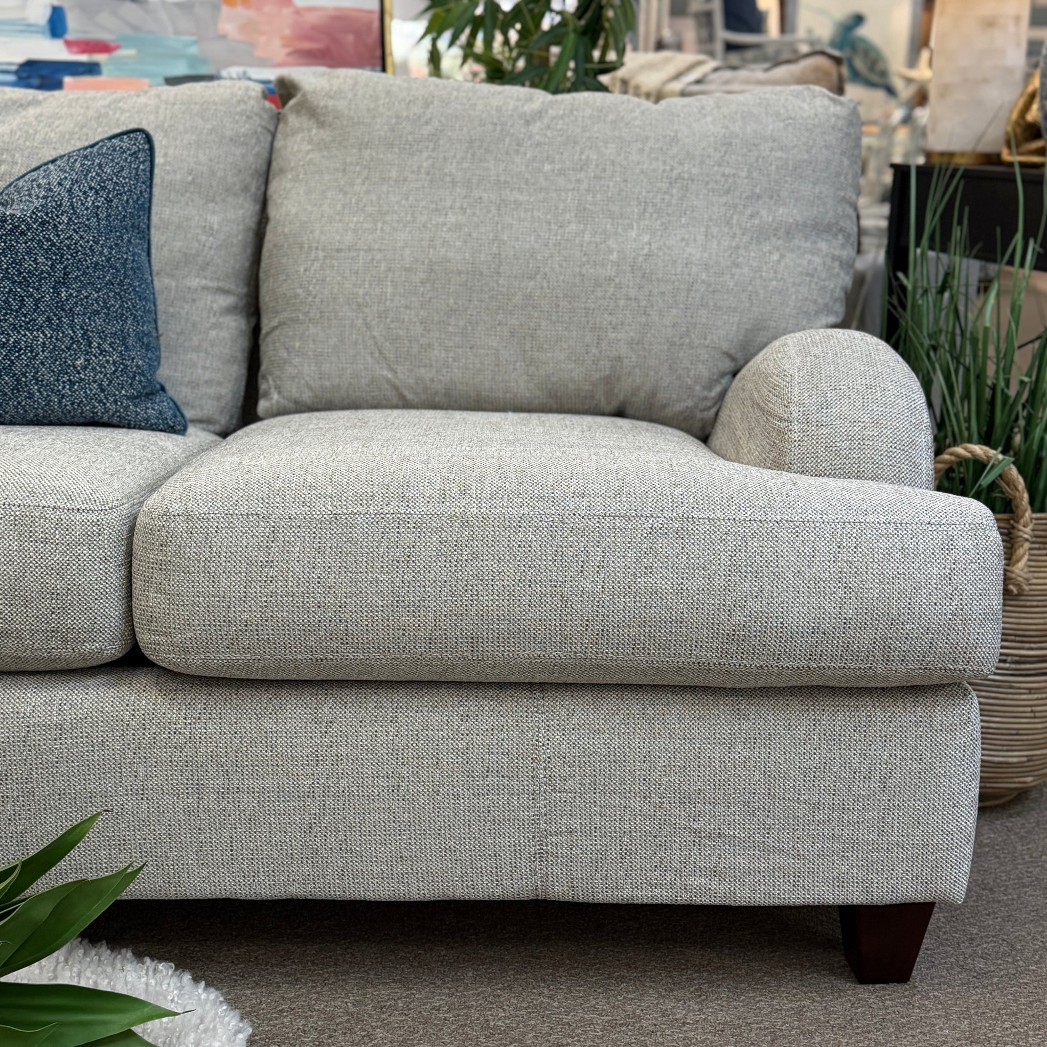 Upgrade your living room with this lovely sofa. Features loose back cushions, gel blended foam seating, solid wood legs, and a lake beige/grey upholstery. Brand new!