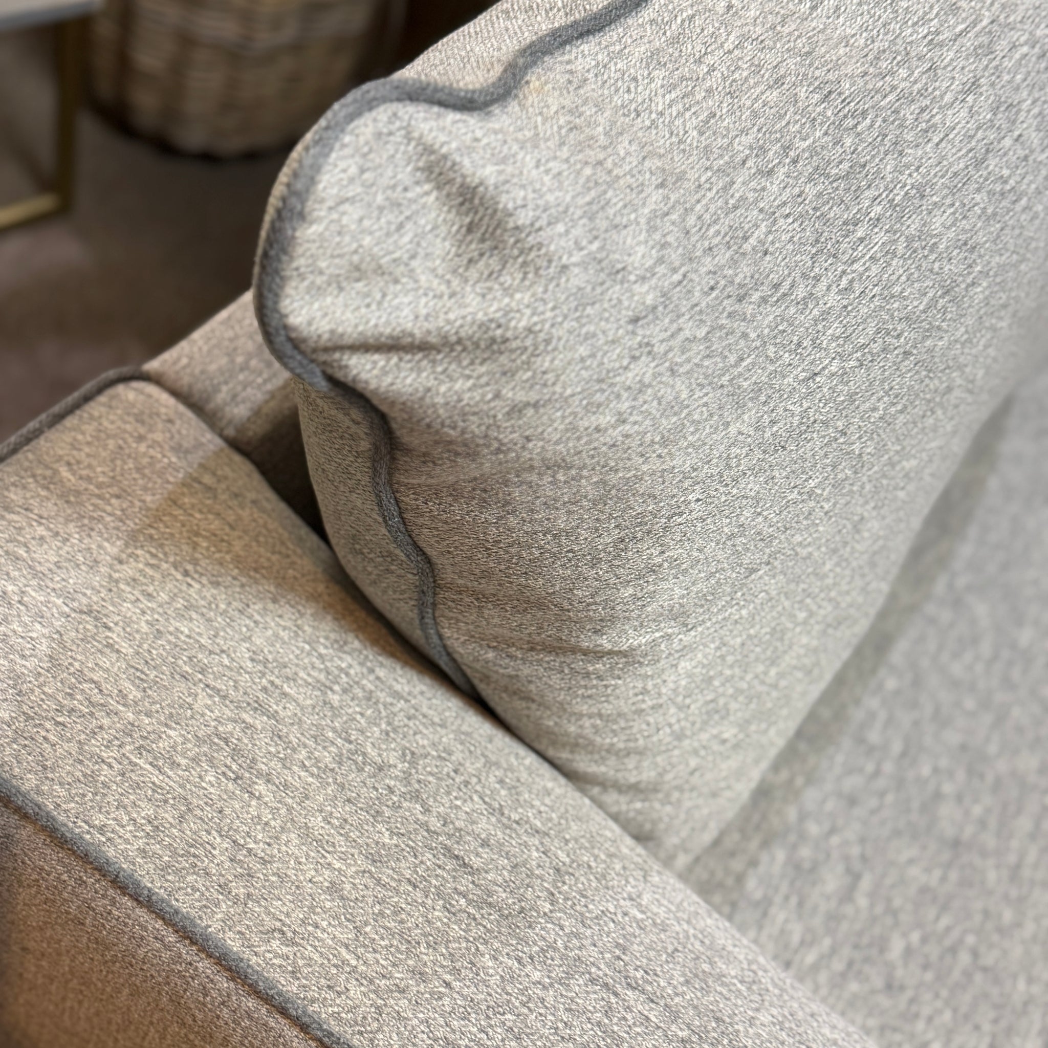 Get comfy with this beautiful 2 piece chofa in a soft grey fabric. Features slight flared arms and a contrasting welt. On consignment and in great condition!