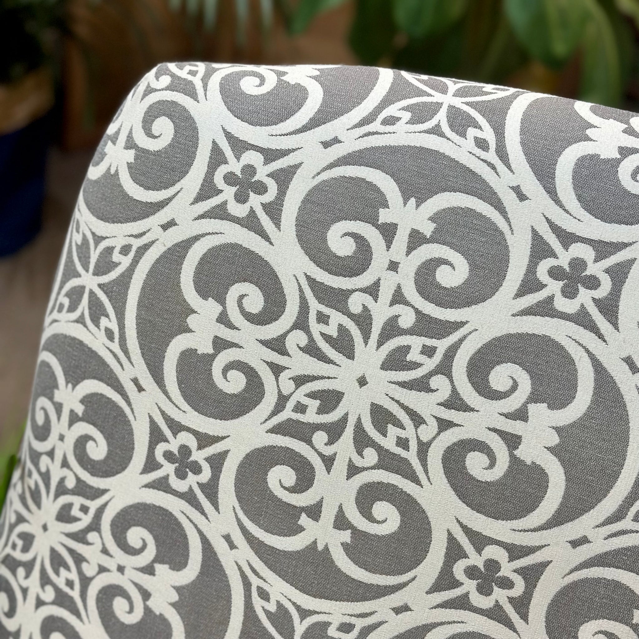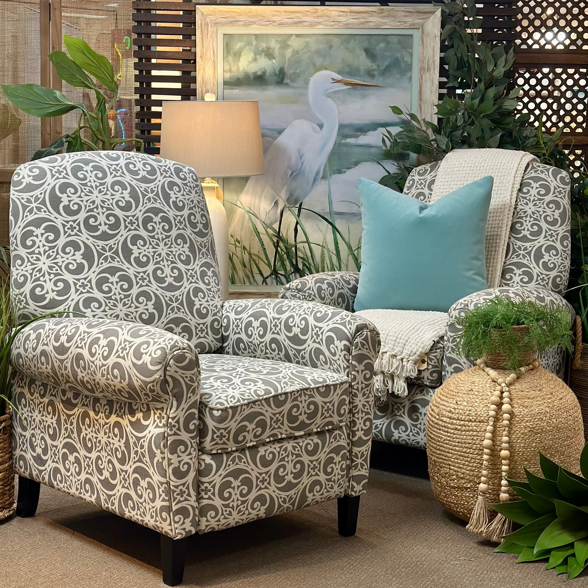 Transitional style recliner in a grey and white elegant print. Features a high camel back and rolled arms. On consignment with some minor stains, otherwise in good condition!