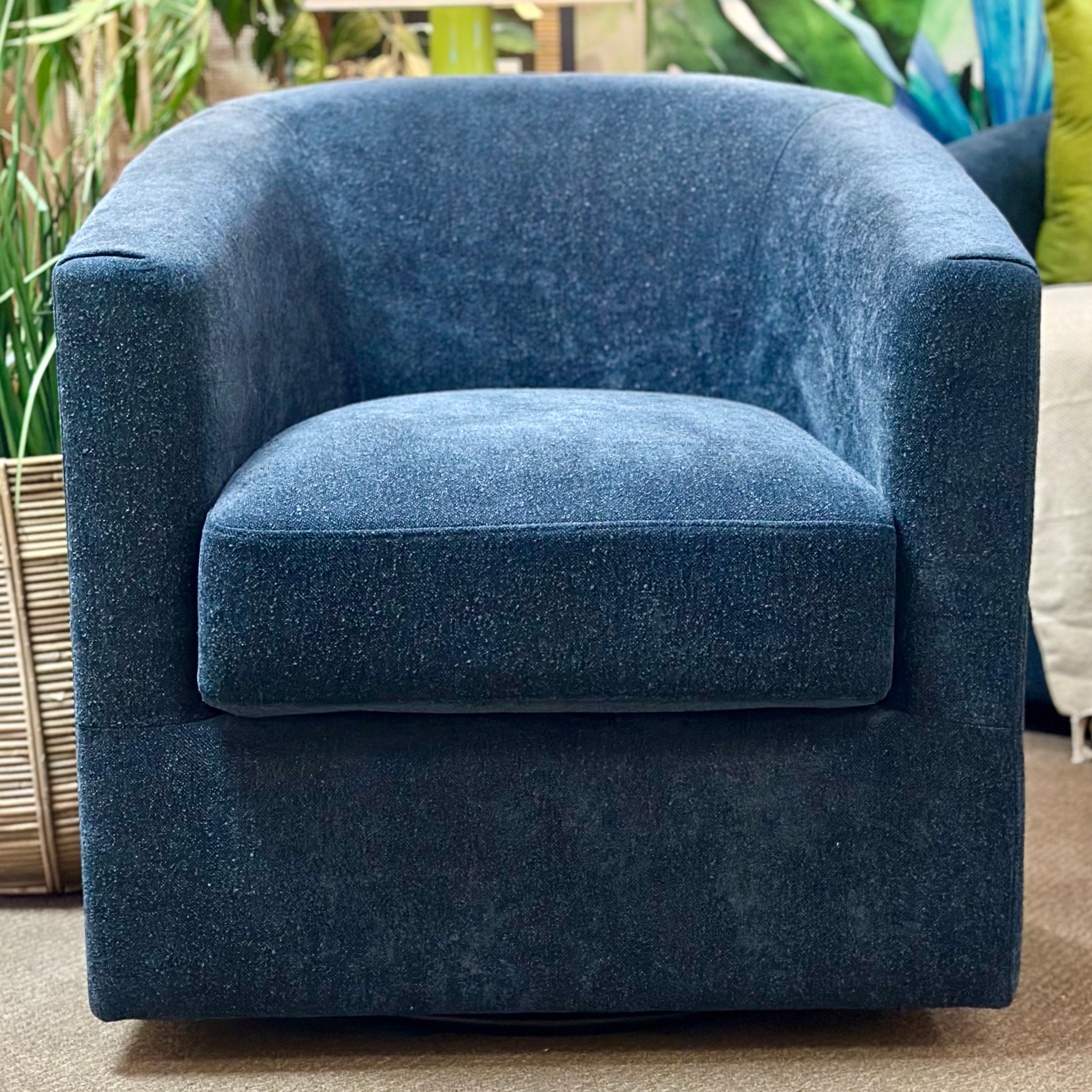 Elevate your home with this handsome swivel chair. Features a barrel shape style and a comfortable textured navy upholstery. Brand new!