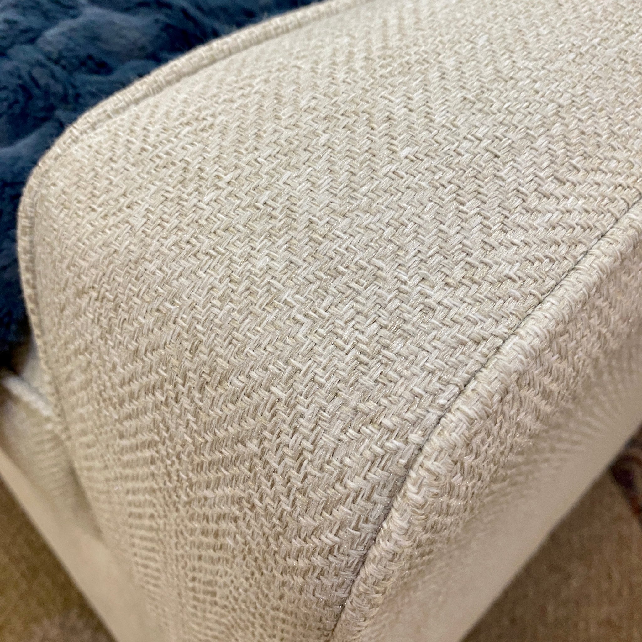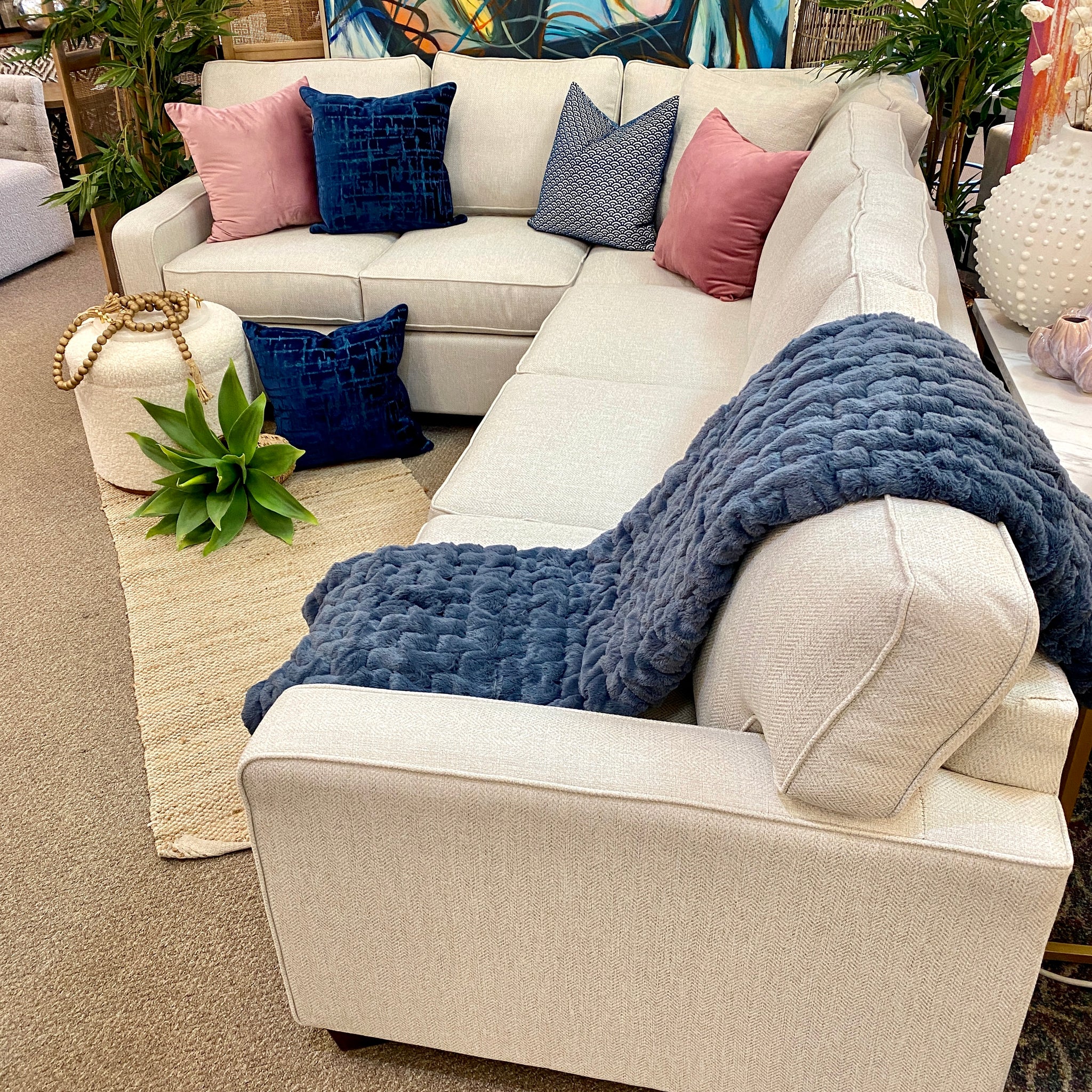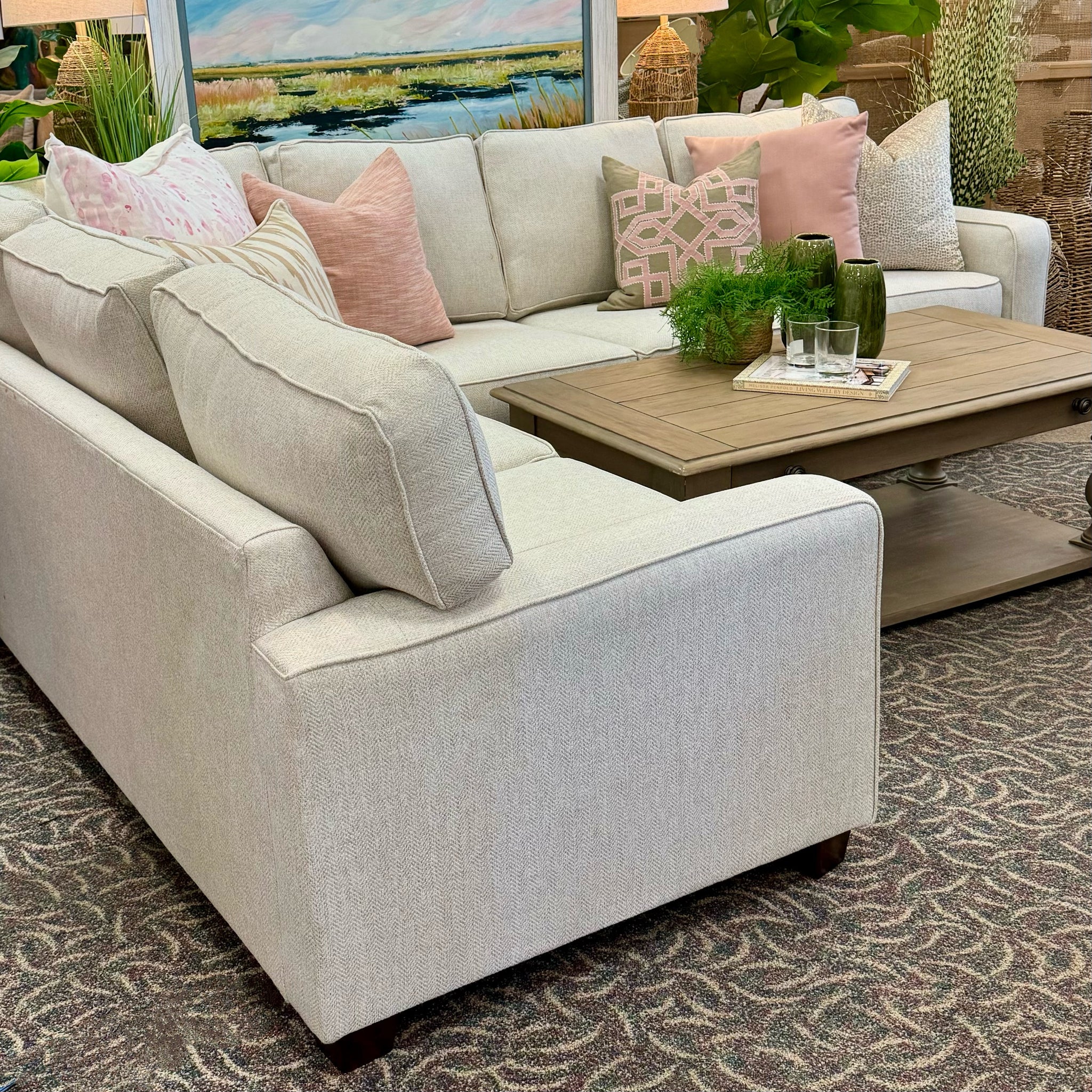 Made right here in NC! This quality two piece sectional features a hardwood frame and durable Revolution fabric upholstery in light beige. A great sectional for your coastal home! Brand New!