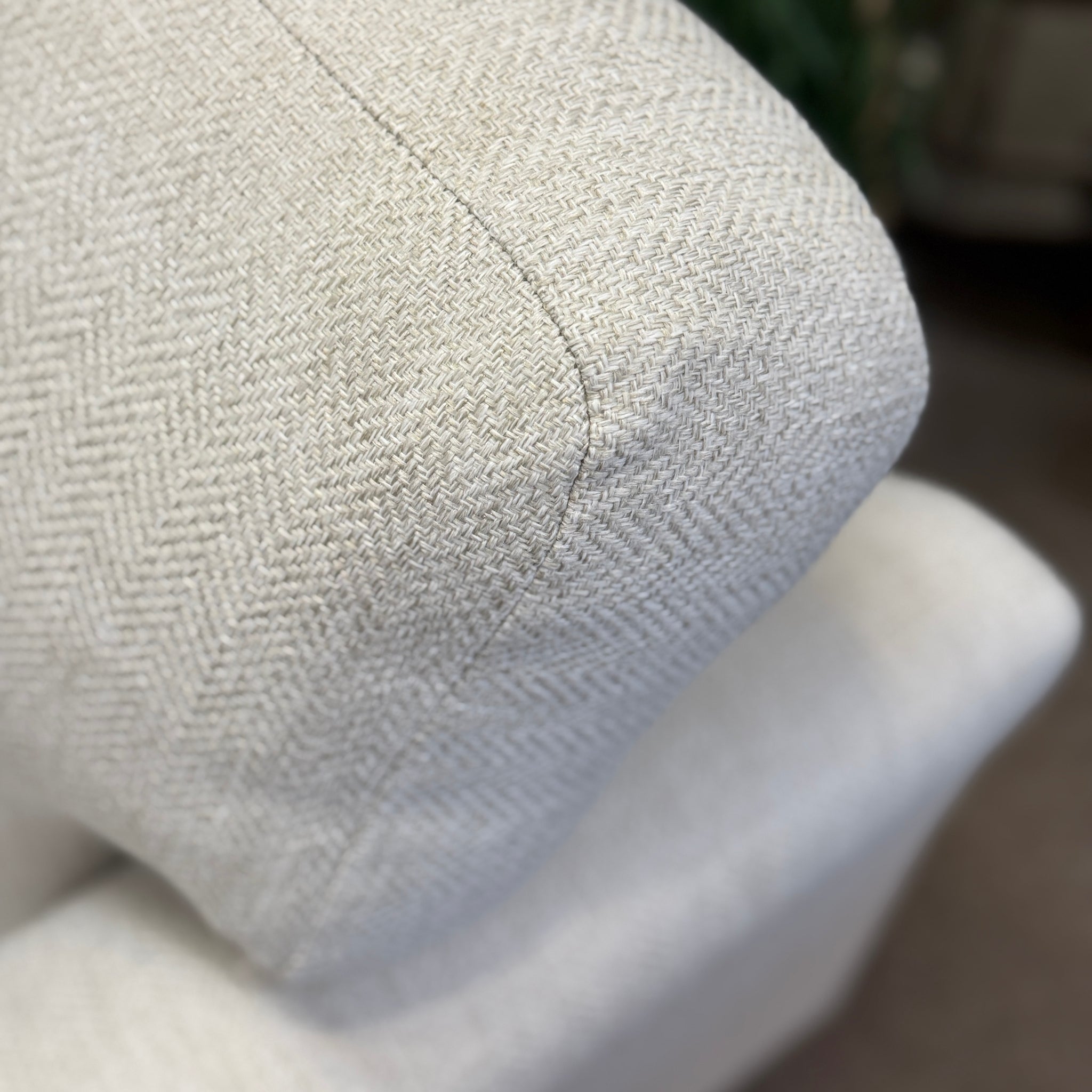 2PC sectional in a beautiful herringbone sticthed fabric in durable light taupe Revolution. Had transitional style frame with slight slope arms. Brand new!