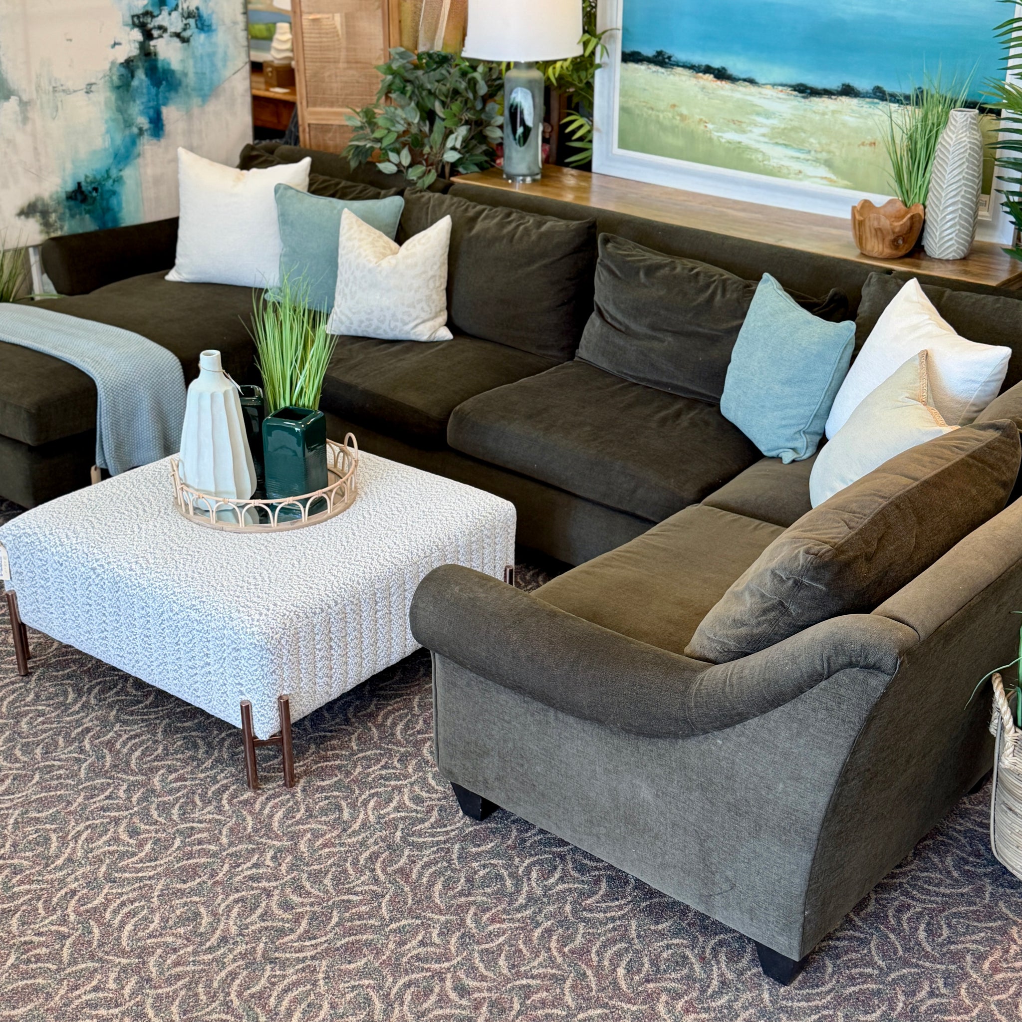 Elevate your living space with this stunning sectional from Arhaus. Features a velvet, forrest green fabric, a sloped frame and a rolled arms. Includes 8 decorative Arhaus pillows. On consignment and in good condition. Similar styles retail $6,000+, our price less!