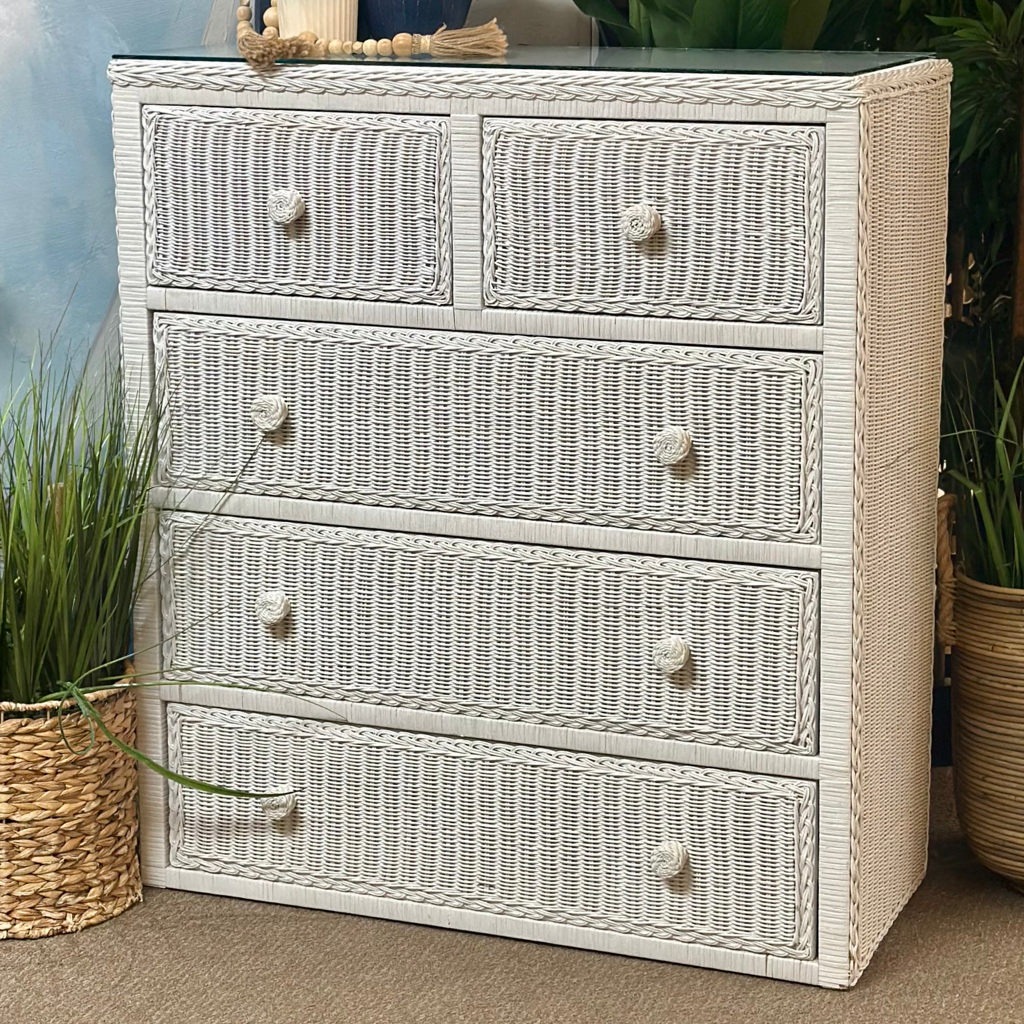 Coastal cottage style tall dresser with 5 drawers and a white wicker frame. On consignment and in good condition!