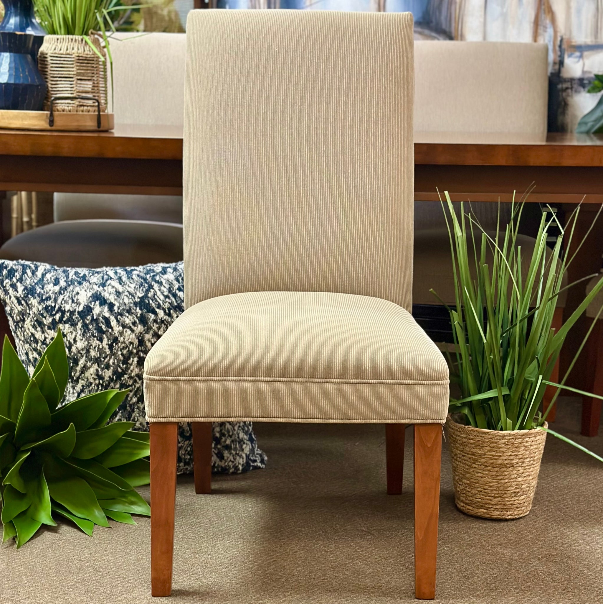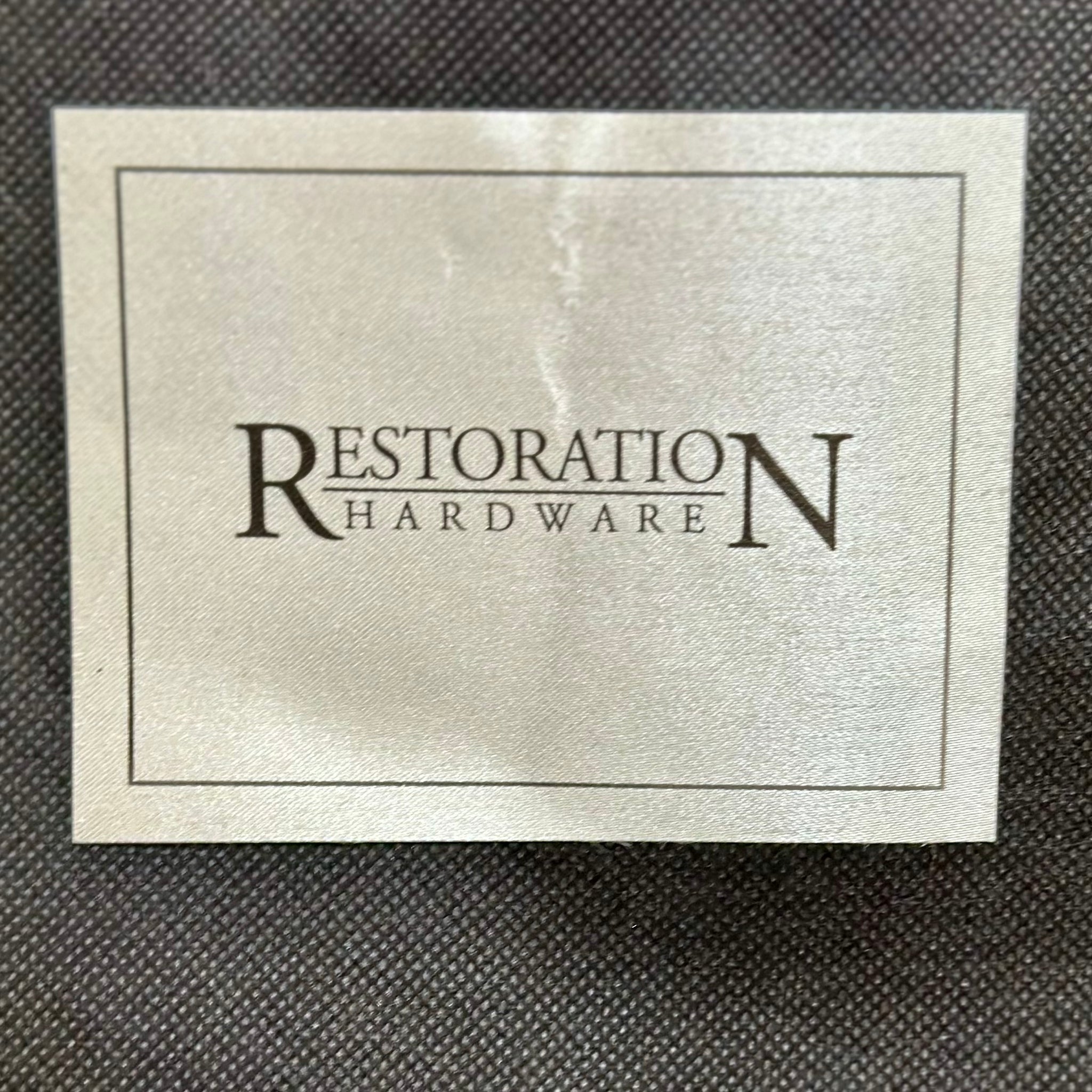 Upgrade your dining room with this handsome dining set by Restoration Hardware. Features a farmhouse look dining table in a warm wood finish, and eight dining chairs in a textured grey/green upholstery. In great condition. Similar sets retail for $4500+, our price less!