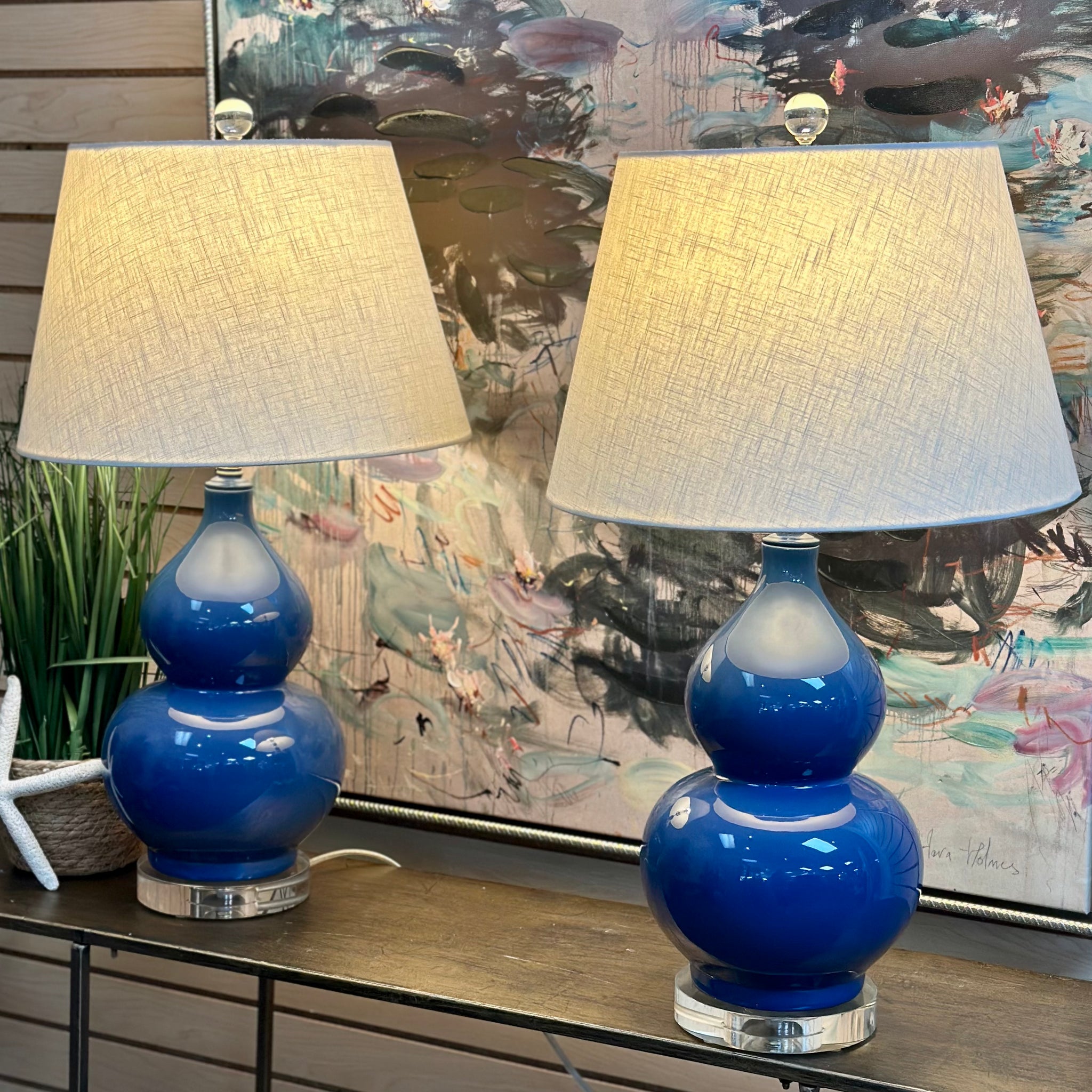 Stylish blue gourd lamp with acrylic base and soft beige shade. On consignment and in excellent condition!