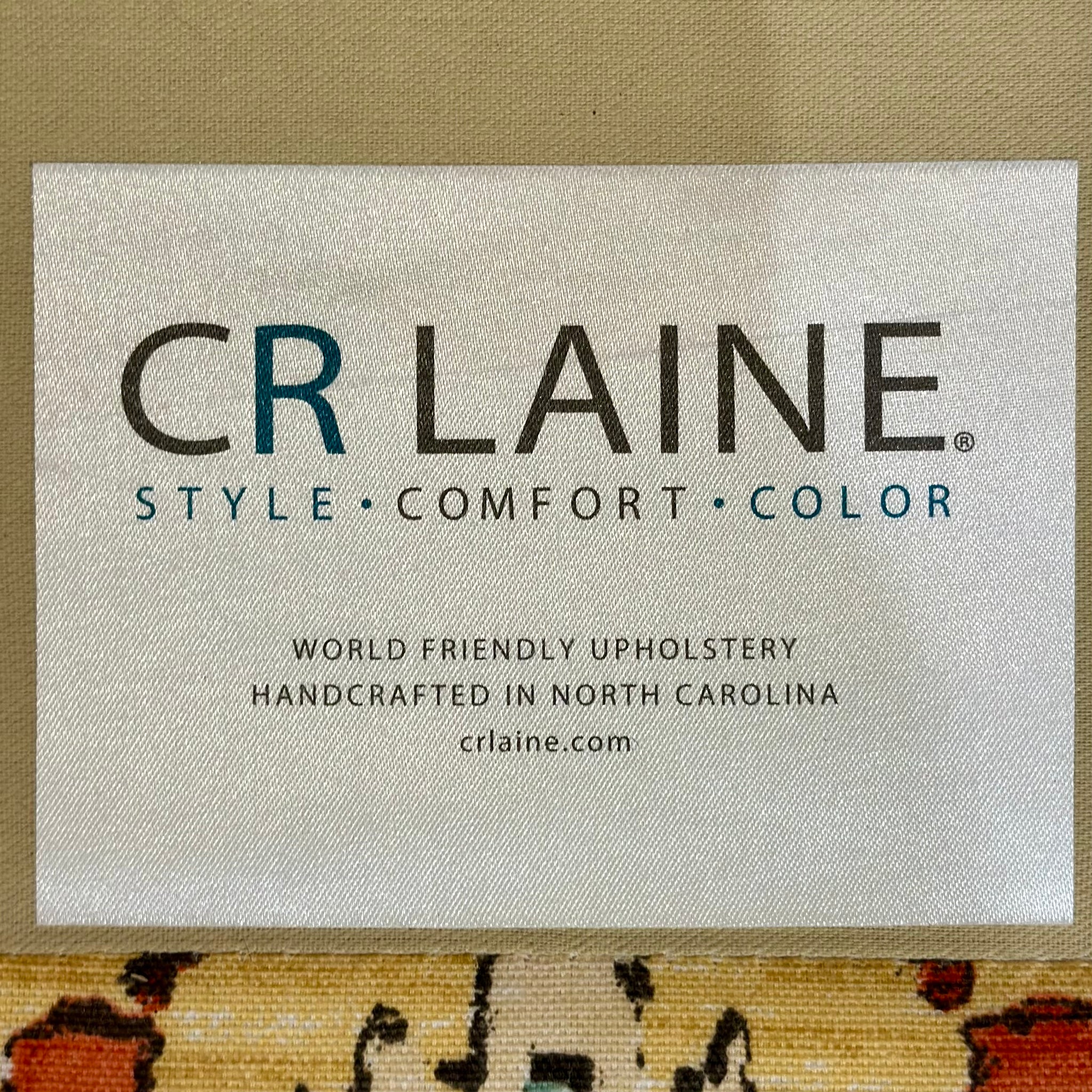 From quality manufacturer CR Laine, this swivel chair features an orange and aqua motif print. Some minor staining, otherwise in good condition! Retails $2,000+, our price less!