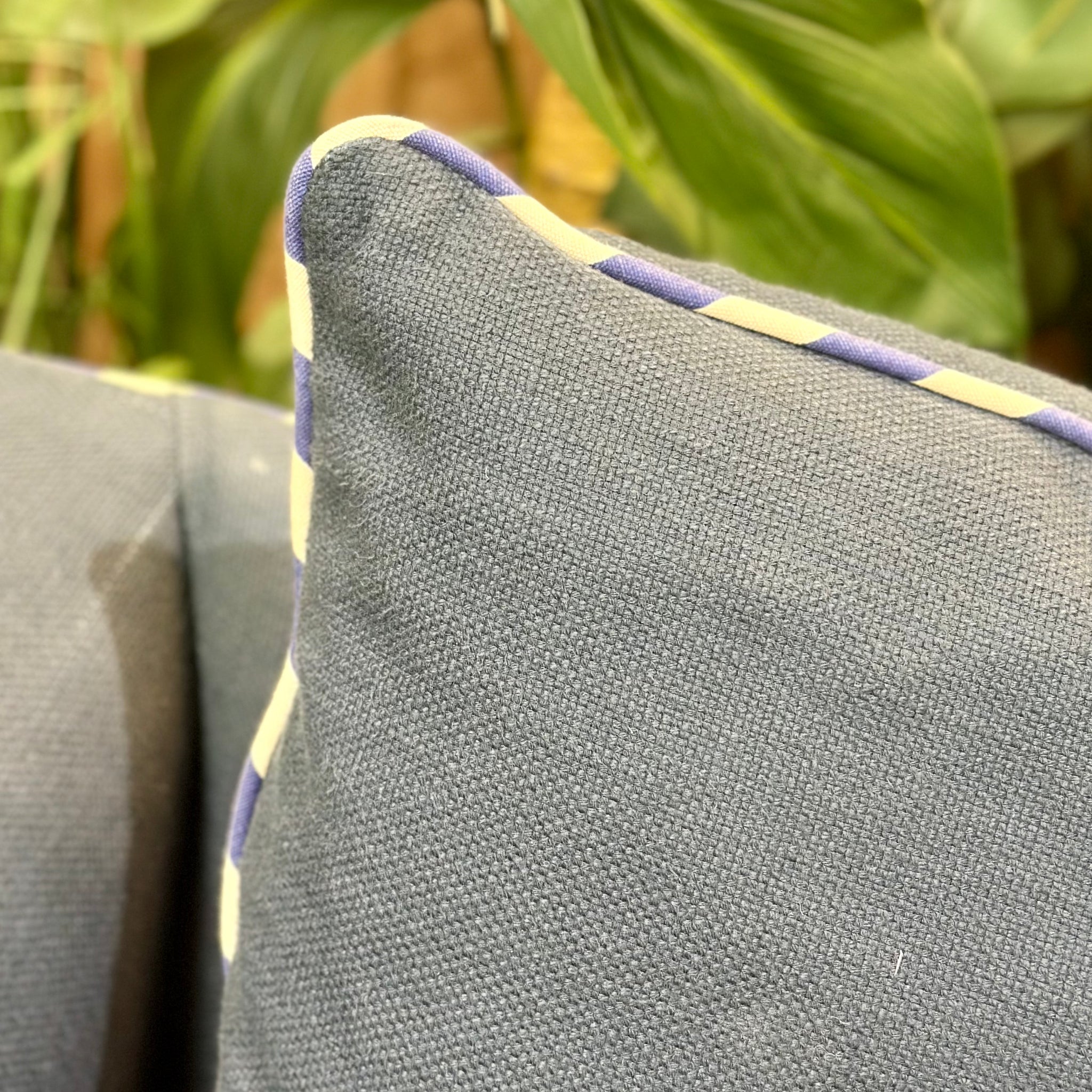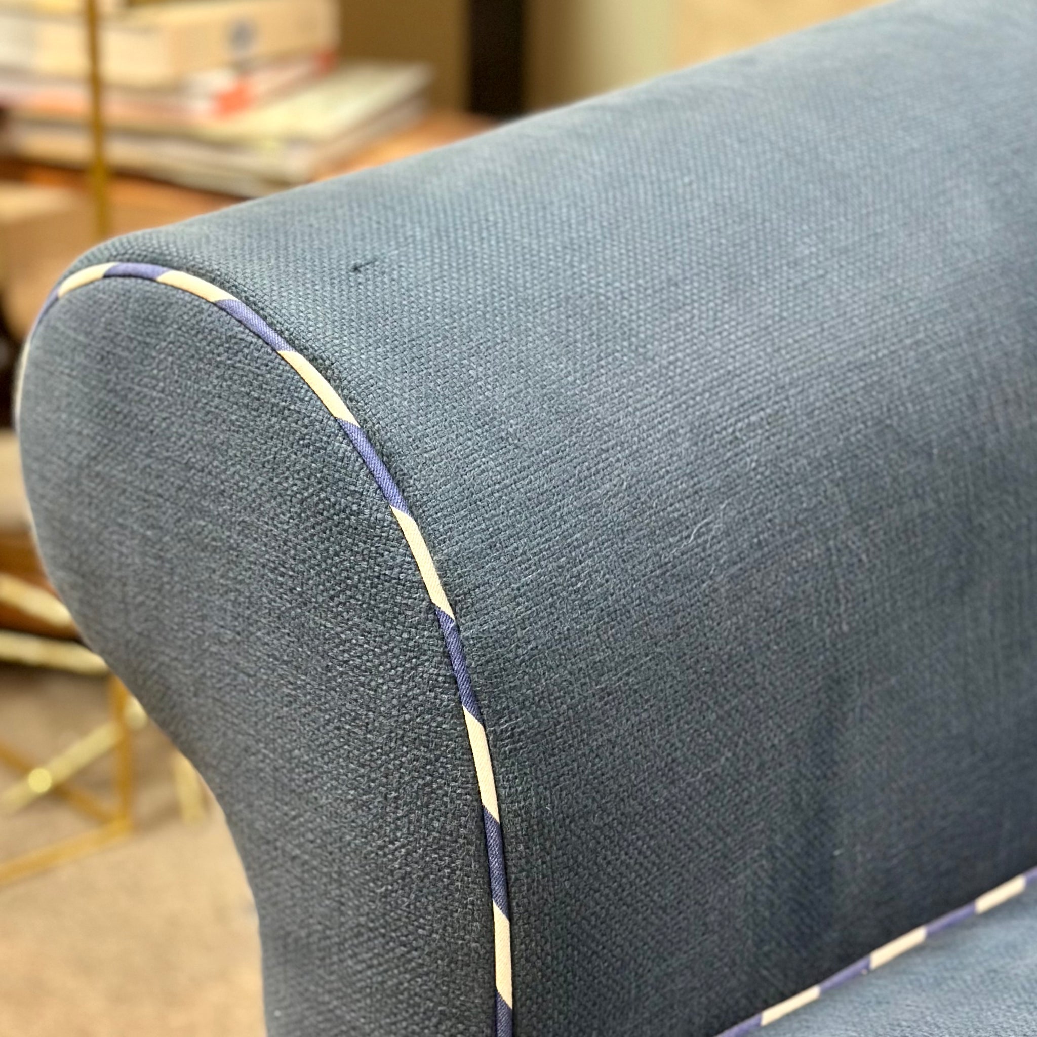 Add this handsome Crate & Barrel sofa to your living room. Features rolled arms, detached cushions, and a custom blue upholstery with blue/white striped piping. Includes two matching pillows and two fish pillows. In good condition with some staining and wear consistent with use.
