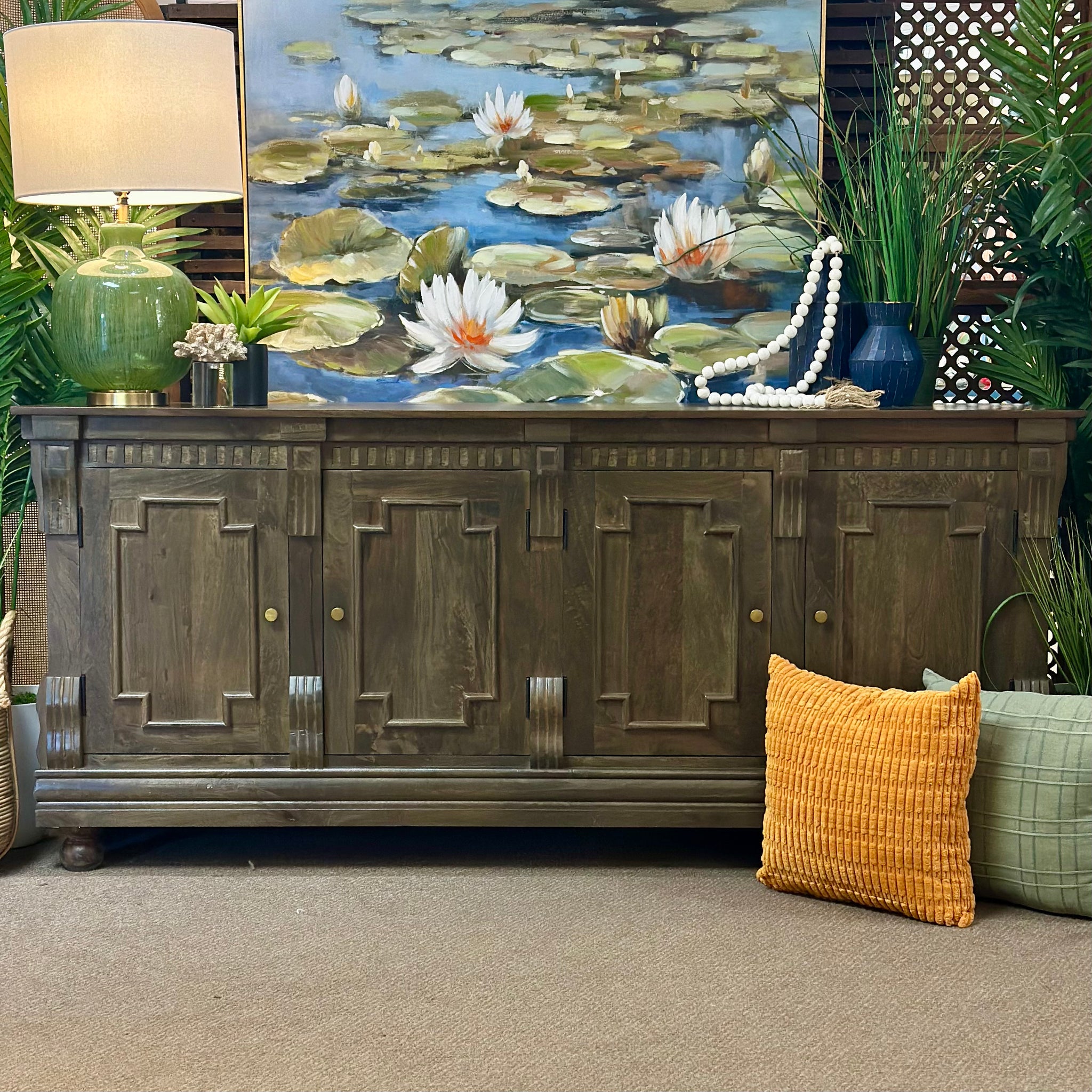 Elegant style cabinet in a rich, mocha finish wood and ornate molding that exude sophistication. Brand new!
