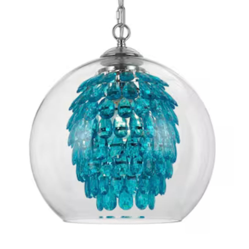 Dress up your space with this elegant chandelier. Features Turquoise crystals in side a clear glass globe. In great condition. Retails for $168, our price less!