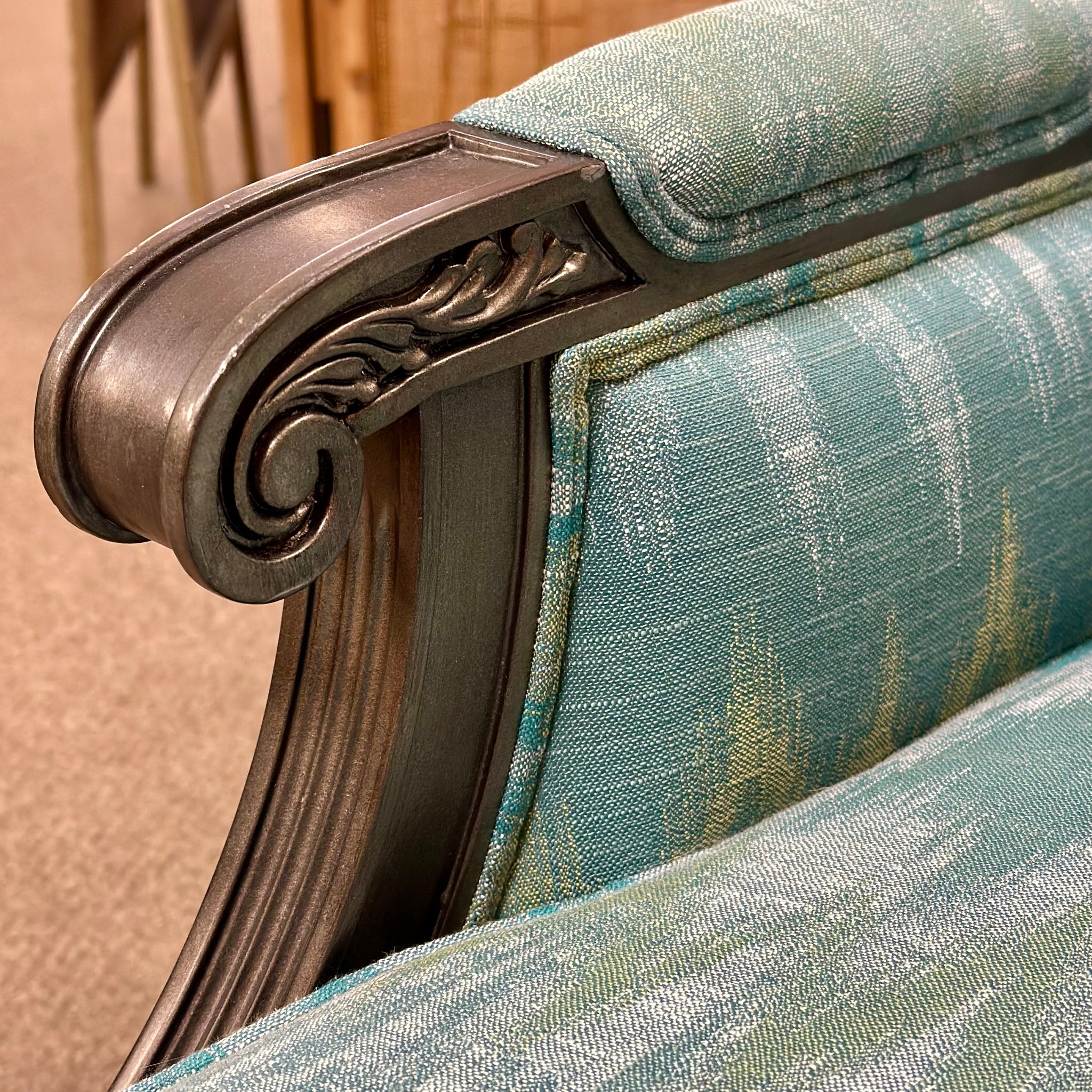 Upgrade your space with this elegant chair by Ethan Allen. Features carved wood details, silver finish on wood, and an eye cat patterned uphosltery. In great condition. Retails for $1869+, our price less!