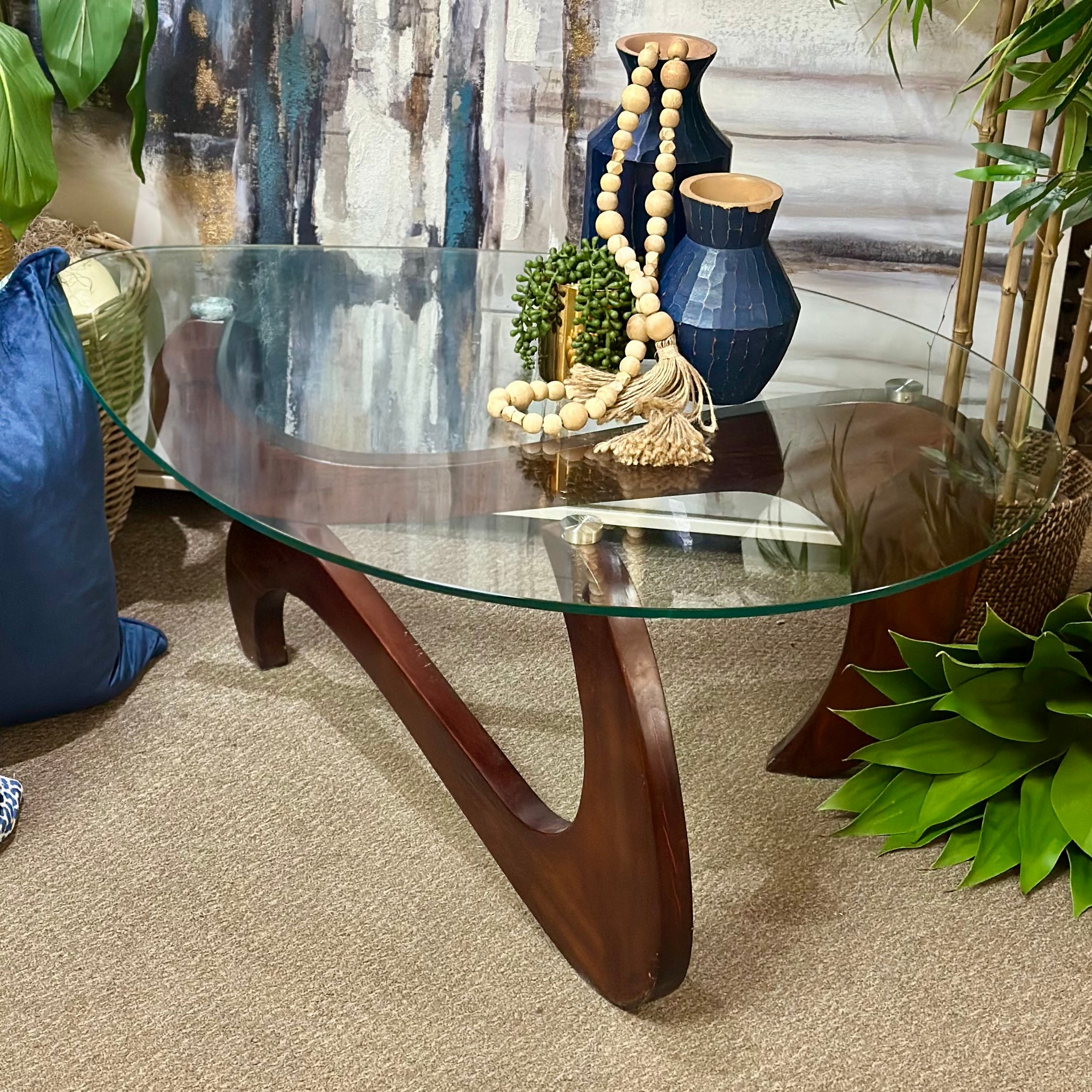 Add this handsome coffee table to your living room. Features a glass top, and a abstract wooden base. In good condition.