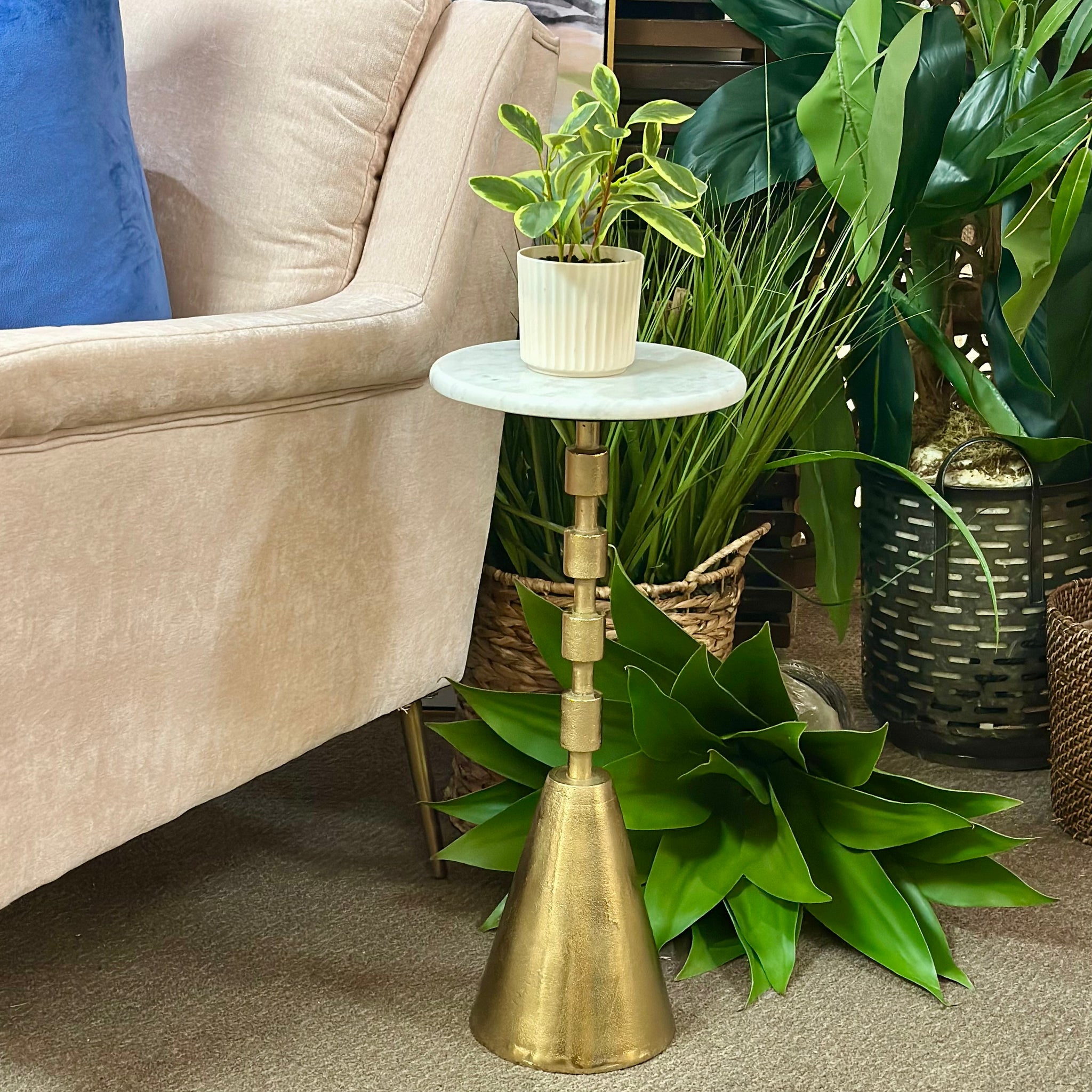 Add this adorable drink table next to your favorite chair. Features a round marble top and a gold base.