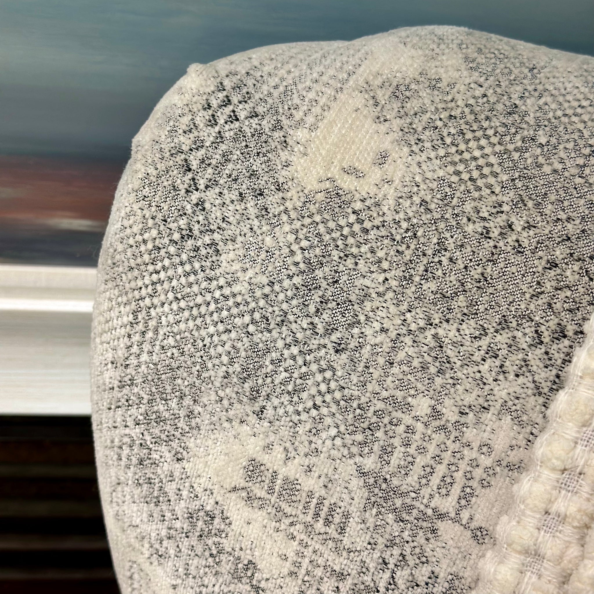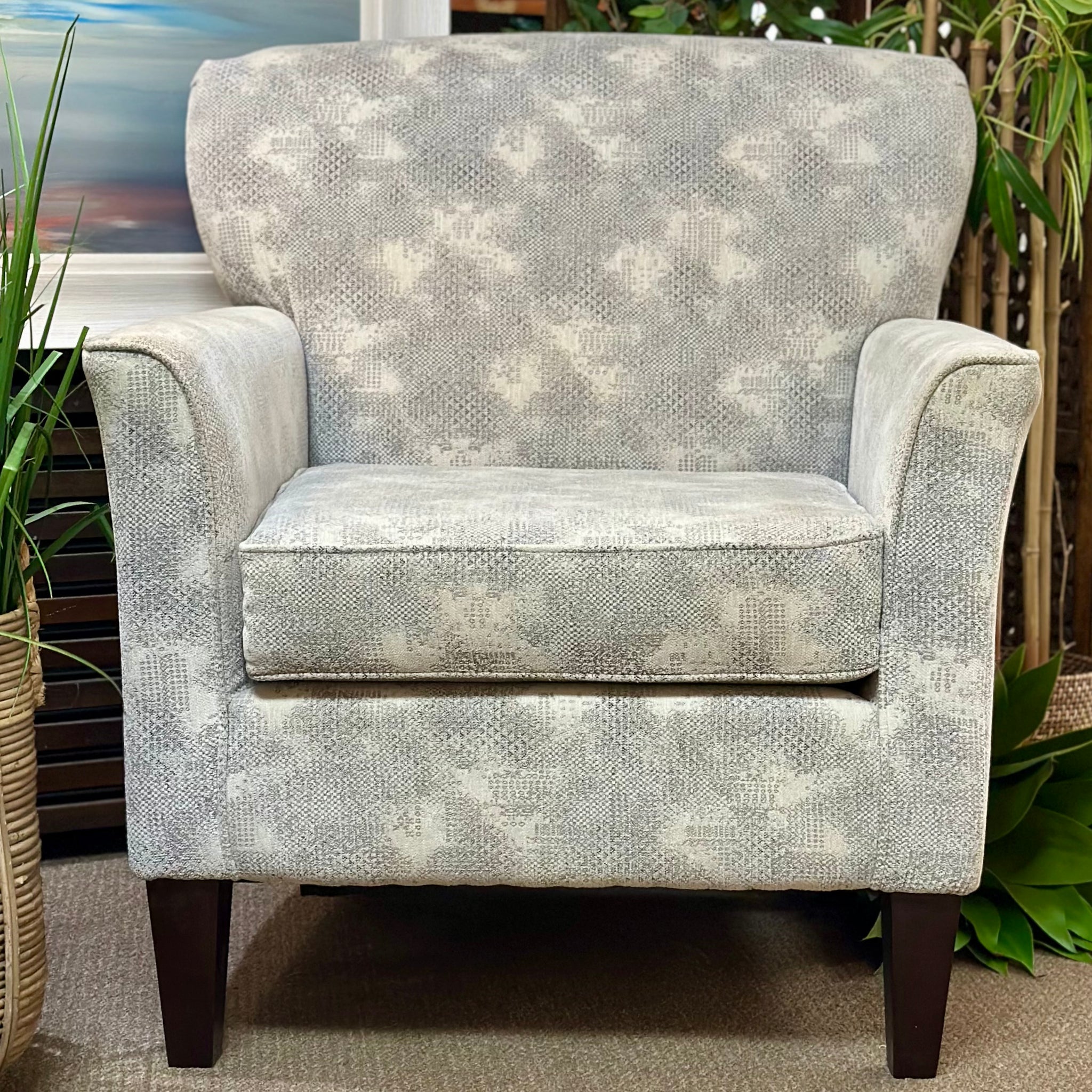 Lovely rolled arm accent chair with light grey and beige abstract upholstery. On consignment and in good condition, with only minor surface wear consistent with use.