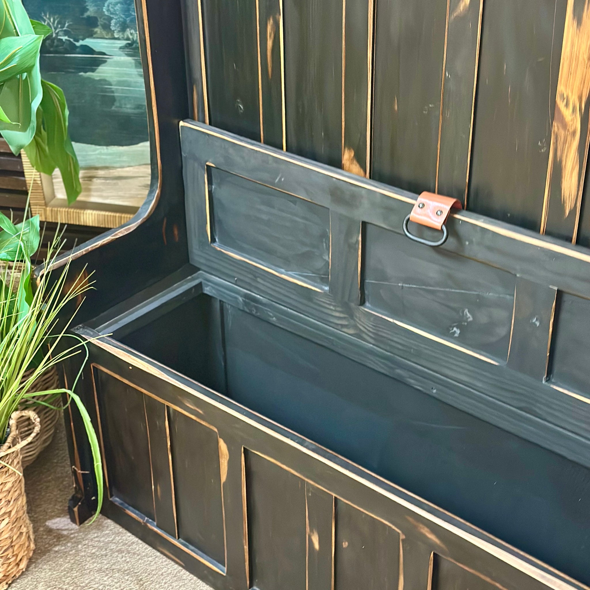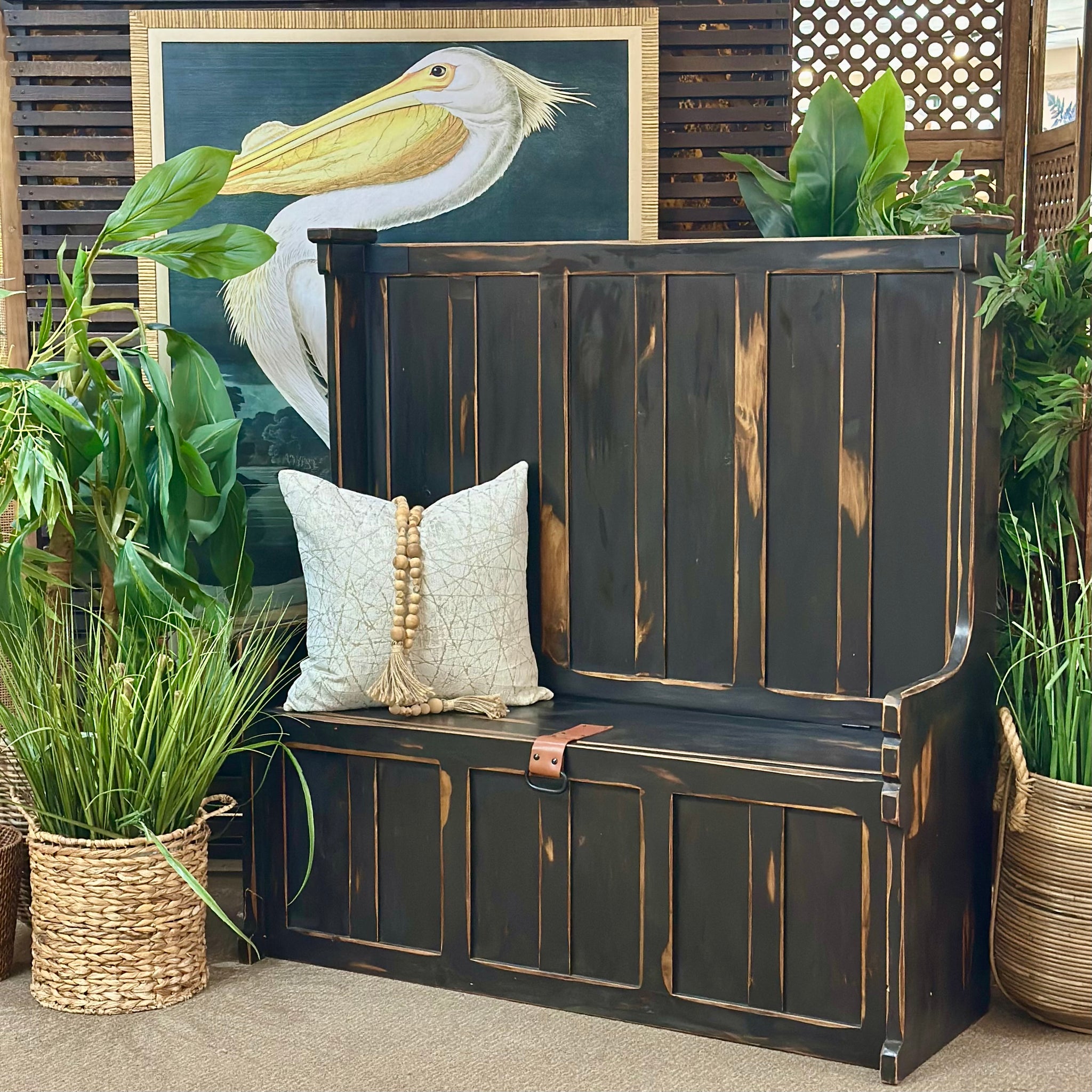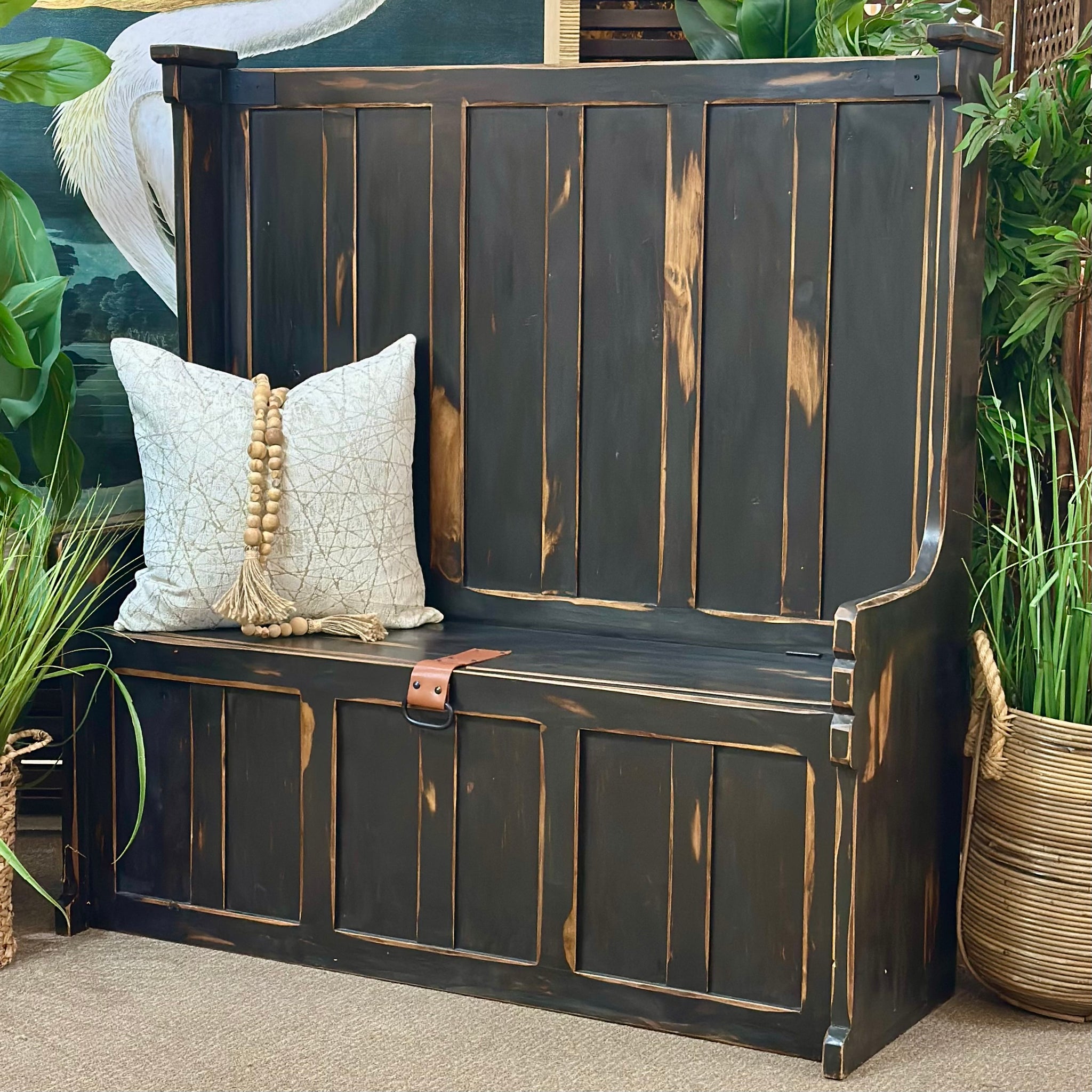 This black bench would make a great addition to your entry way or mud room! Has a high back and storage seat. On consignment and in great condition.