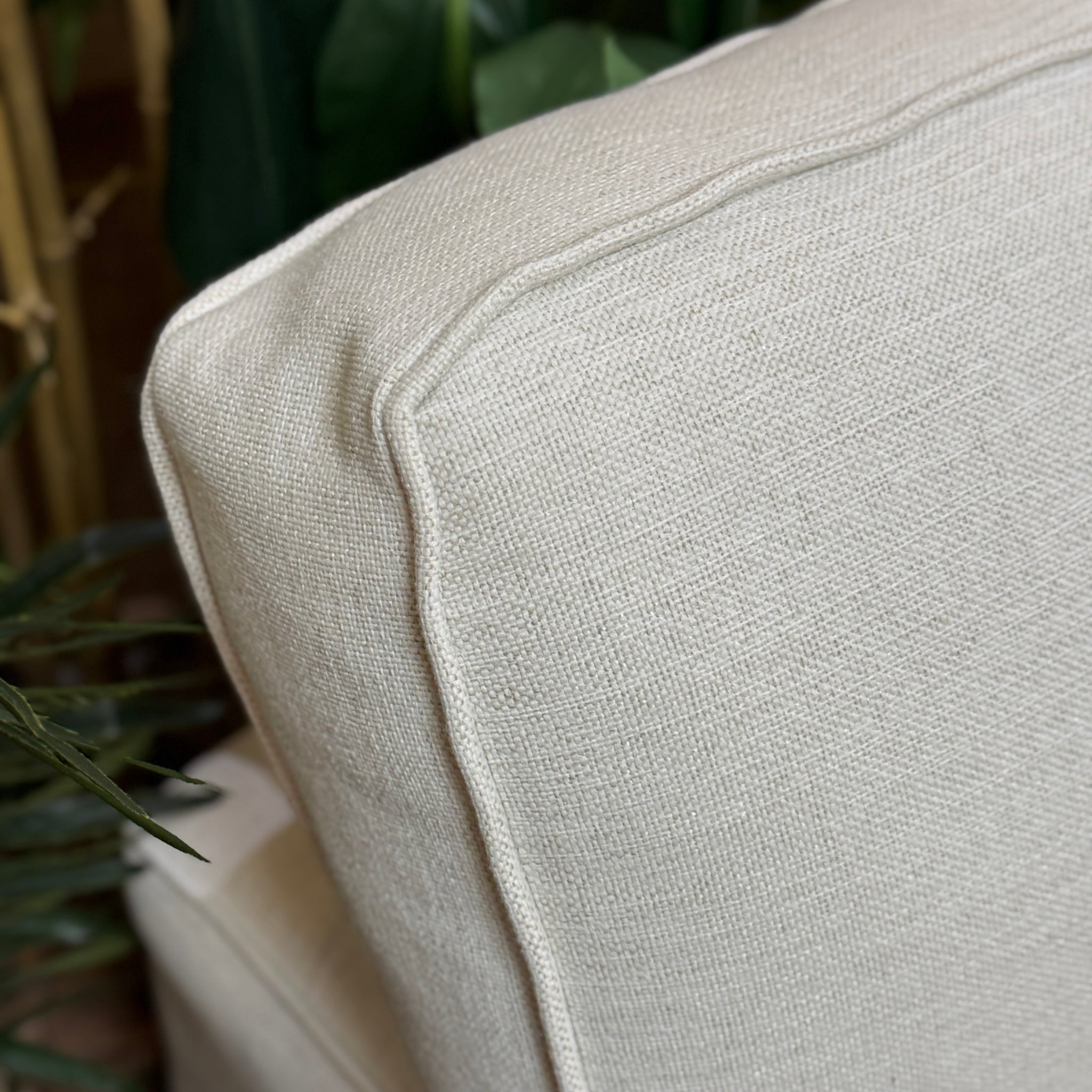 Add timeless styling to your living room with this ivory revolution fabric sofa. Featuring squared arms and loose seat and back cushions. BRAND NEW