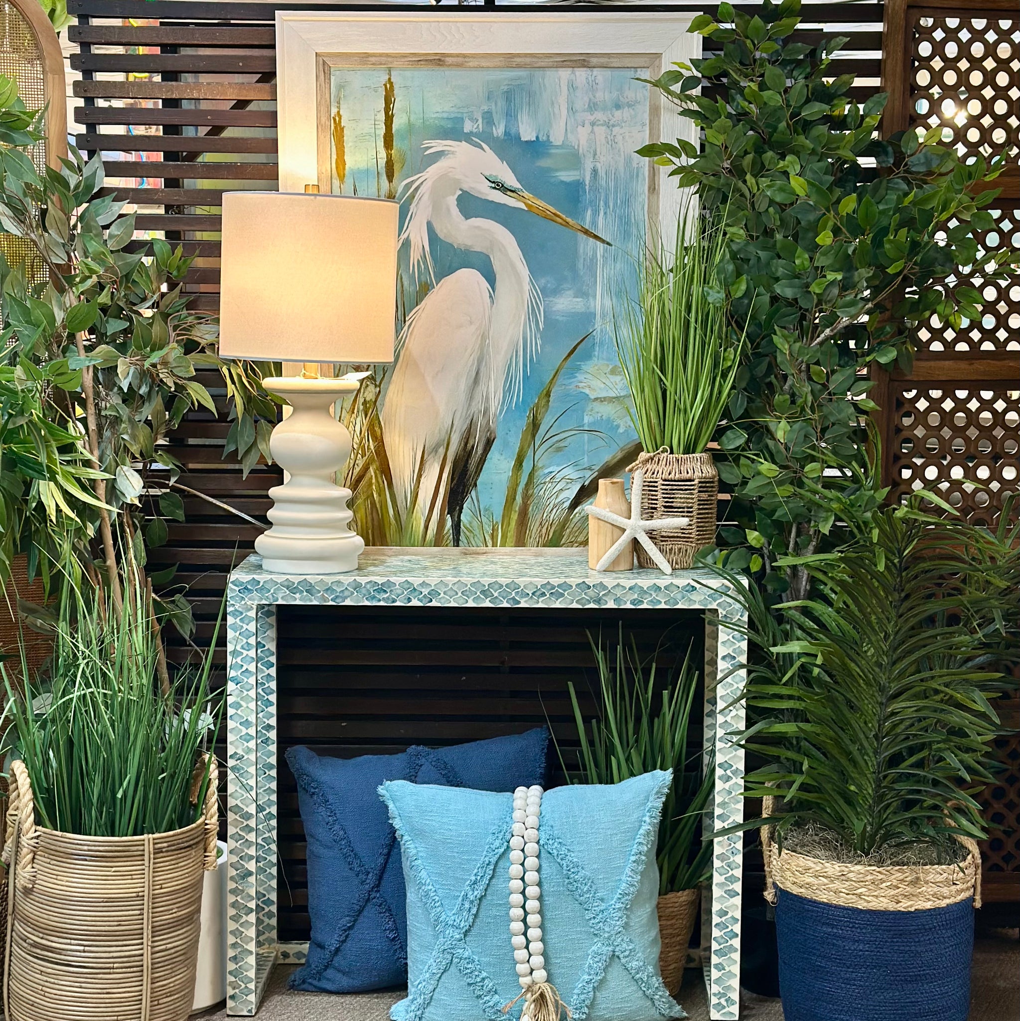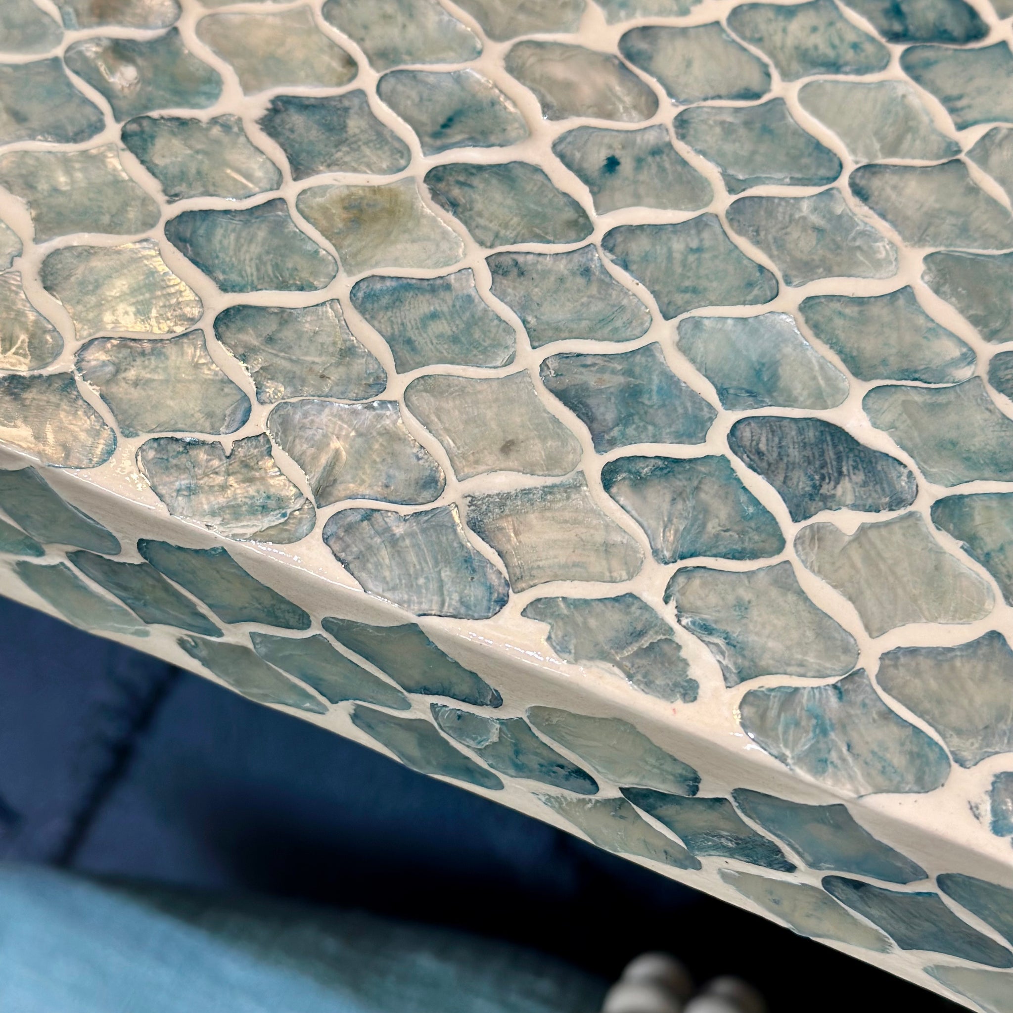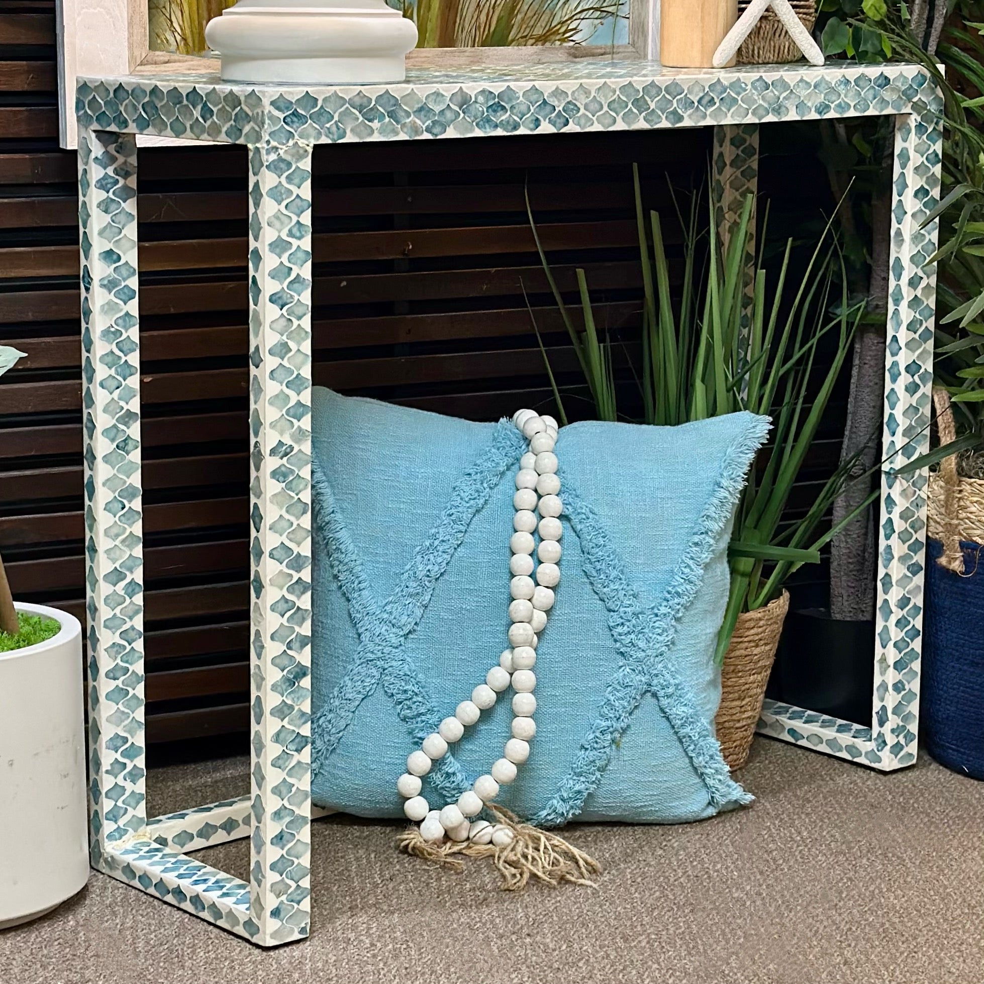 LOVE this turquoise capiz shell console just in! Use in the entry way or as a chic make-up table. BRAND NEW, and won't last long.