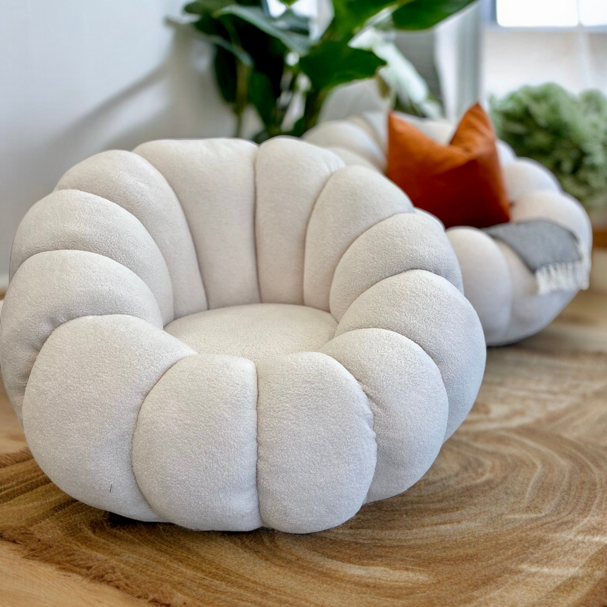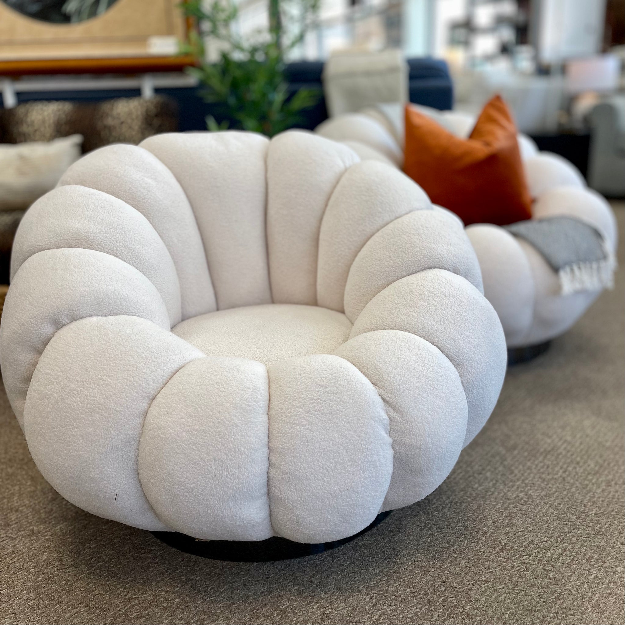 Enjoy endless relaxation in this cozy boucle swivel accent chair! It will welcome you with open arms! Featuring a super soft white boucle fabric, a black metal base and a 360 degree swivel!