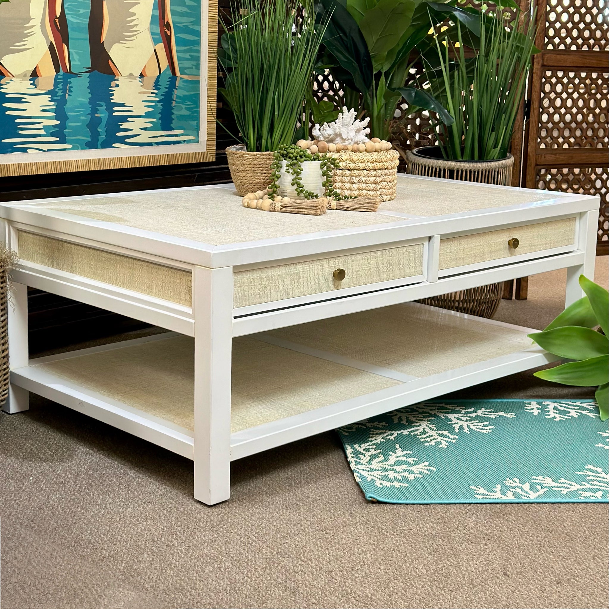 Elevate your space with this stunning coffee table. Features two drawers, cane accents, and a white finish. Perfect for a coastal home! Brand new!