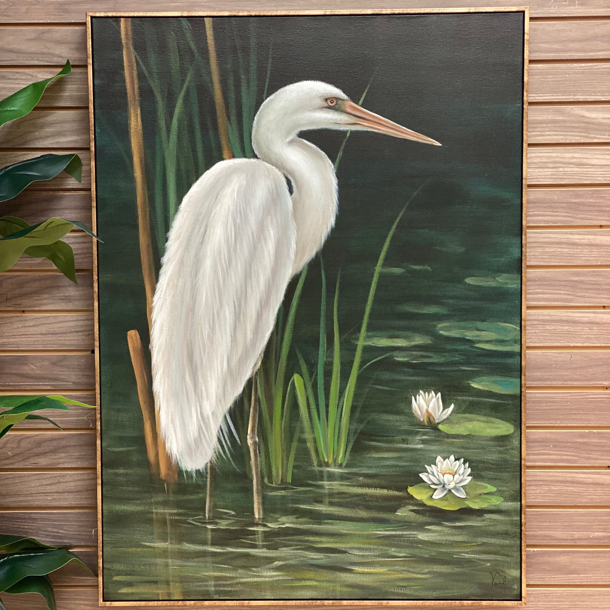 We can't take our eyes off these beautiful crane art framed in brushed gold. Features a saturated emerald green background with contrasting white and hints of gold. Stunning.
