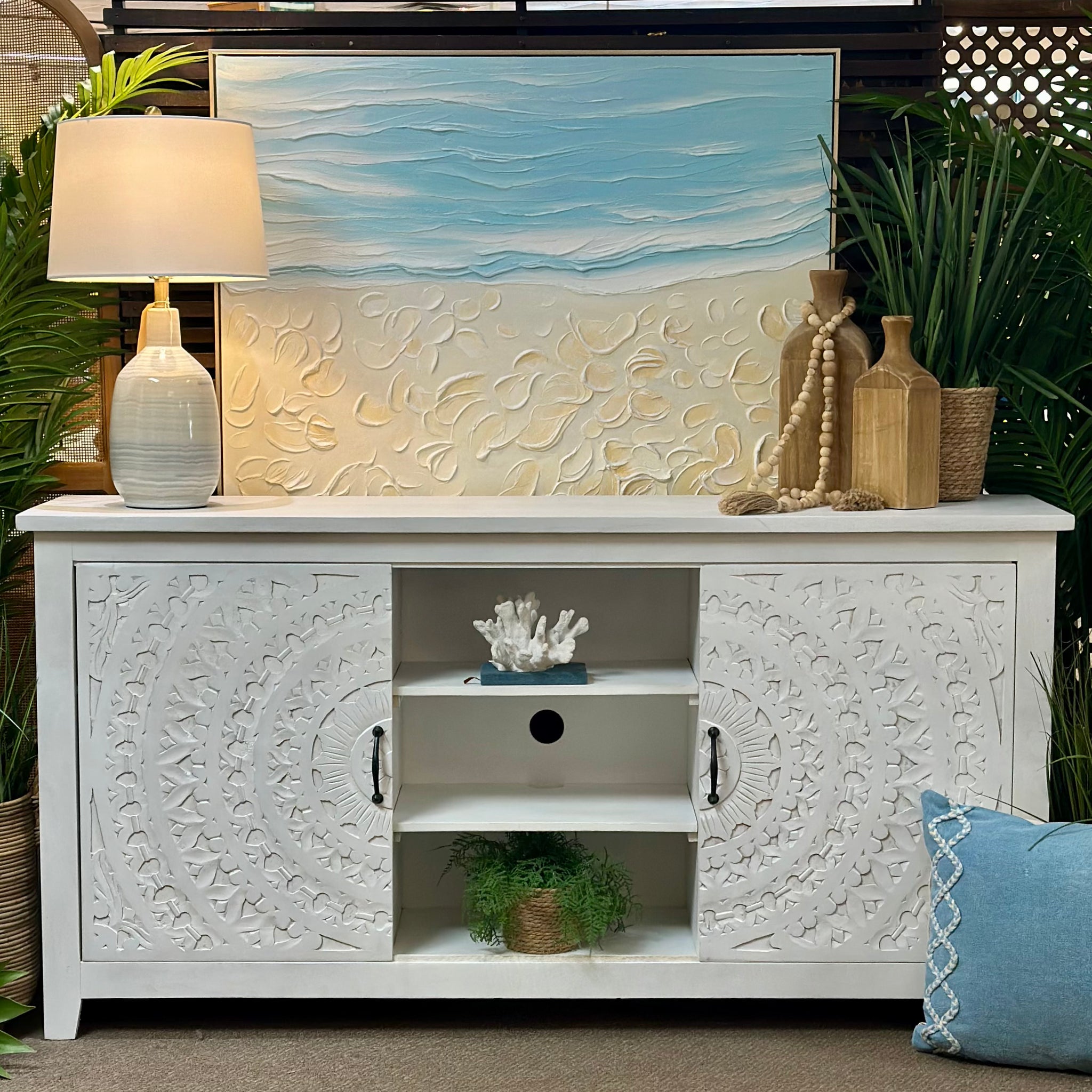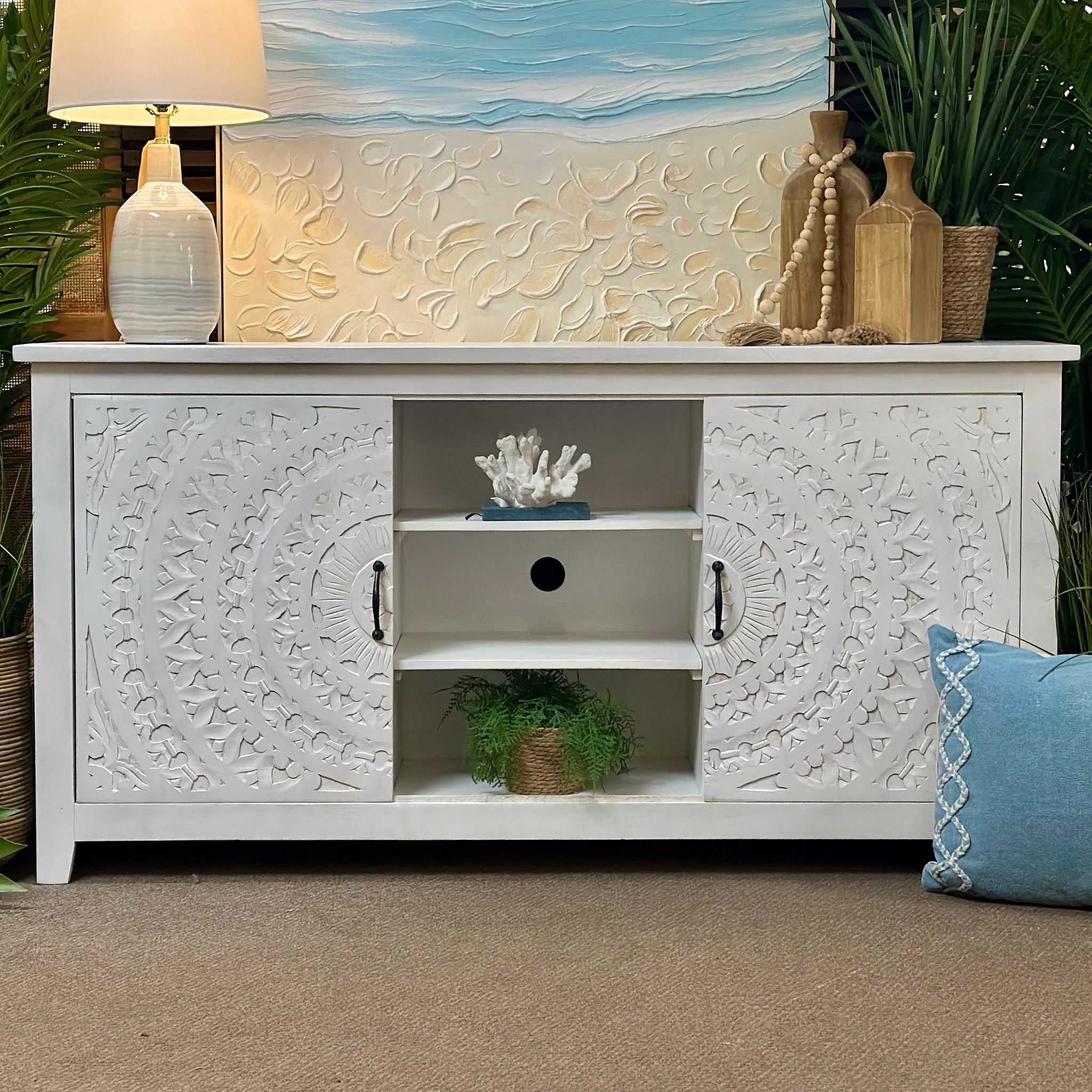 This cabinet make a big statement with it's gorgeous carved detailing. Features a whitewashed finish and sliding doors with functional storage space.