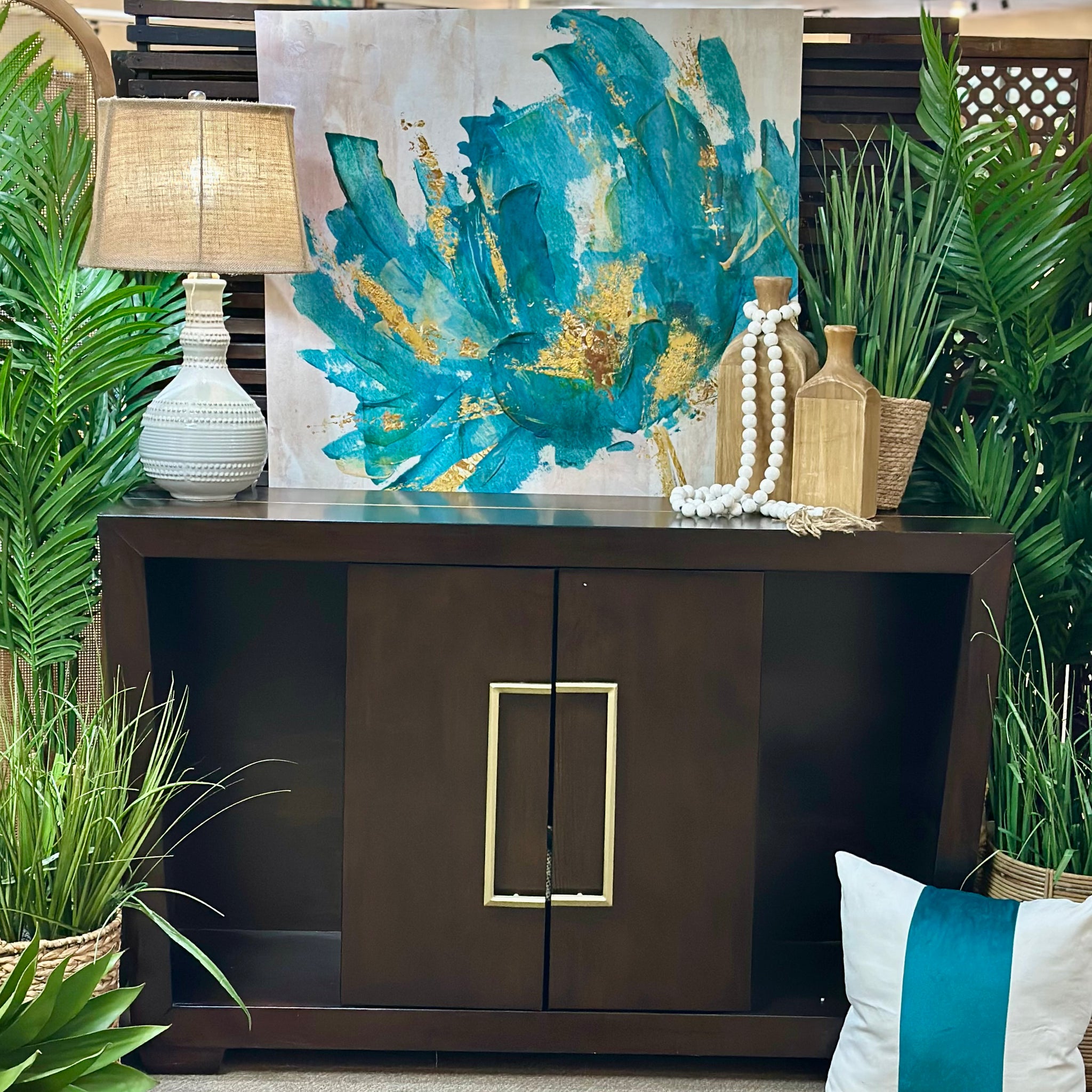 Handsome mocha cabinet perfect for a bar or kitchen area. Features two doors with shelving and open sides for display. In on consignment and in good condition.