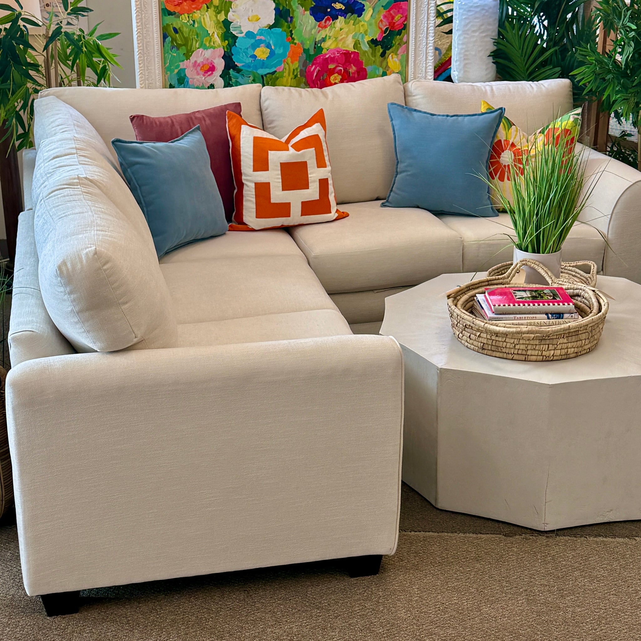 Made right here in NC! This quality made sectional features modern wedge arms, and durable ivory upholstery. Brand new!