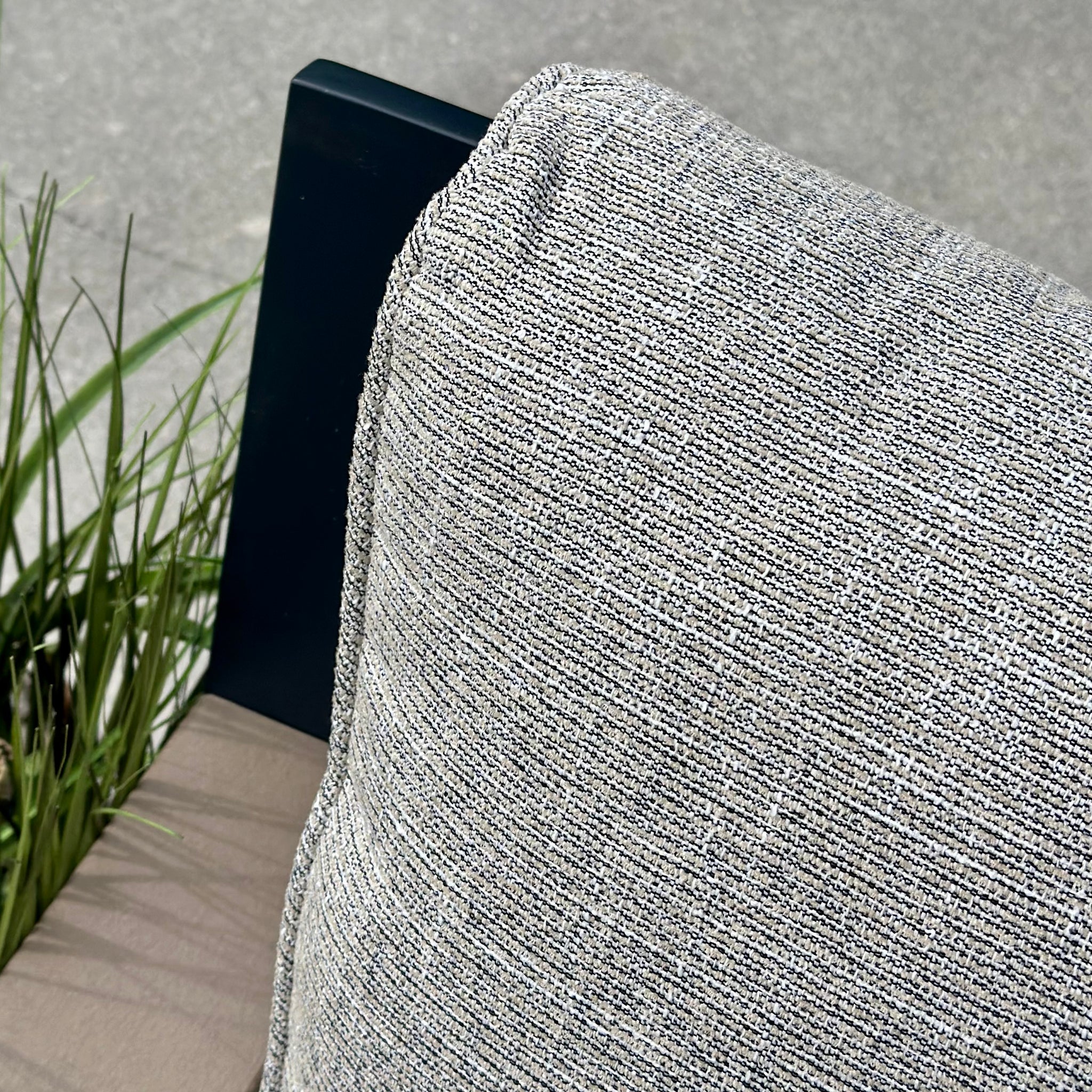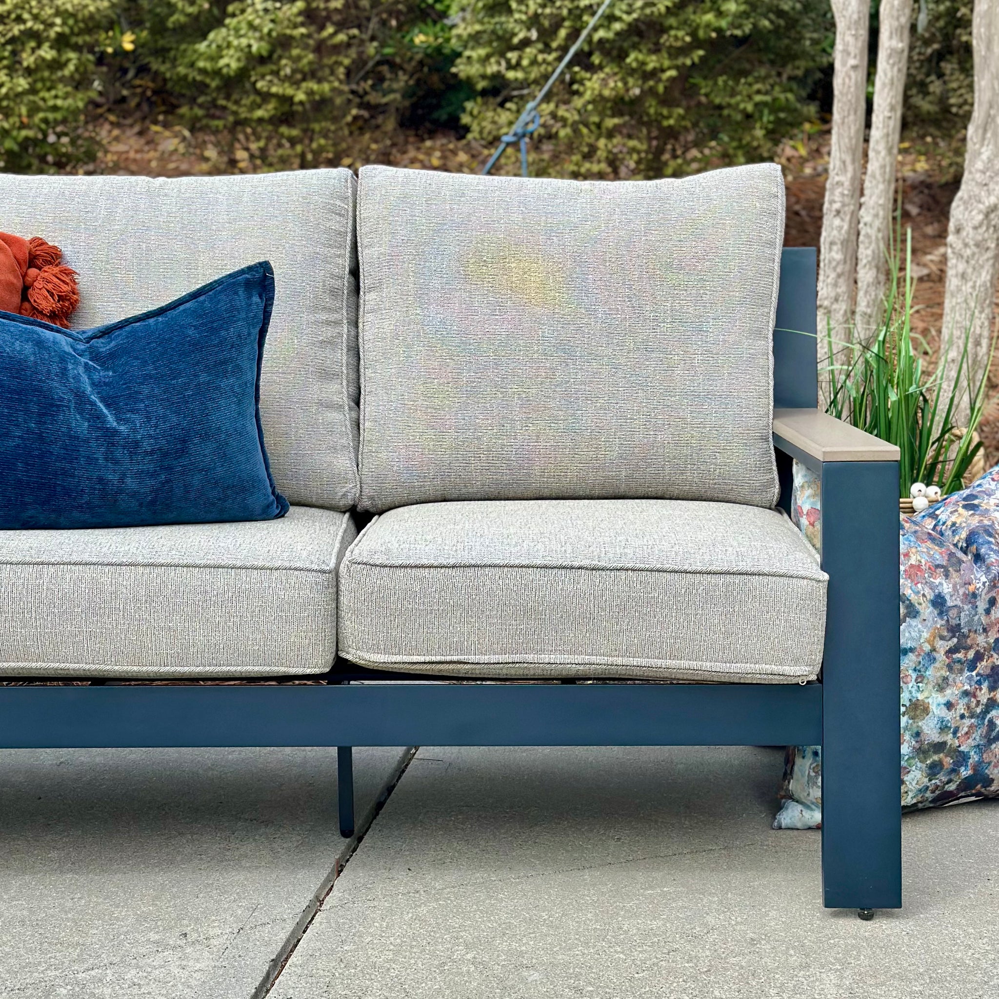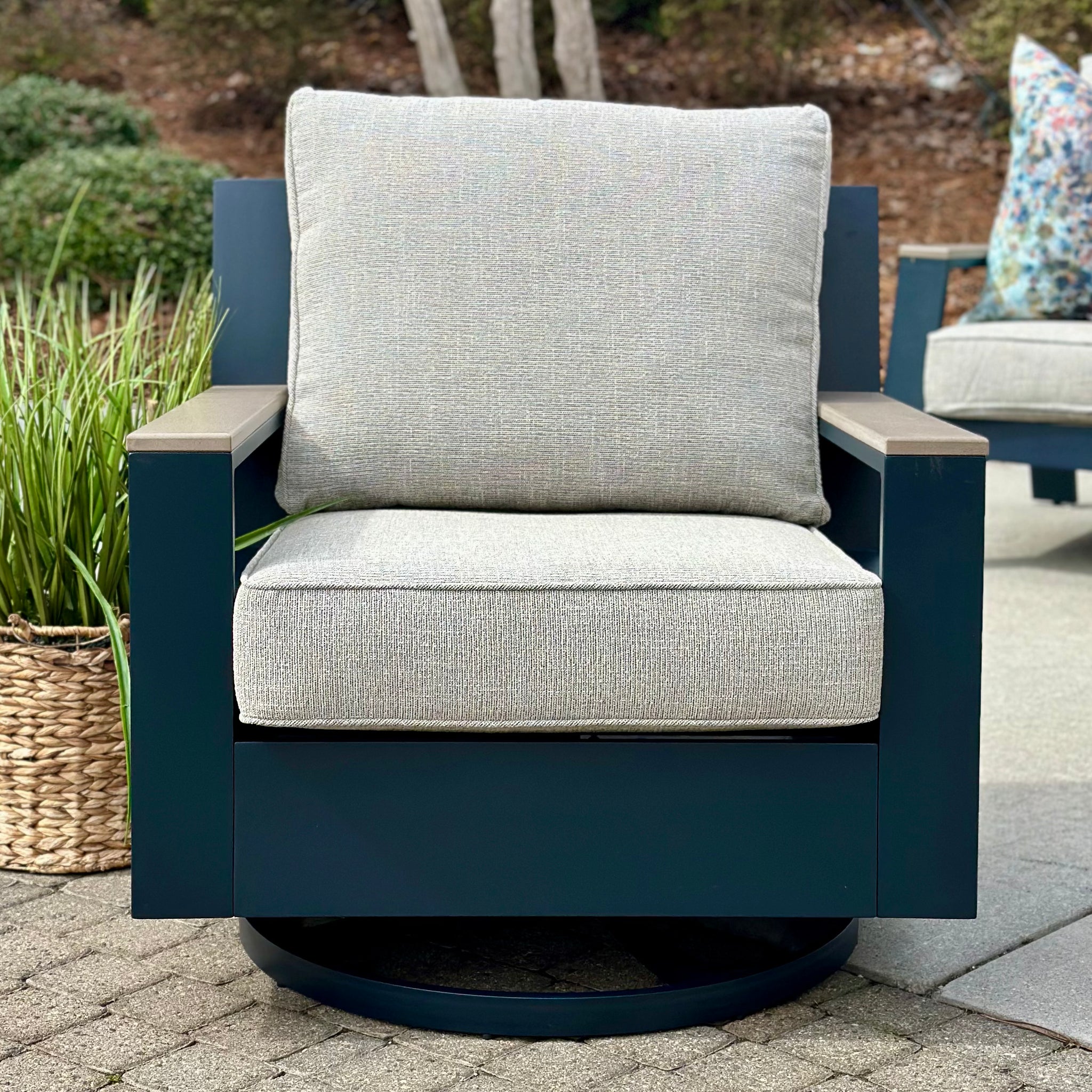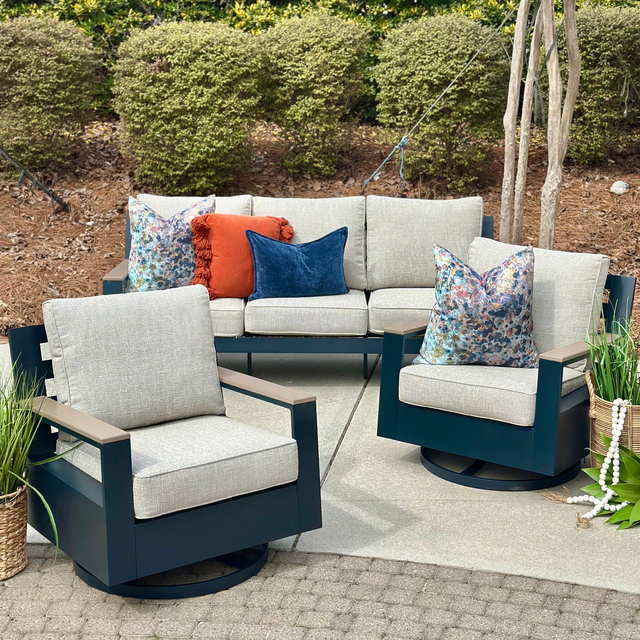This set offers the natural wood look you love with exceptional resistance to the elements. Finished in a stylish navy and driftwood combination, the sofa and two swivel gliders brings a modern coastal feel to any outdoor space. Cushions are upholstered in solution-dyed, high-performance fabric and frames are aluminum.