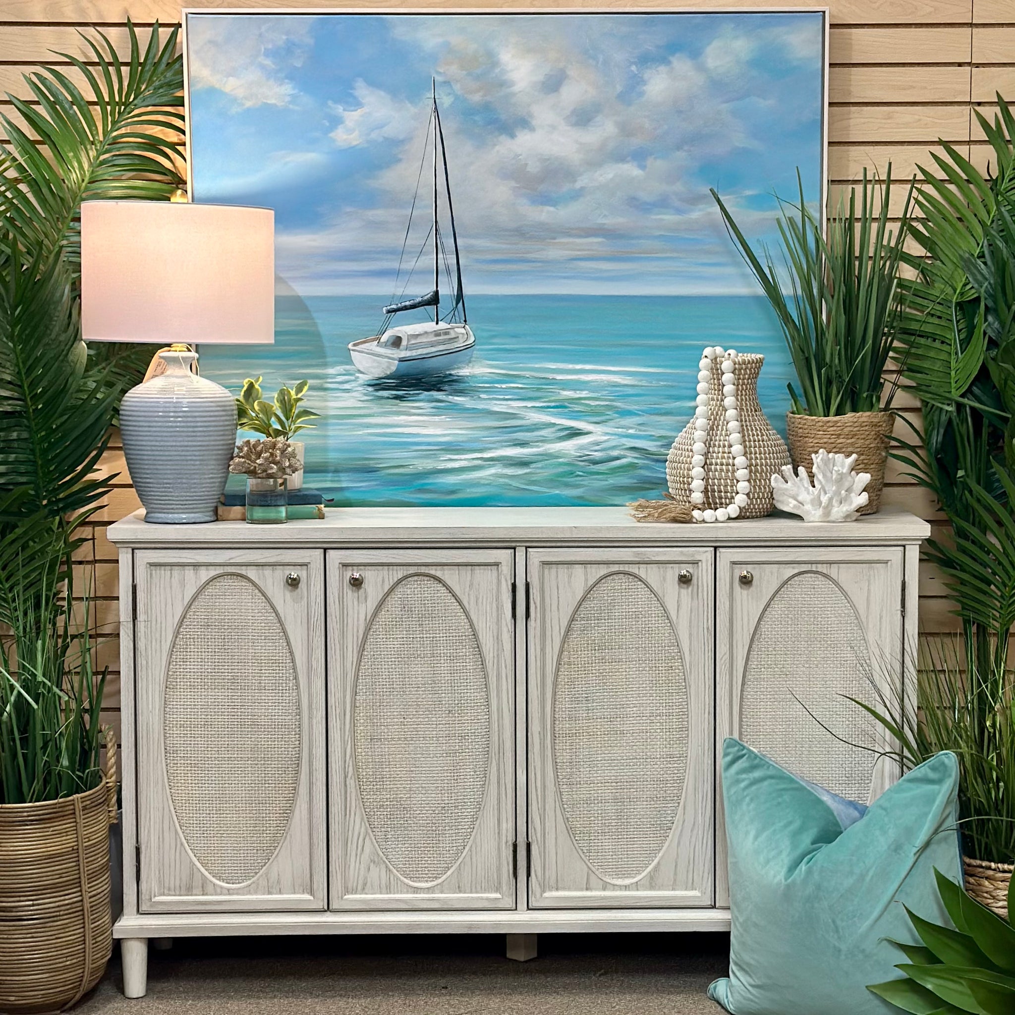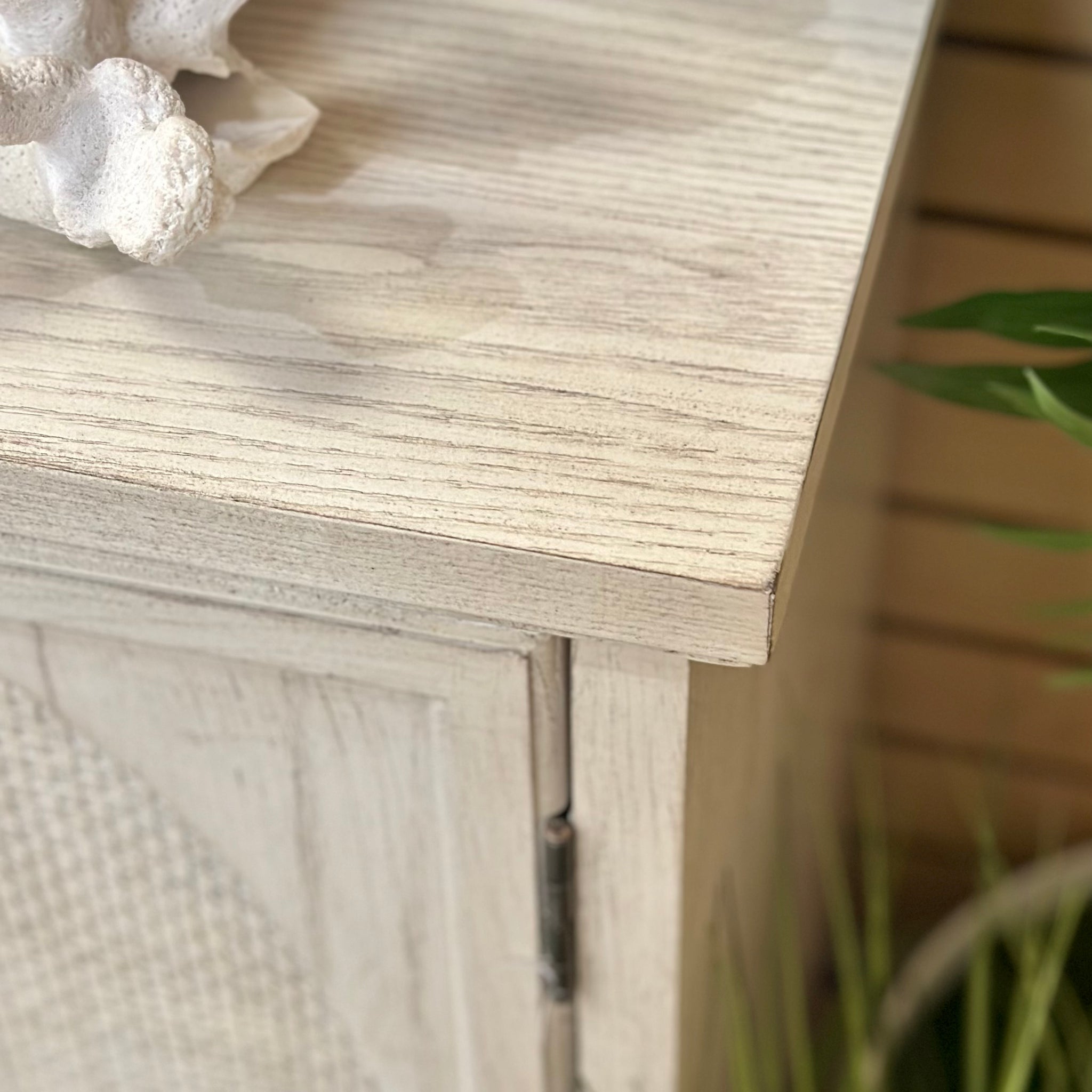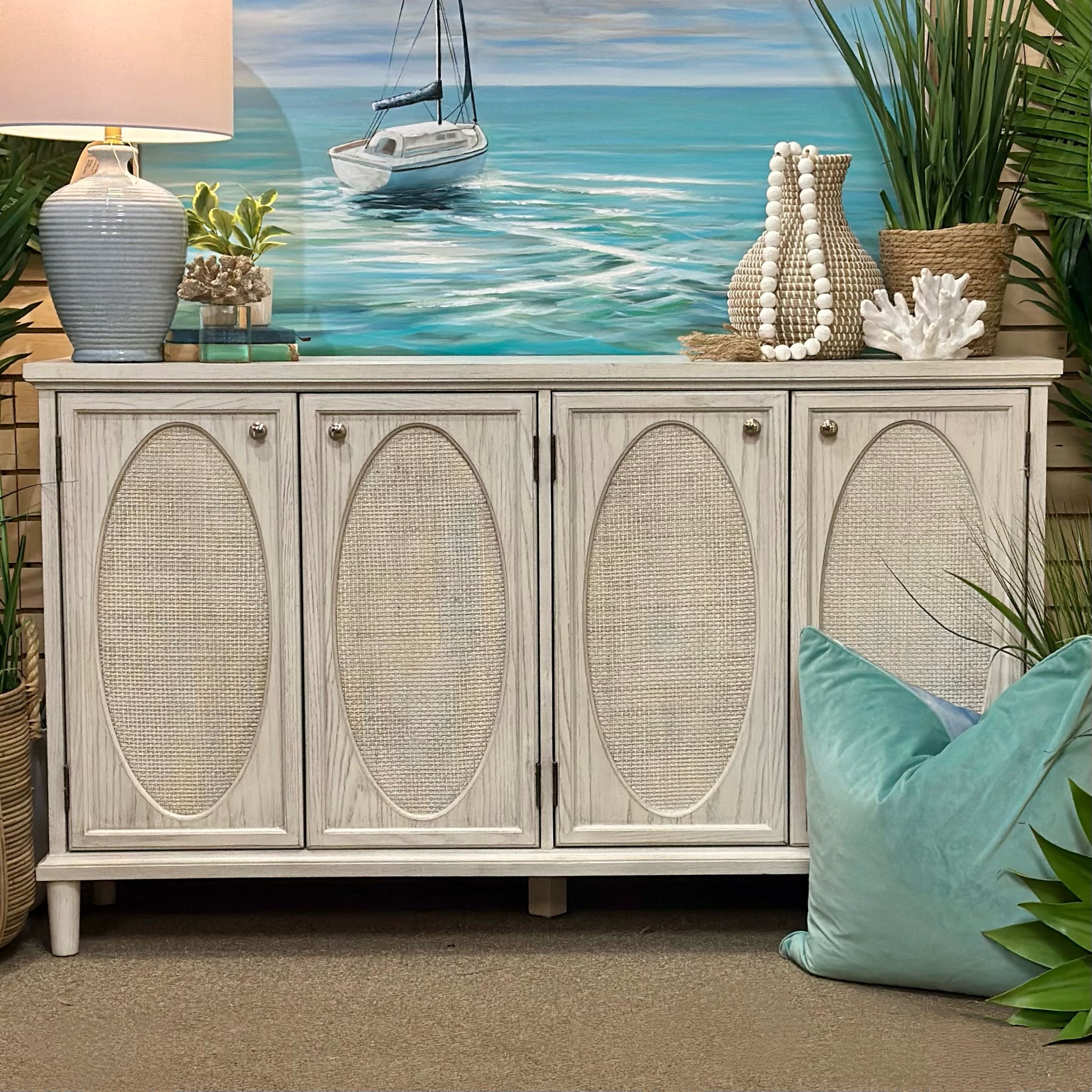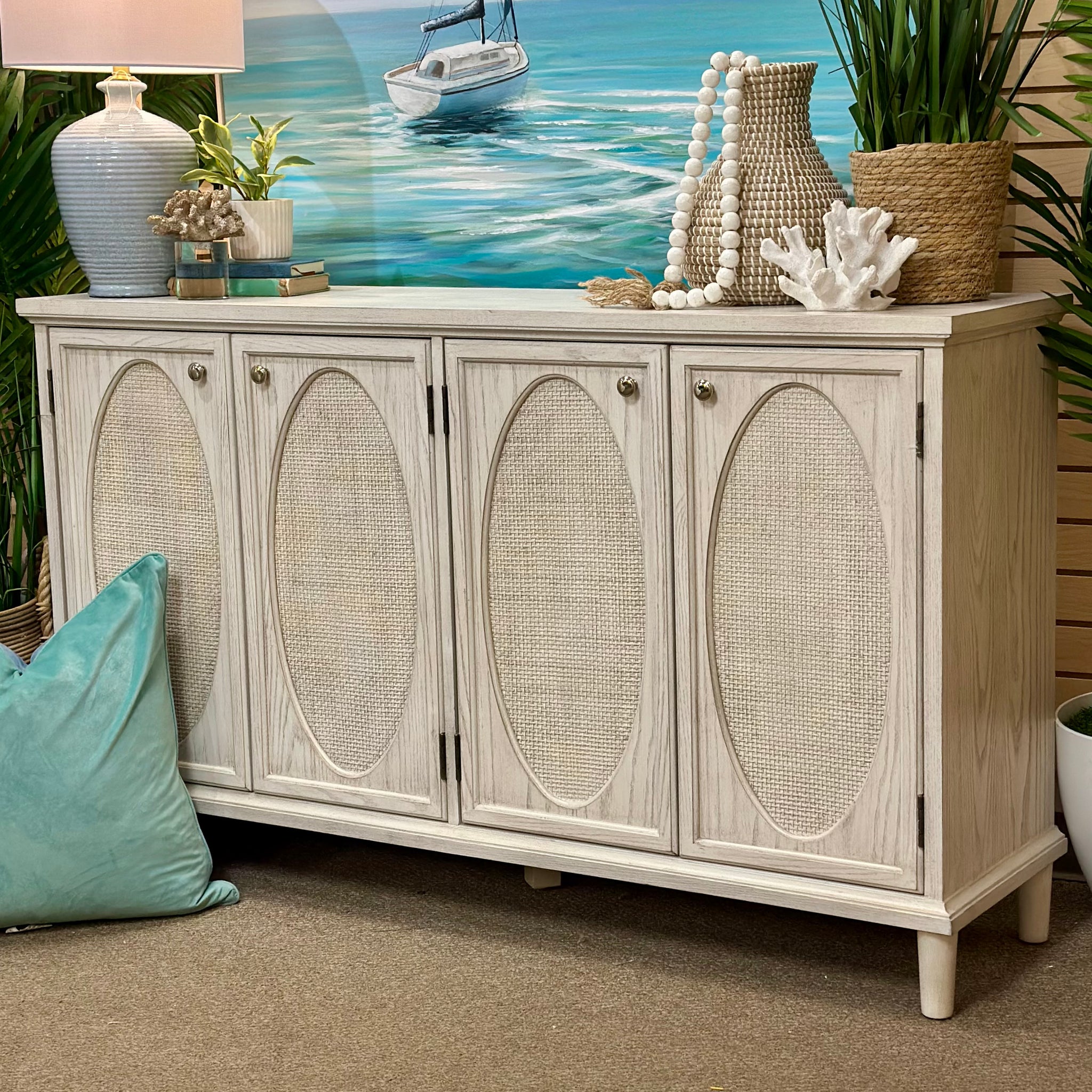 Gorgeous cabinet in an white washed wood finish. Features oval shaped details on doors with cane inlay. Brand new!