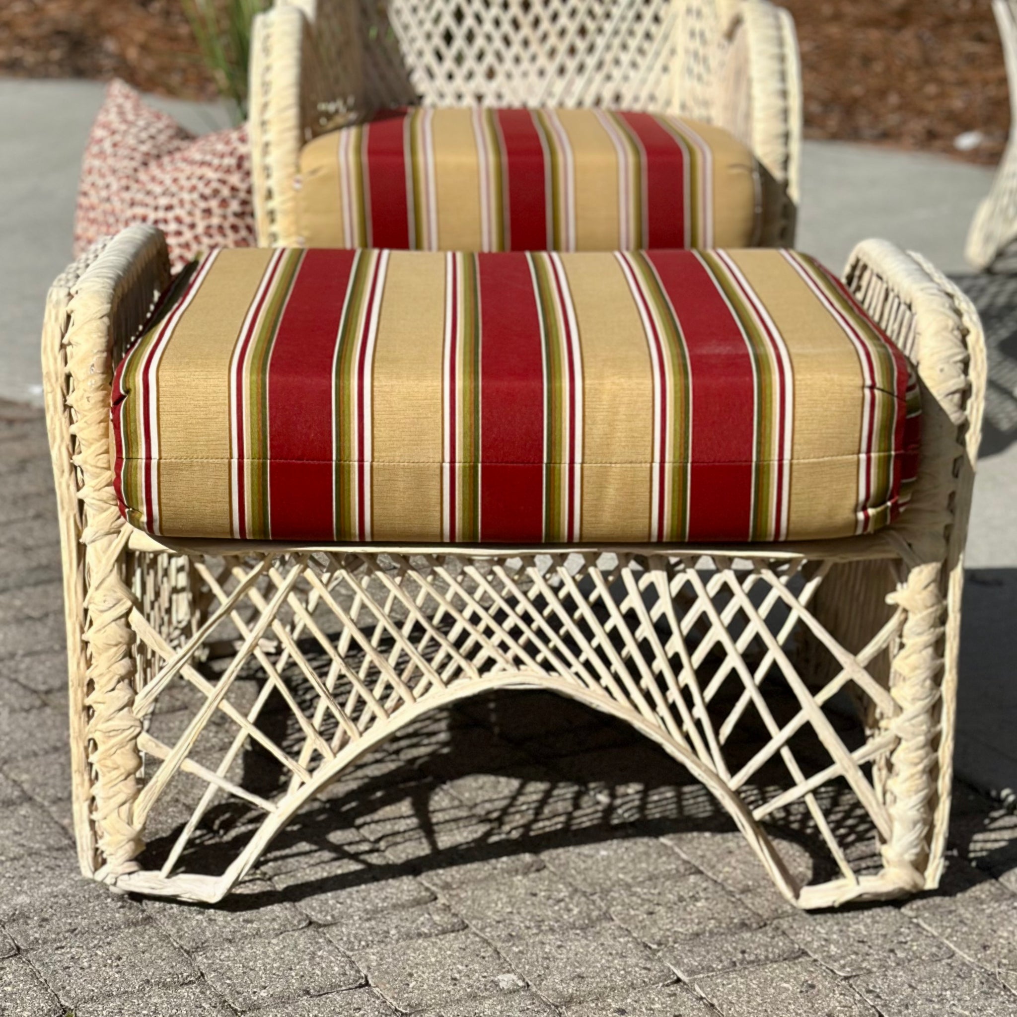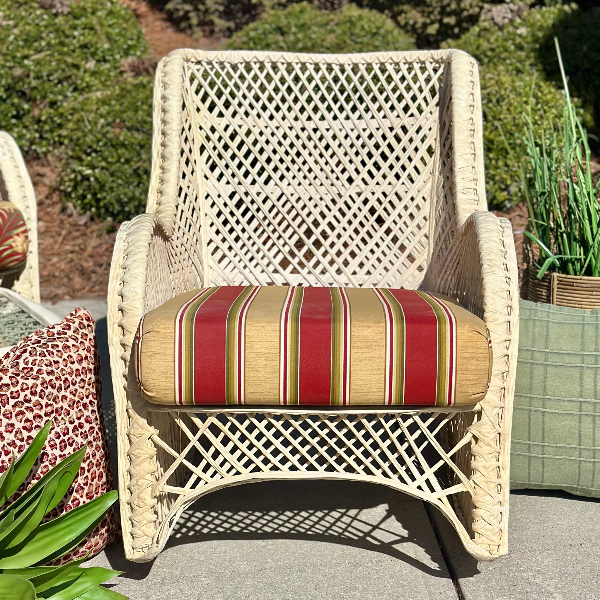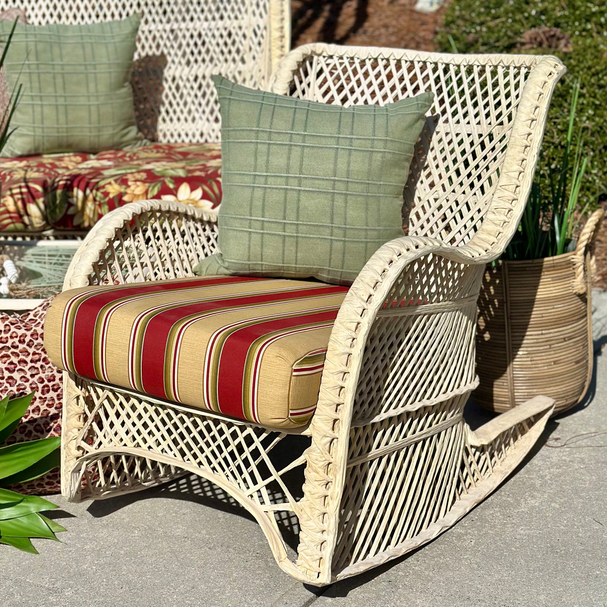 This cottage style outdoor set add color and a great amount of seating to your outdoor space. Includes loveseat, chair W/ottoman, rocker, coffee table and side table. Loveseat features a red/green floral print while the chairs have a red/taupe stripe printed seat. Some yellowing to the rattan frame for sun exposure. On consignment and in good condition!