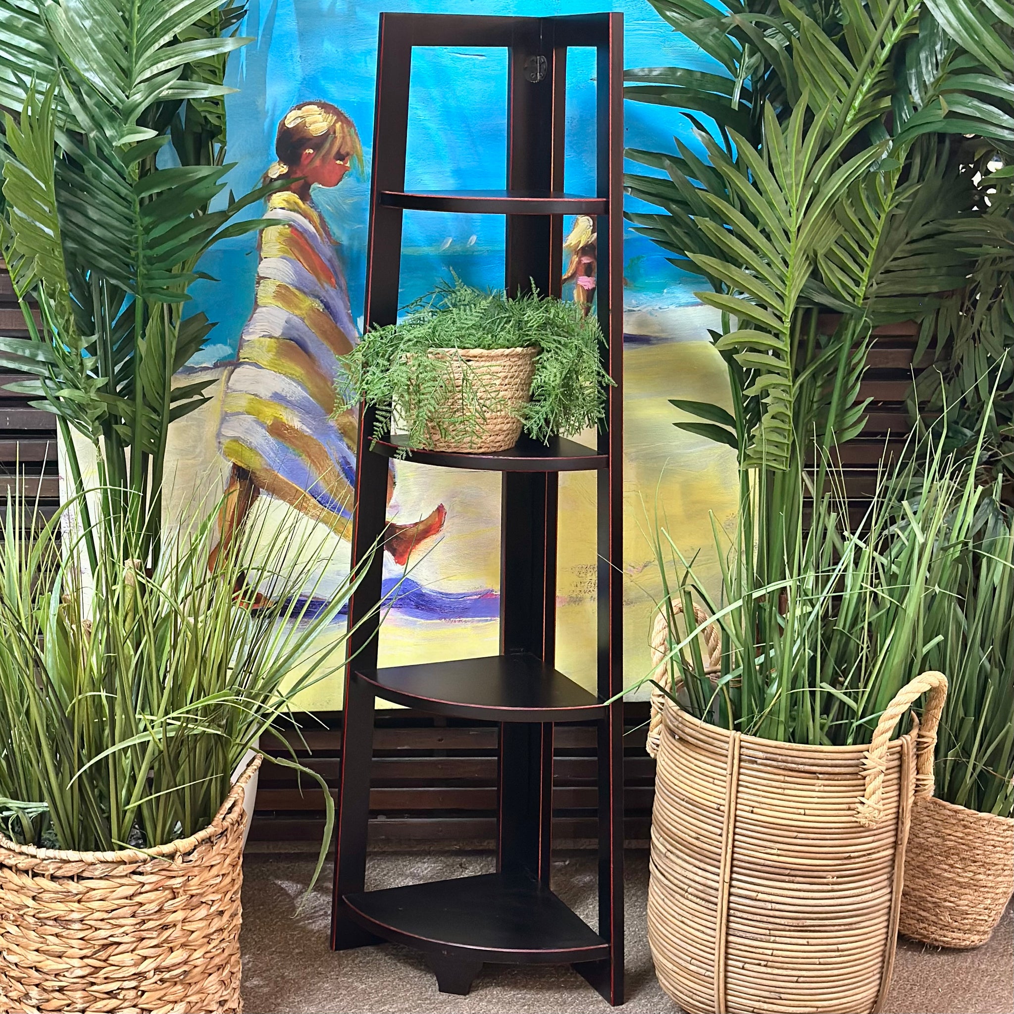 Add this handsome corner shelf to any space. Features four shelves, and a black with red hints finish. In great condition.