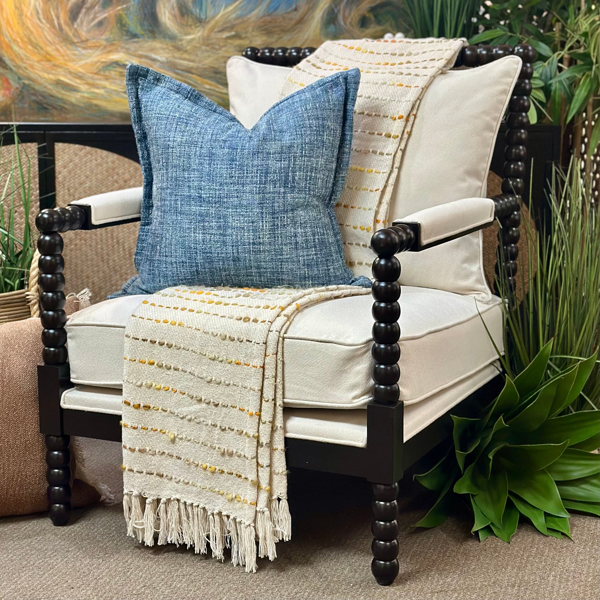 This chair is such a classic look with the spool designed frame! Features a white fabric and a black finish. Brand New!