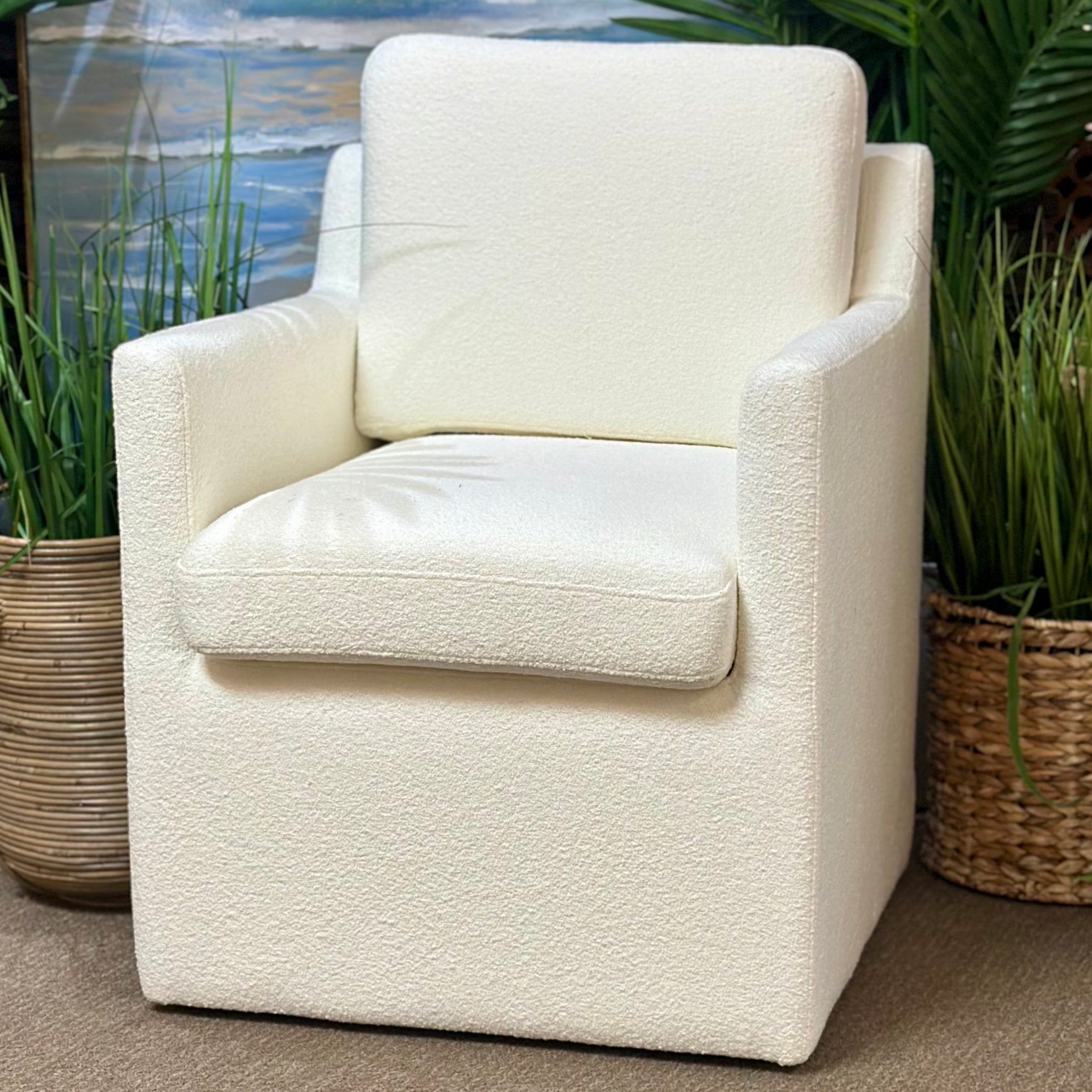 Upgrade your dining room with this lovely dining chair. Features an elegant design, track arms, a cream boucle upholstery and casters for easy moving. Brand new!