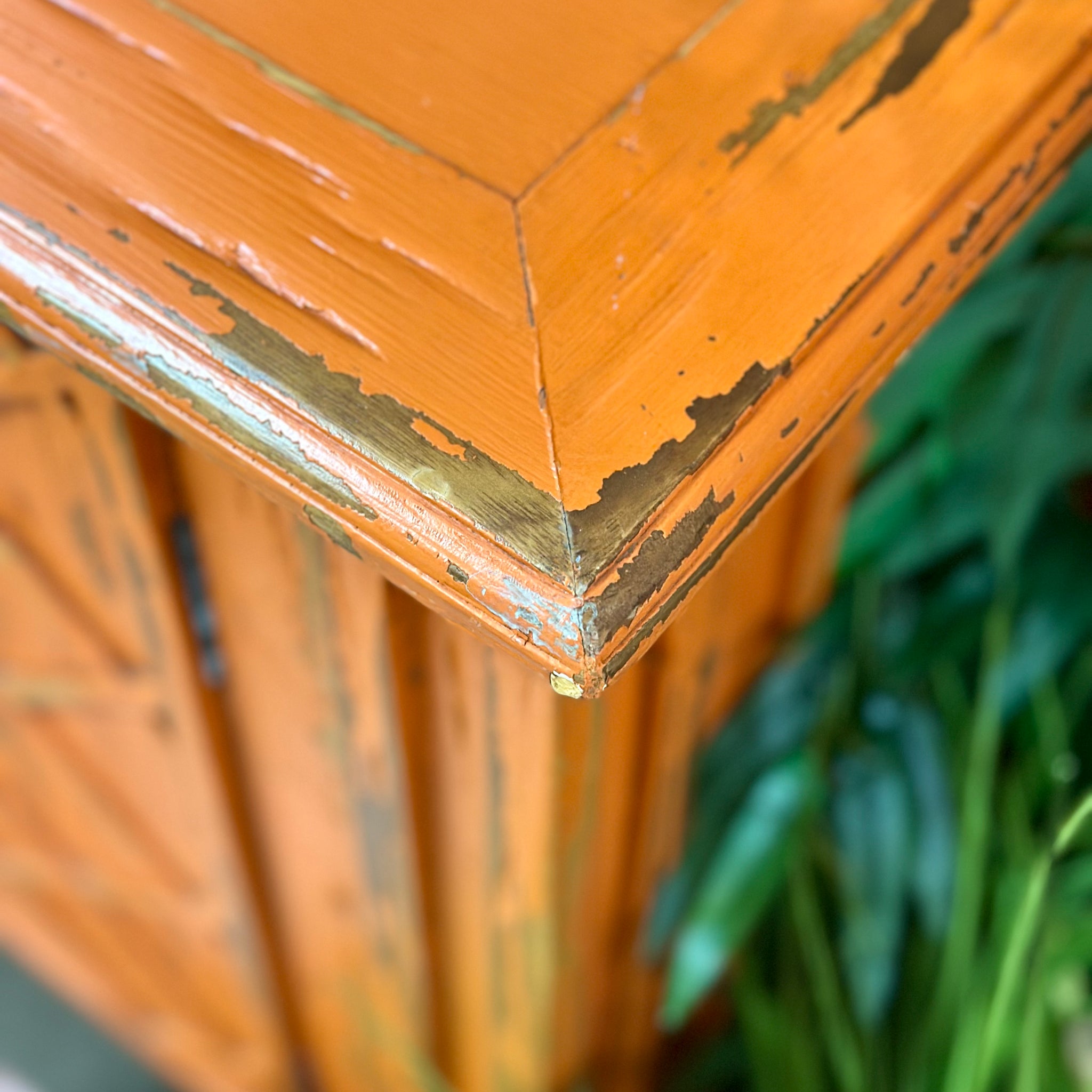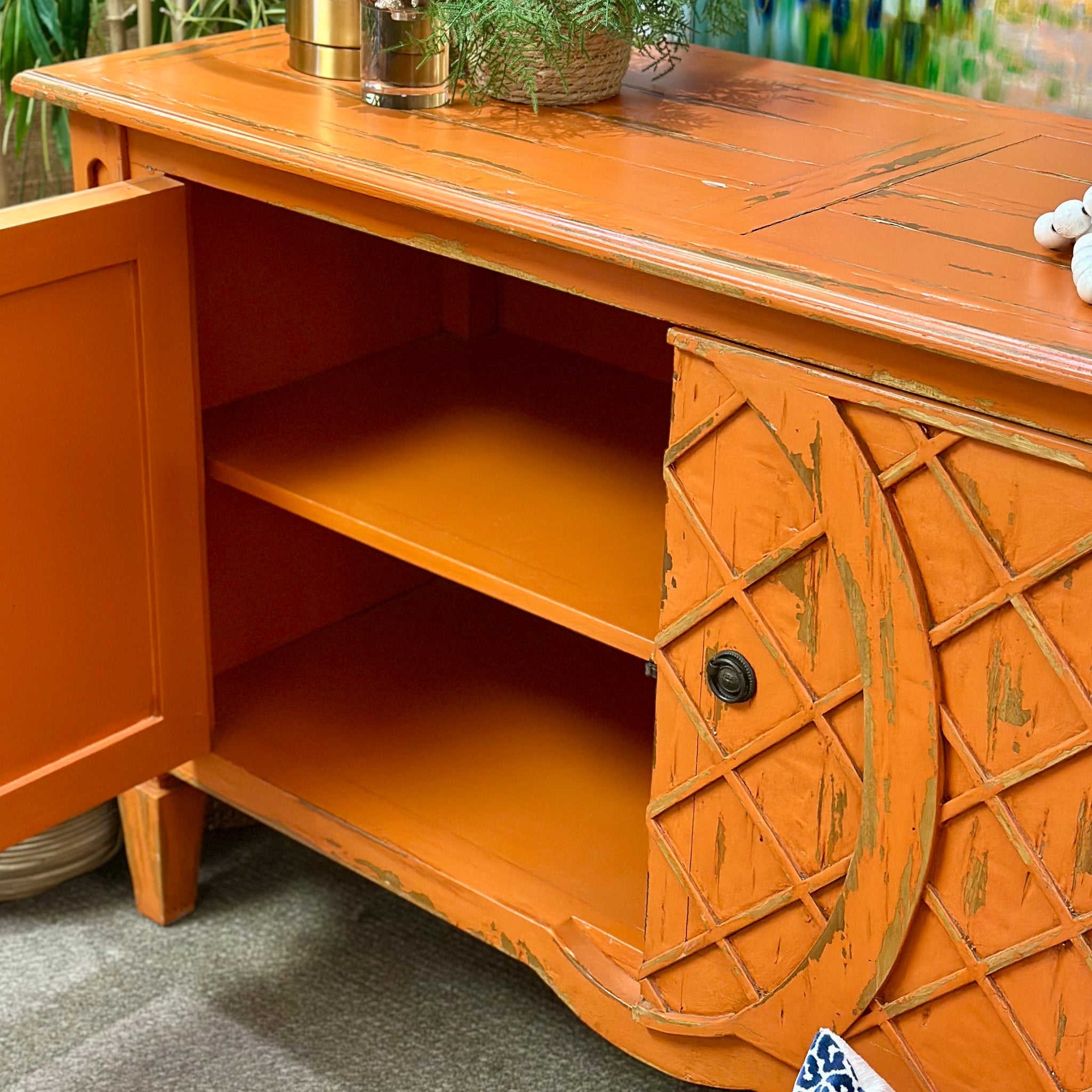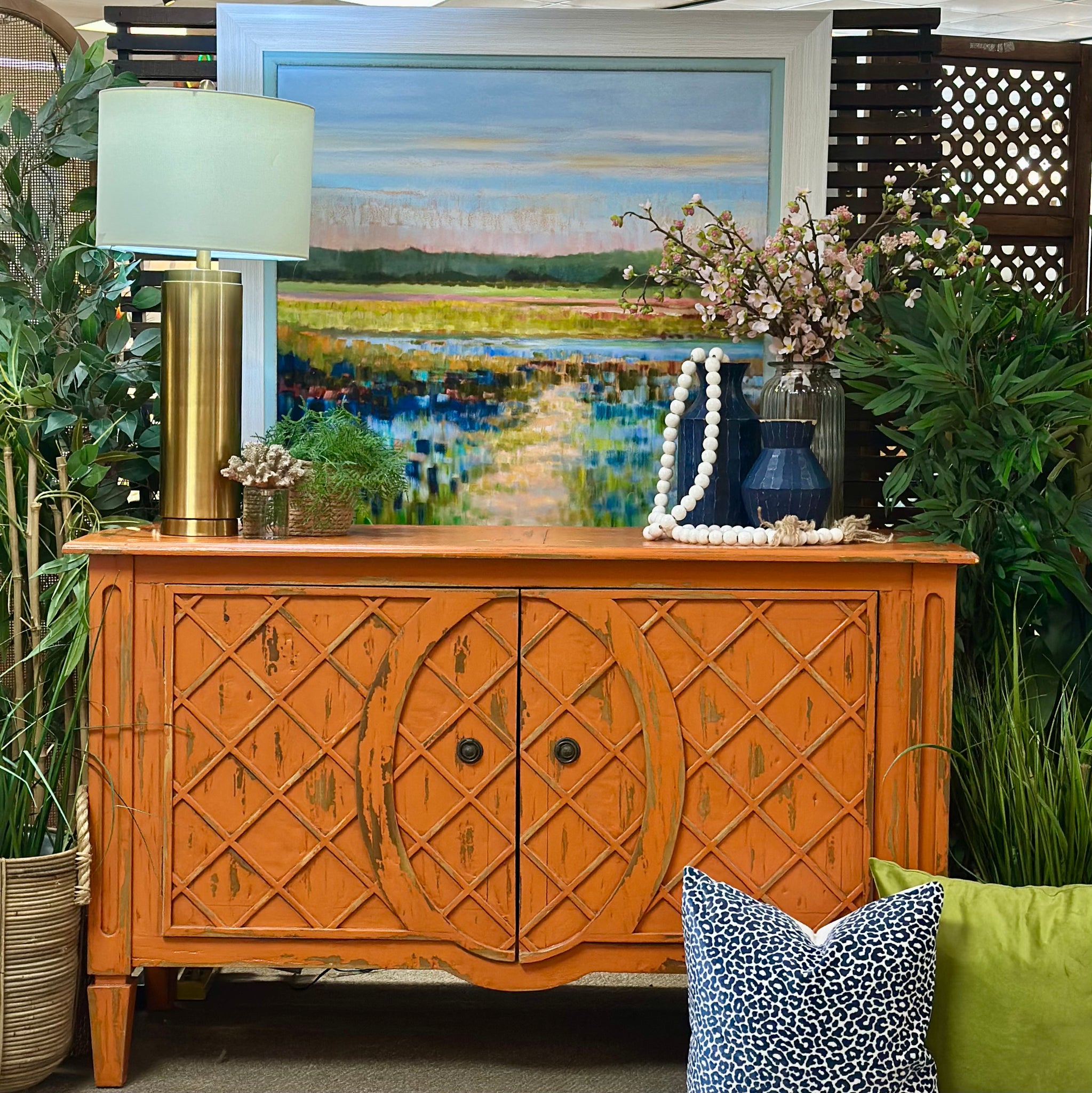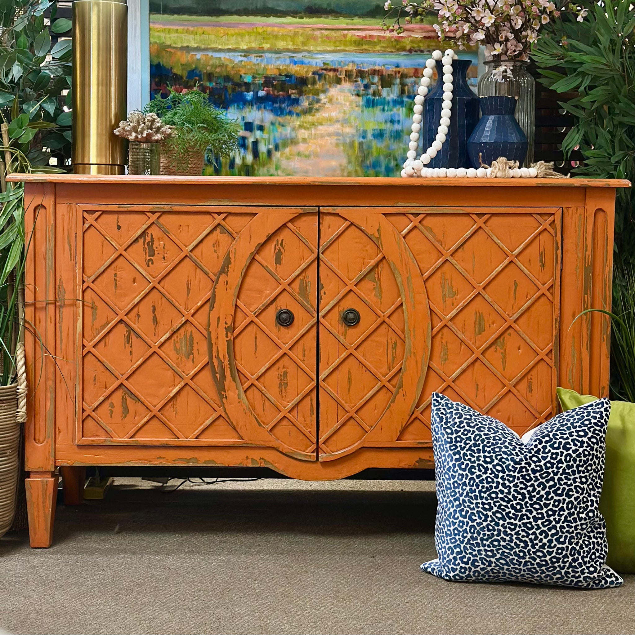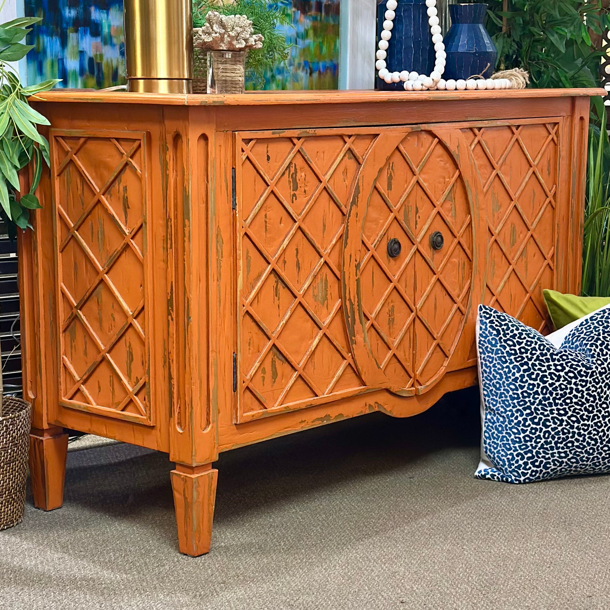 Upgrade your space with this lovely server by Bramble. Features mahogany construction, carved details, lattice pattern on front and sides, and a distressed orange finish. In great condition. Retails for $1600+, our price less!