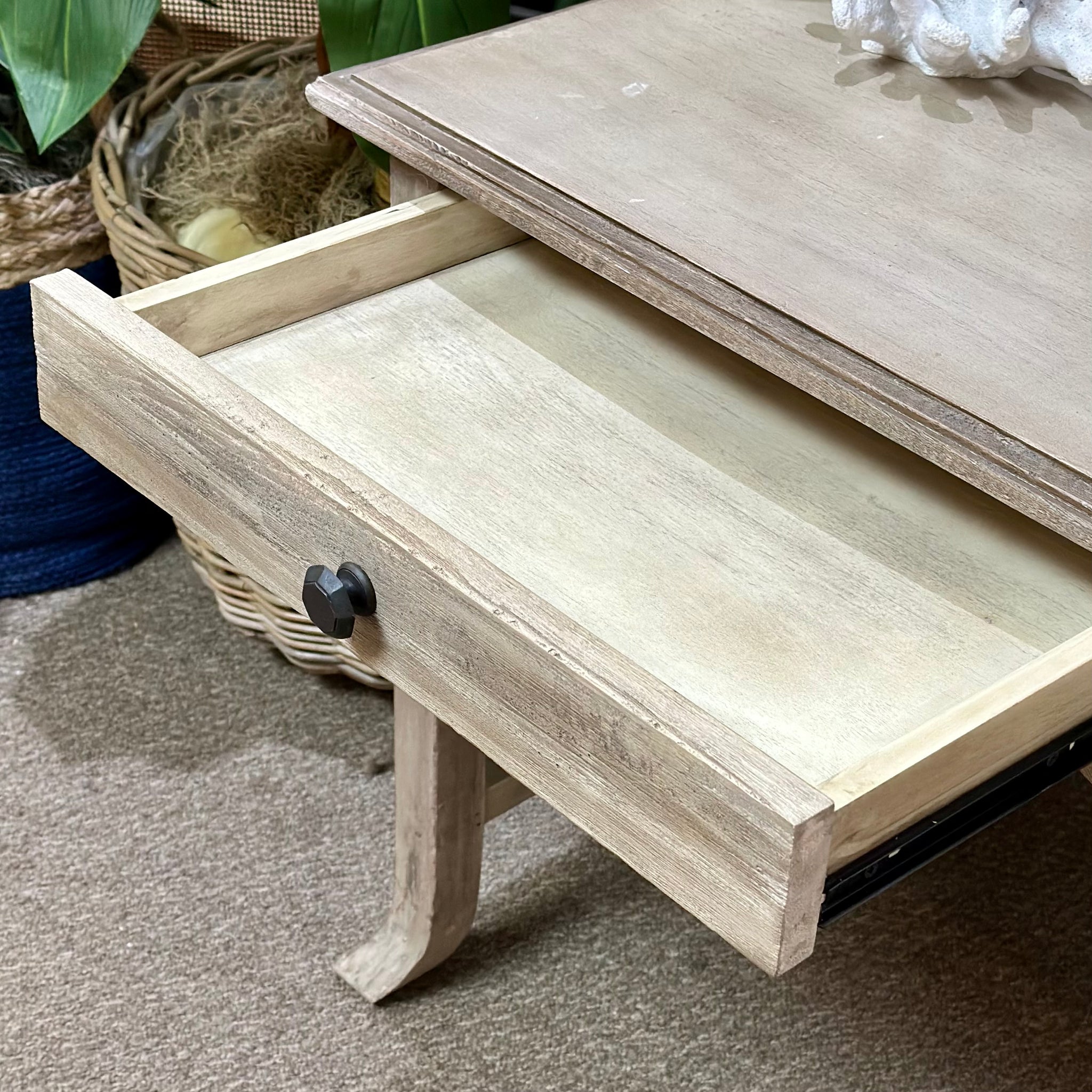 Upgrade your space with this handsome side table. Features one drawer, curved legs, and an aged white finish. In great condition.