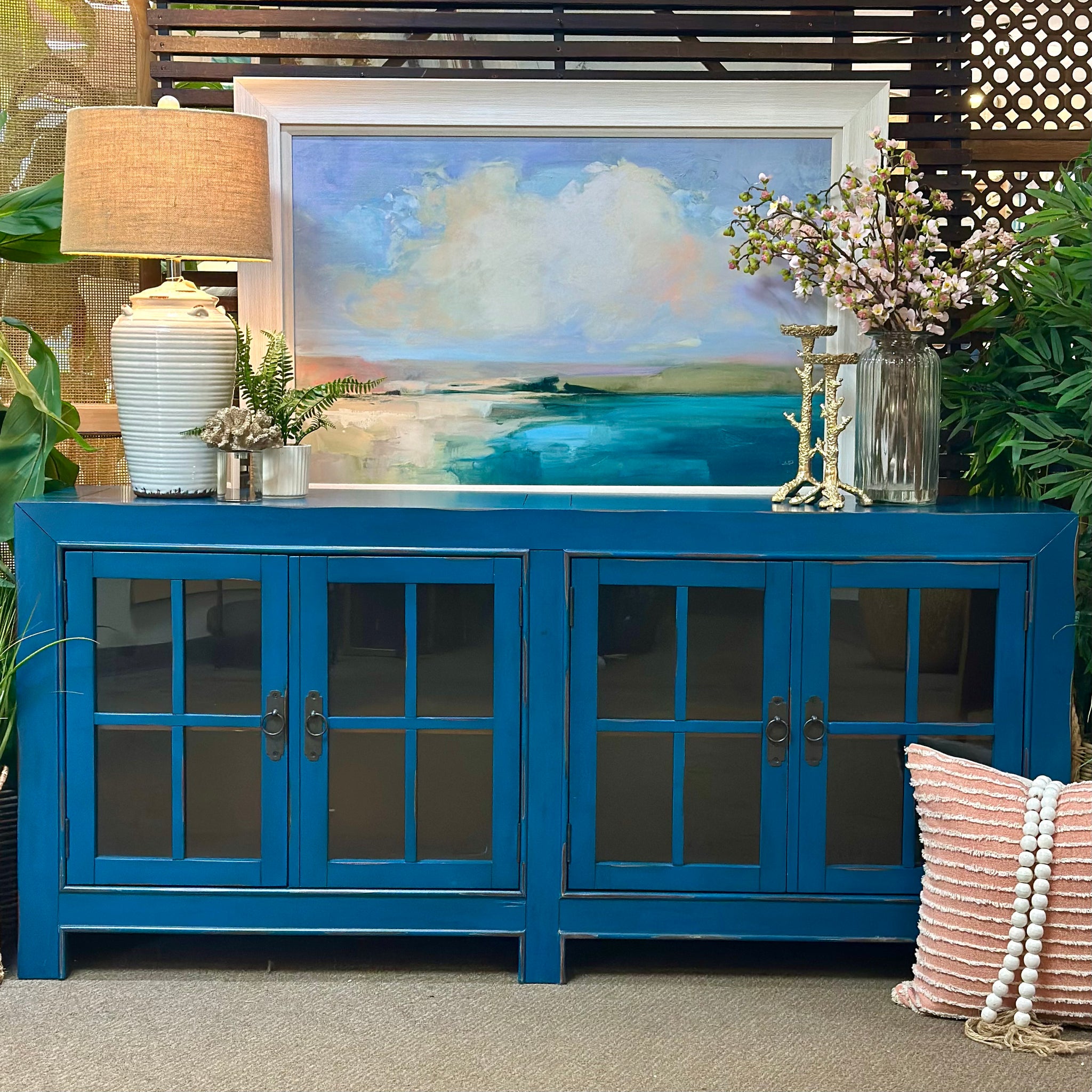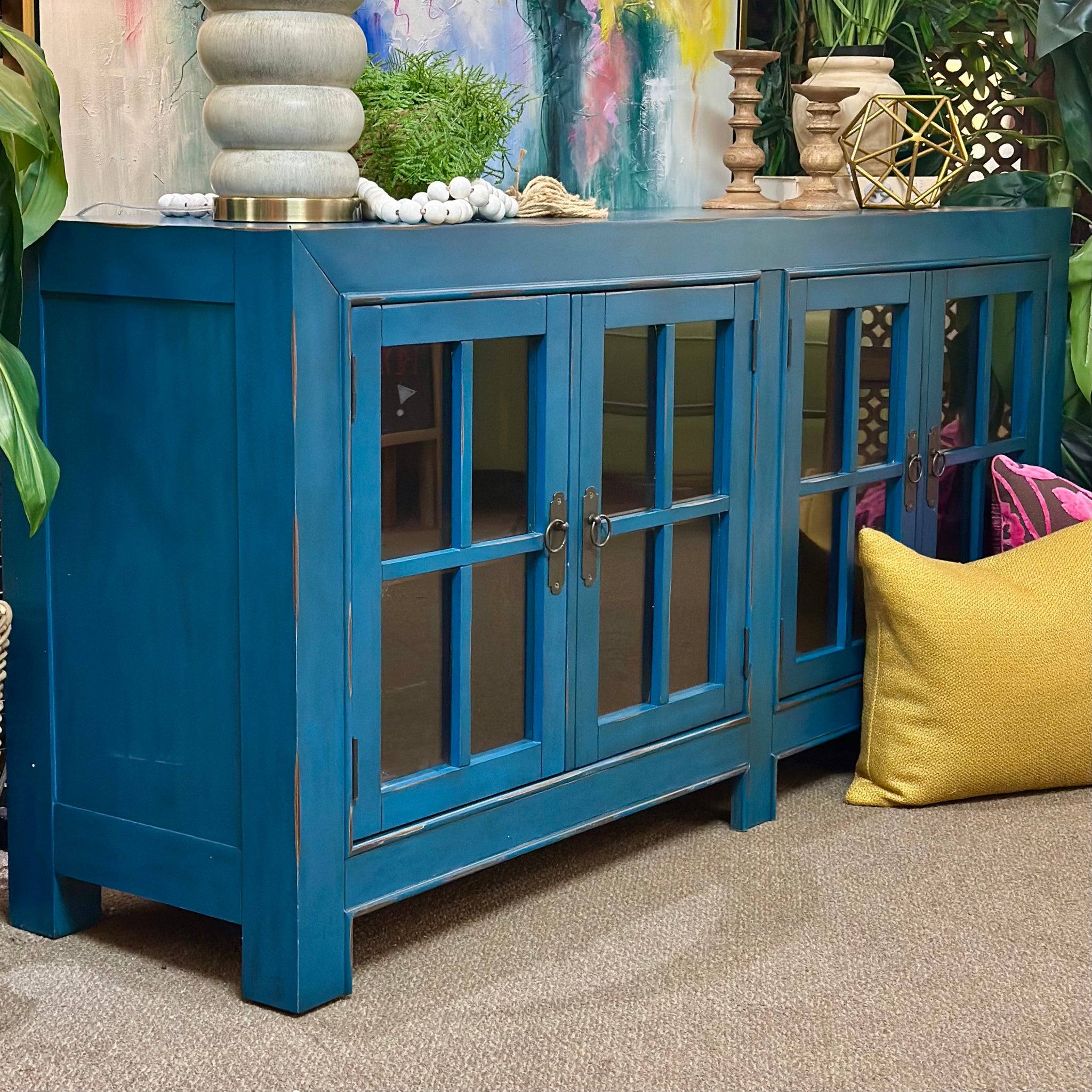 Beautiful and bright cabinet in a stunning cobalt blue painted finish! Features windowpane style glass front doors. Brand new and ready for it's new home.
