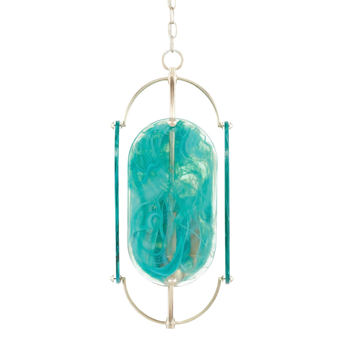 Upgrade your space with this gorgeous chandelier by Currey & Co. Features transparent glass planes with swirls of blue/green and wrought iron with a silver leaf finish. Retails for $1200+, our price less!