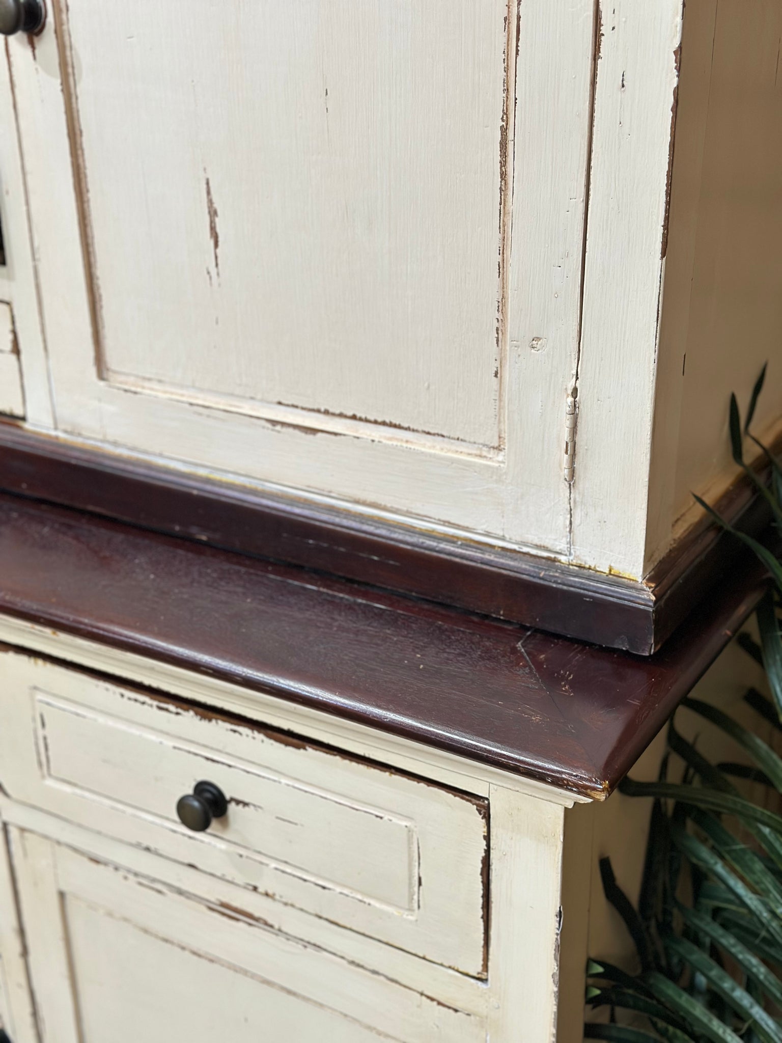 Needing extra kitchen storage? This two piece hutch is perfect featuring a TON of storage and distressed two-tone finish. On consignment and in good condition. Bottom cabinet has a door that has broken off the hinges. Fits snug into place when not in use. As shown on and off! Priced accordingly.