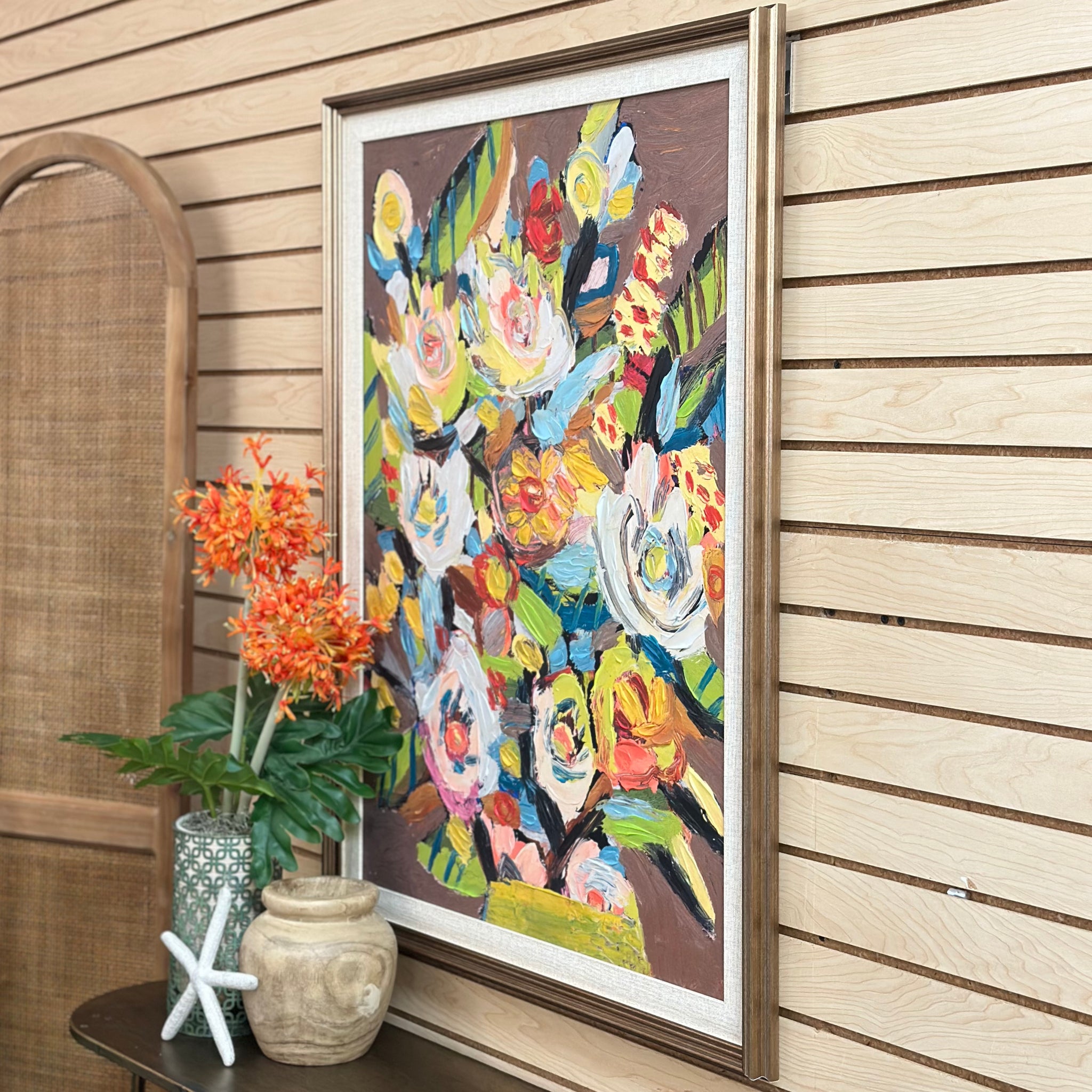 Beautiful hand painted floral art with gold frame; just in and brand new!