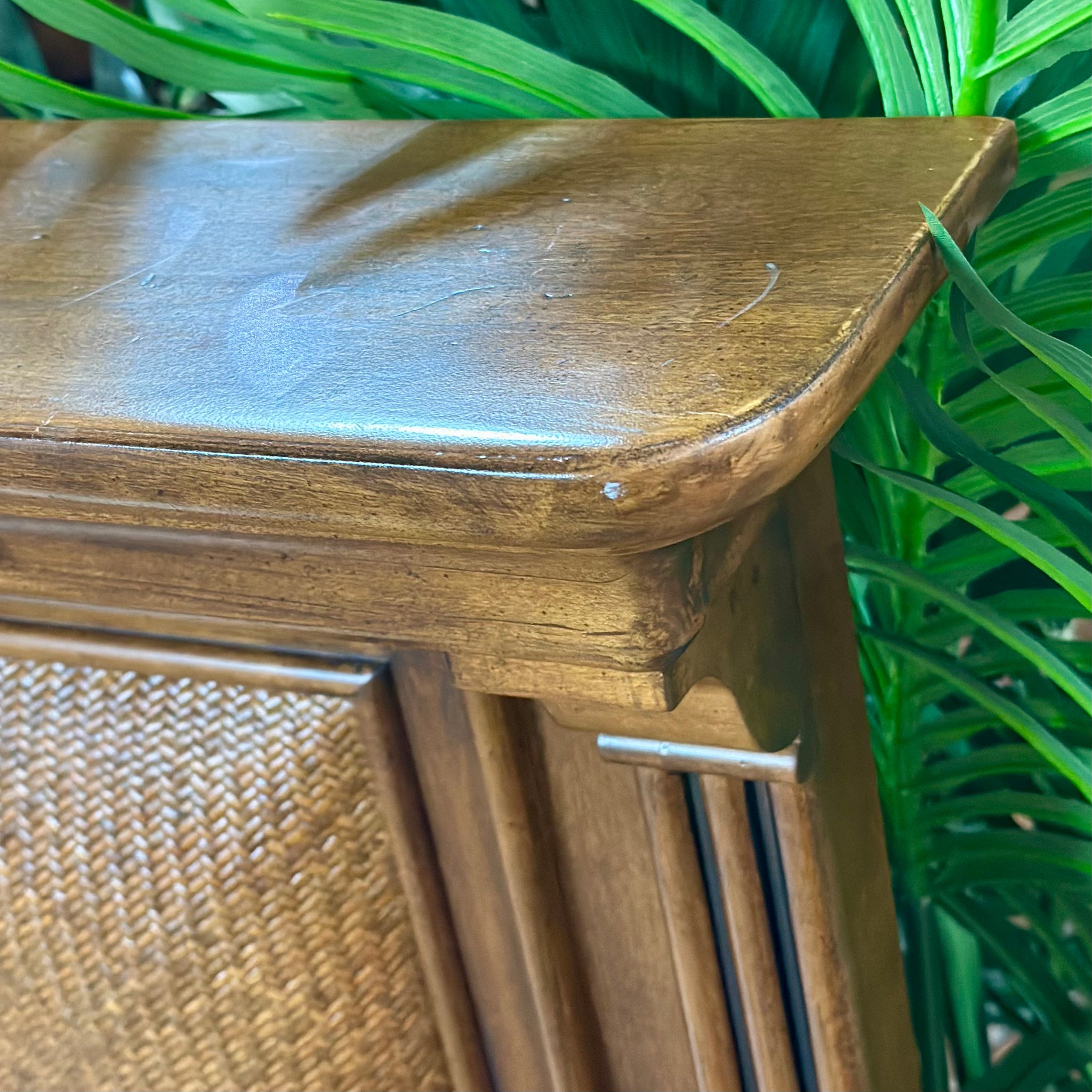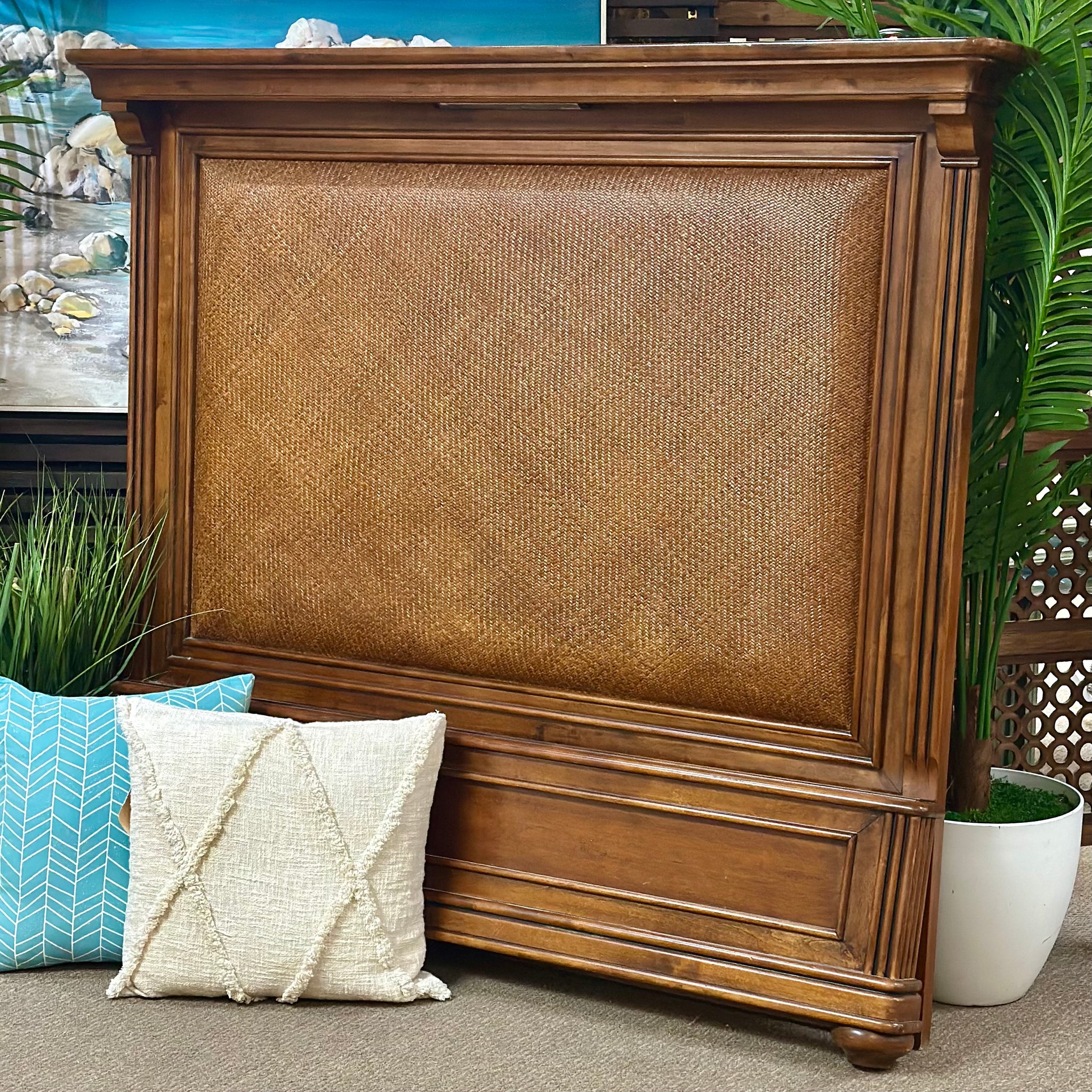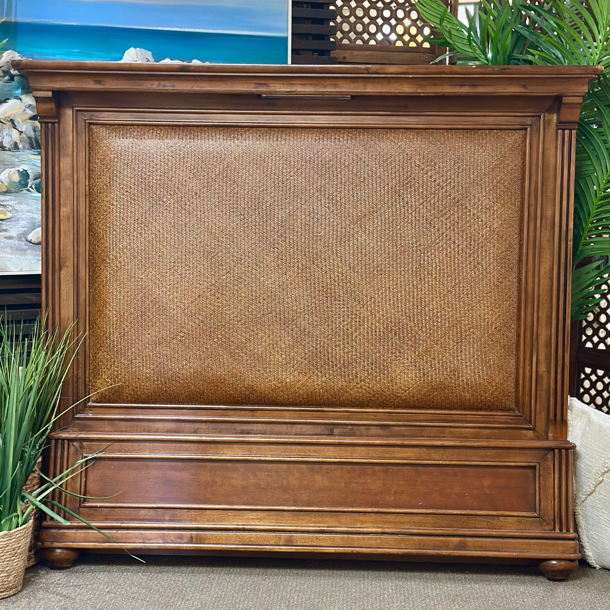 Handsome wood bed with woven inlay and a warm wood finish. On consignment and in great condition, sold as a head and footboard only.