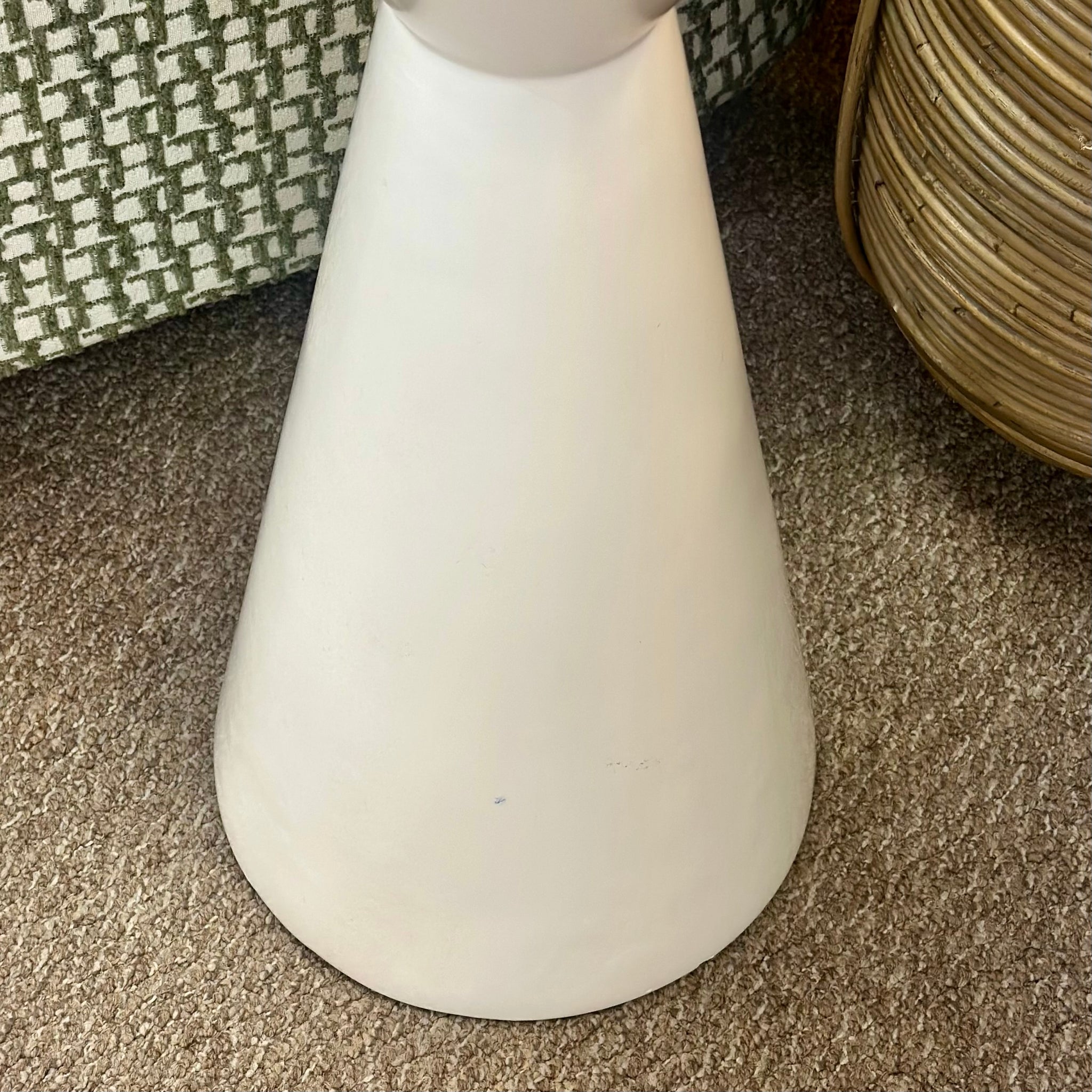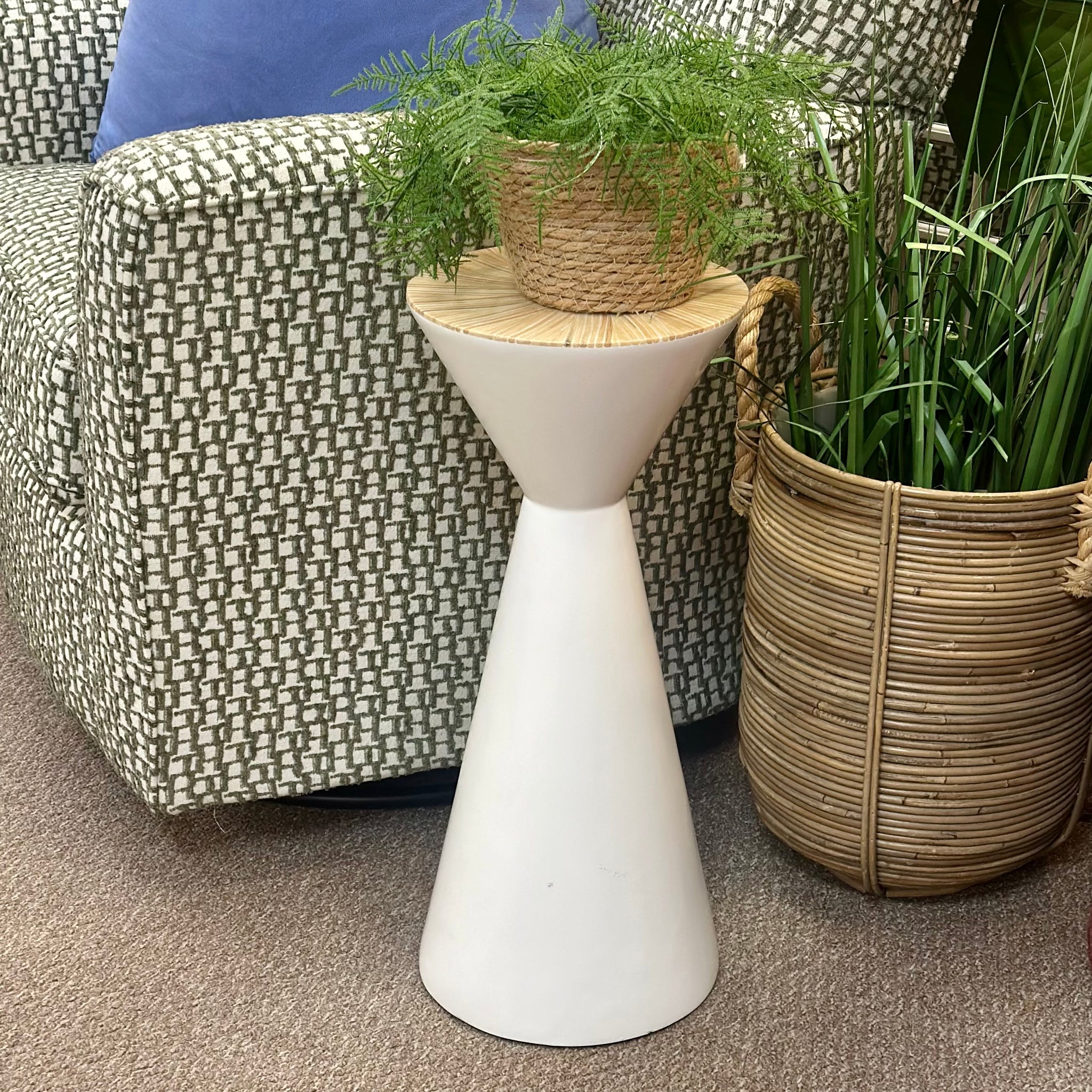 Super chic white drink table with stunning kaleidoscopic tabletop design crafted in a natural rattan and white colorway. See the 'Essie' table online for $503, our price less and in great condition!