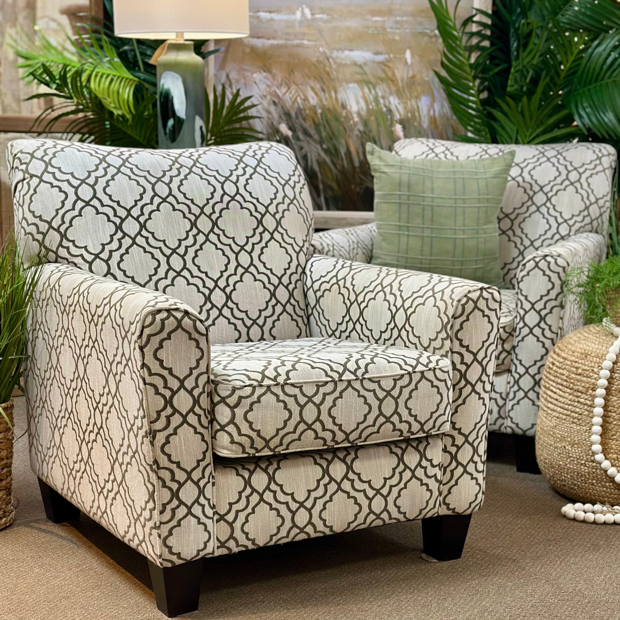 Club chair in a white and grey motif print. On consignment with some staining to the fabric, otherwise in good condition!