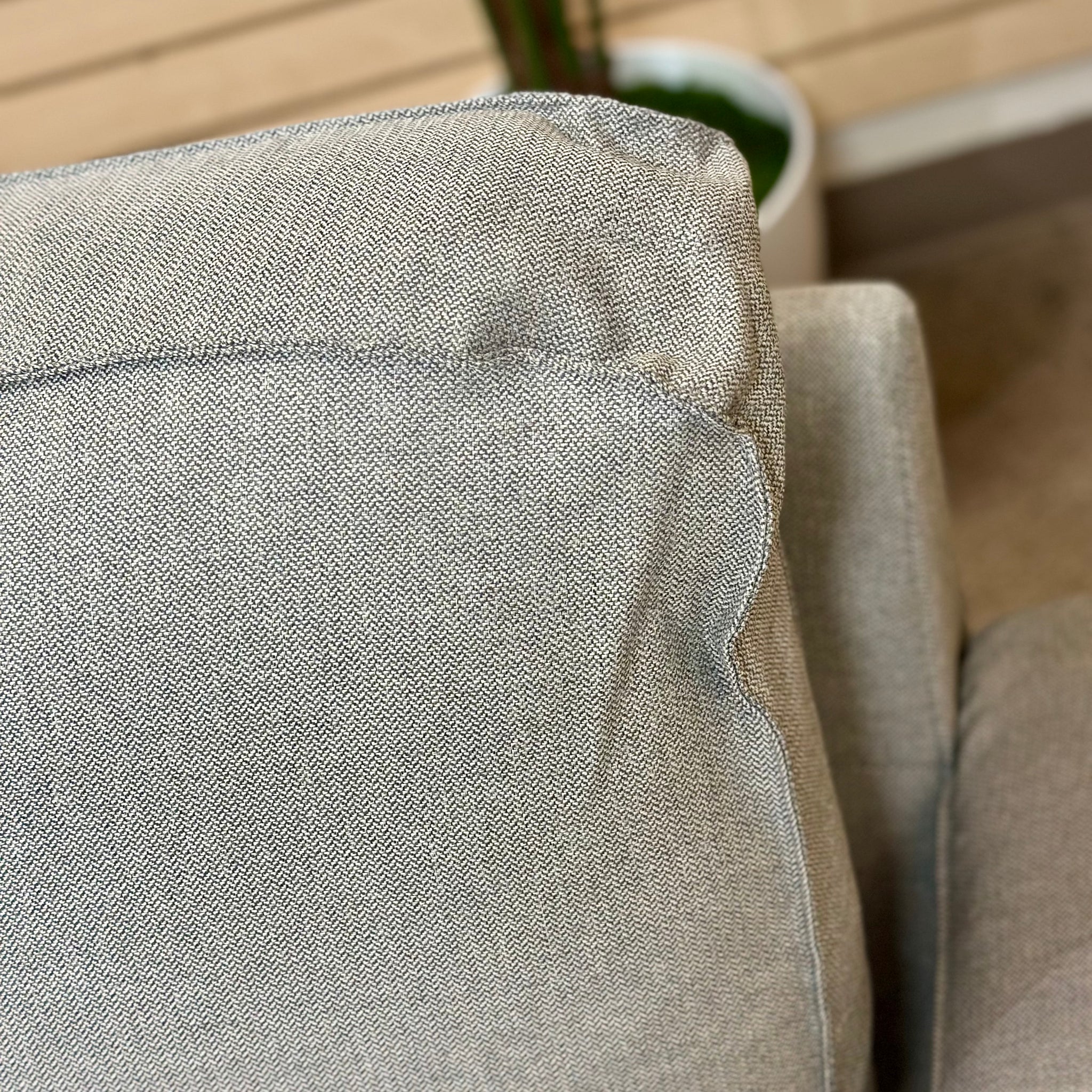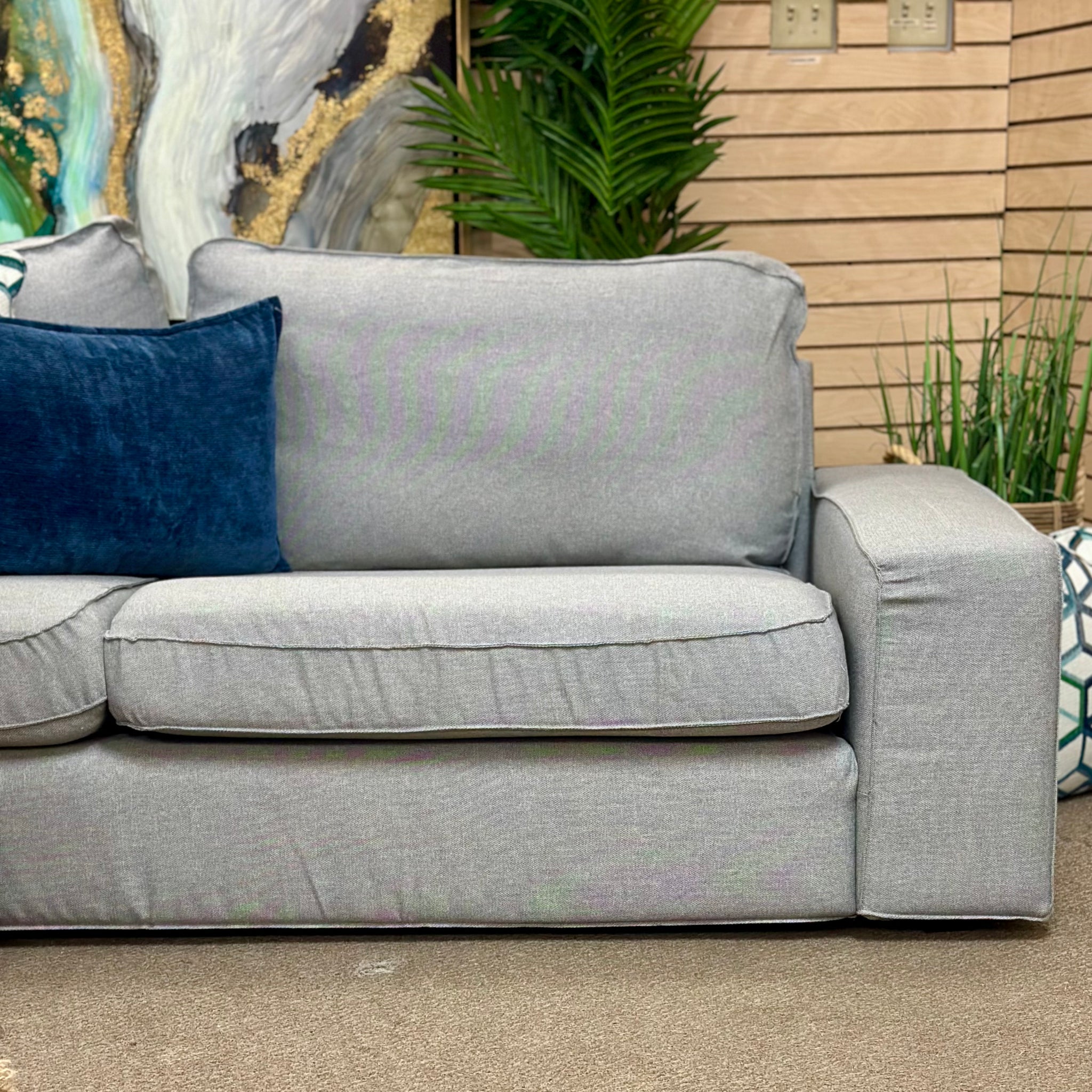 Add this handsome sofa to your living room, guest room or office. Features a simple clean look, track arms, loose cushions and a grey upholstery. In like new condition. Has brand new cover on. Retails for $850, our price less.